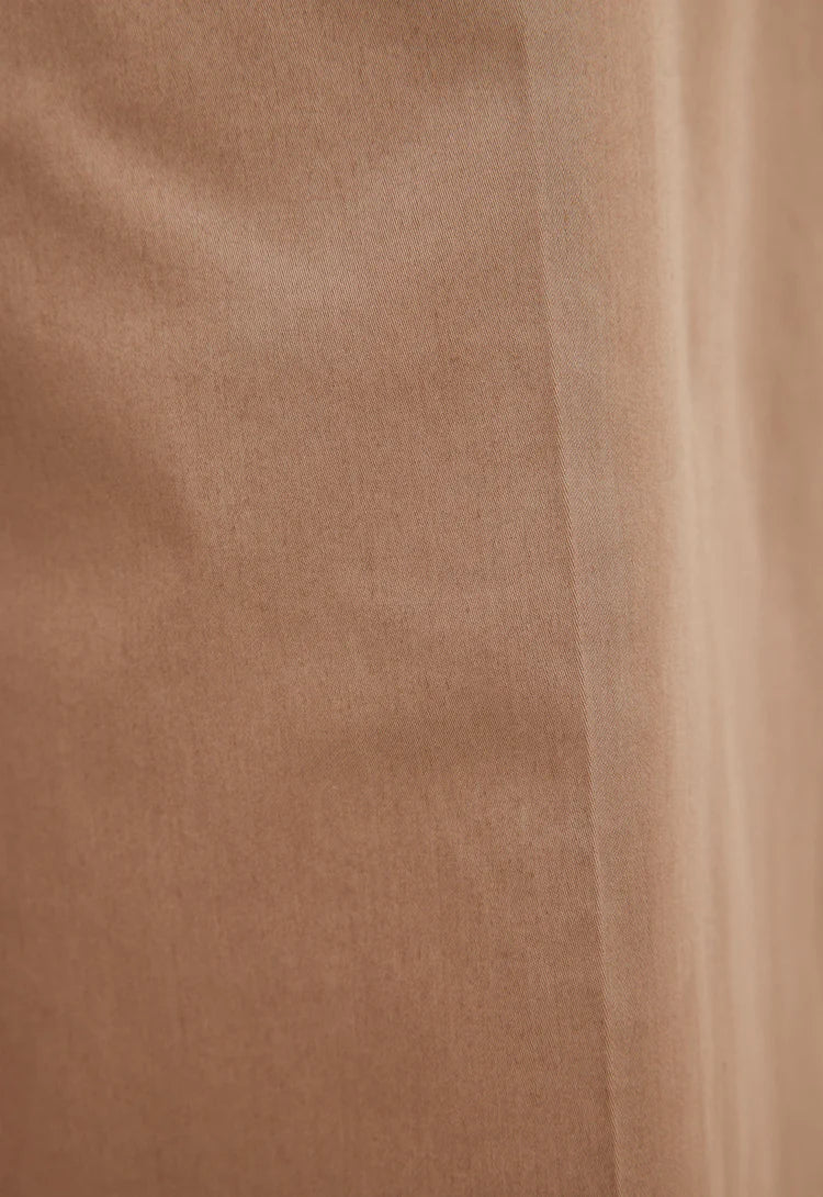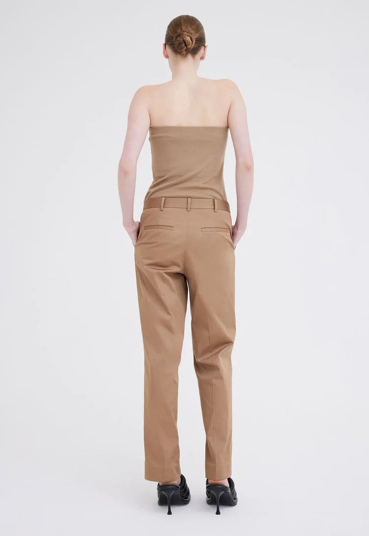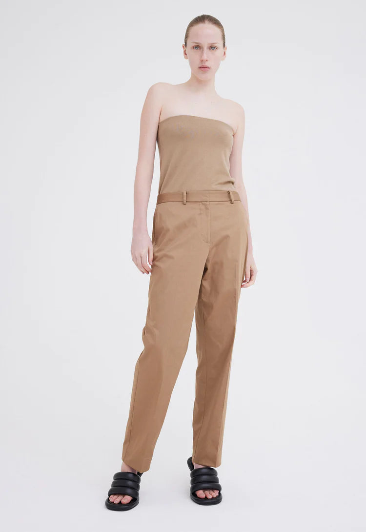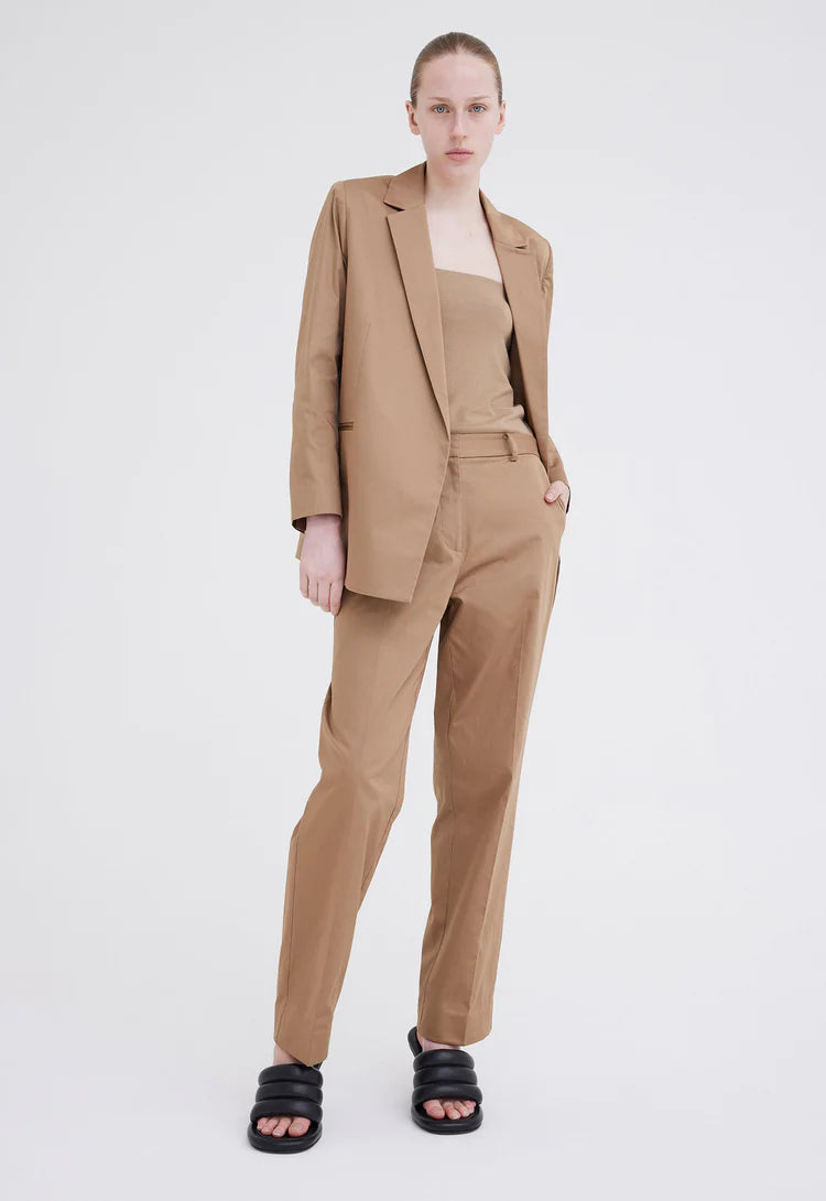 A relaxed suit pant with a modern appeal. These man style trousers are crafted from an Italian fine sateen suiting that is made from 100% cotton. With a low rise waist, flattering straight cut leg and tailored waist band, the compact weave sateen adds structure and sheen for a sharp approach to summer suiting.