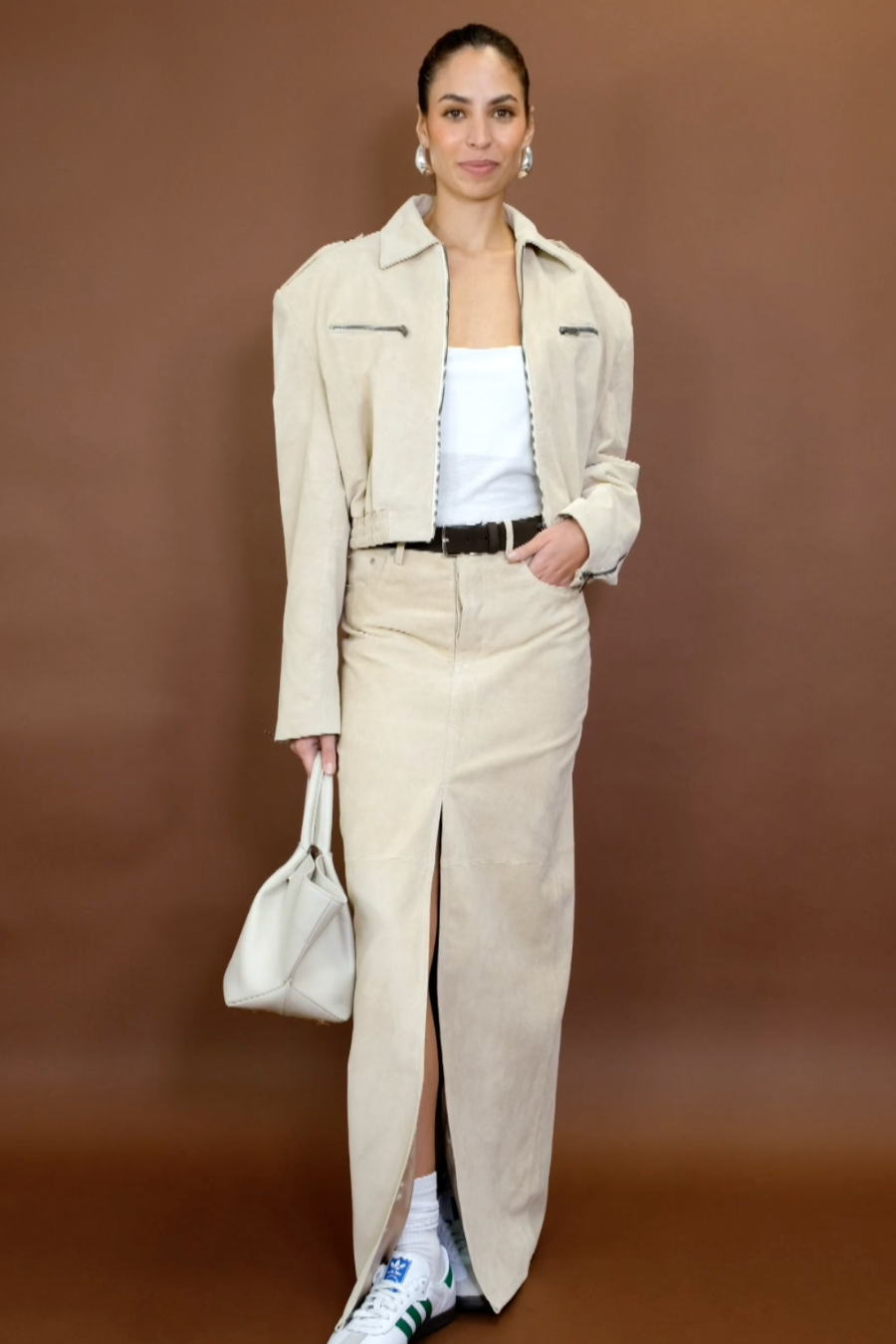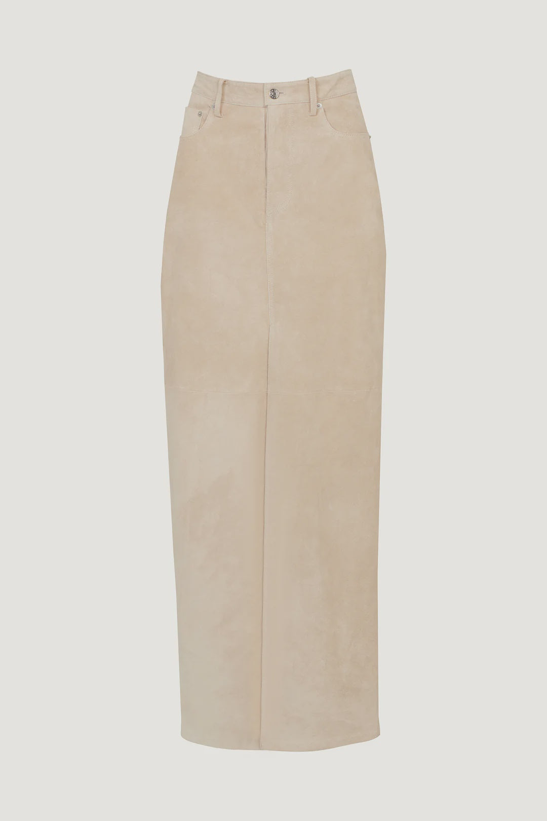 This luxurious maxi skirt will look incredible all year round, layered with a simple t-shirt or bra top in the summer and chunky knits in the winter. The extra-long length makes it feel super elegant and we love the denim style details and generous front slit for ease of movement and a glimpse of leg.