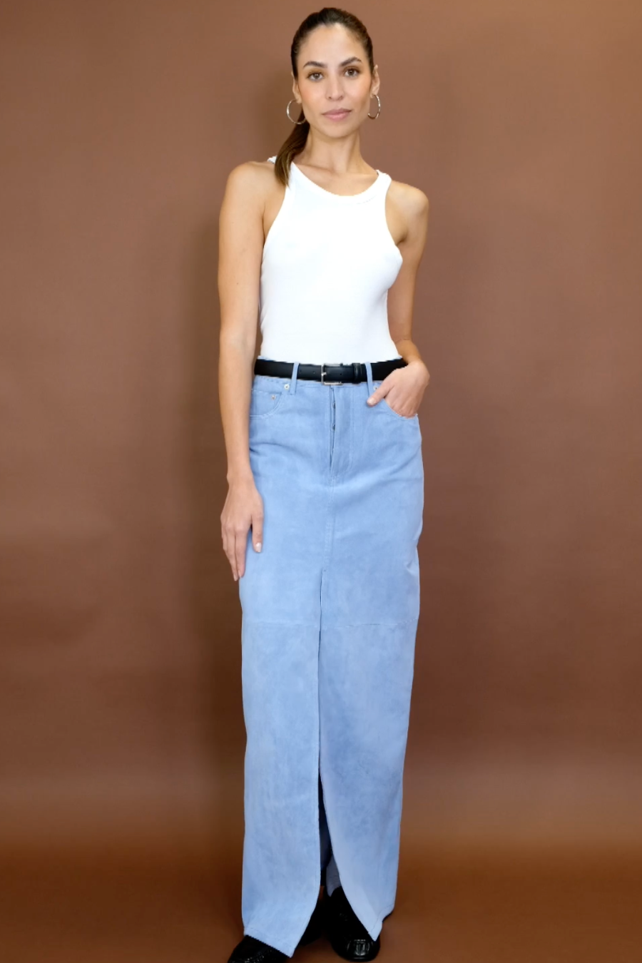 This luxurious maxi skirt will look incredible all year round, layered with a simple t-shirt or bra top in the summer and chunky knits in the winter. The extra-long length makes it feel super elegant and we love the denim style details and generous front slit for ease of movement and a glimpse of leg.