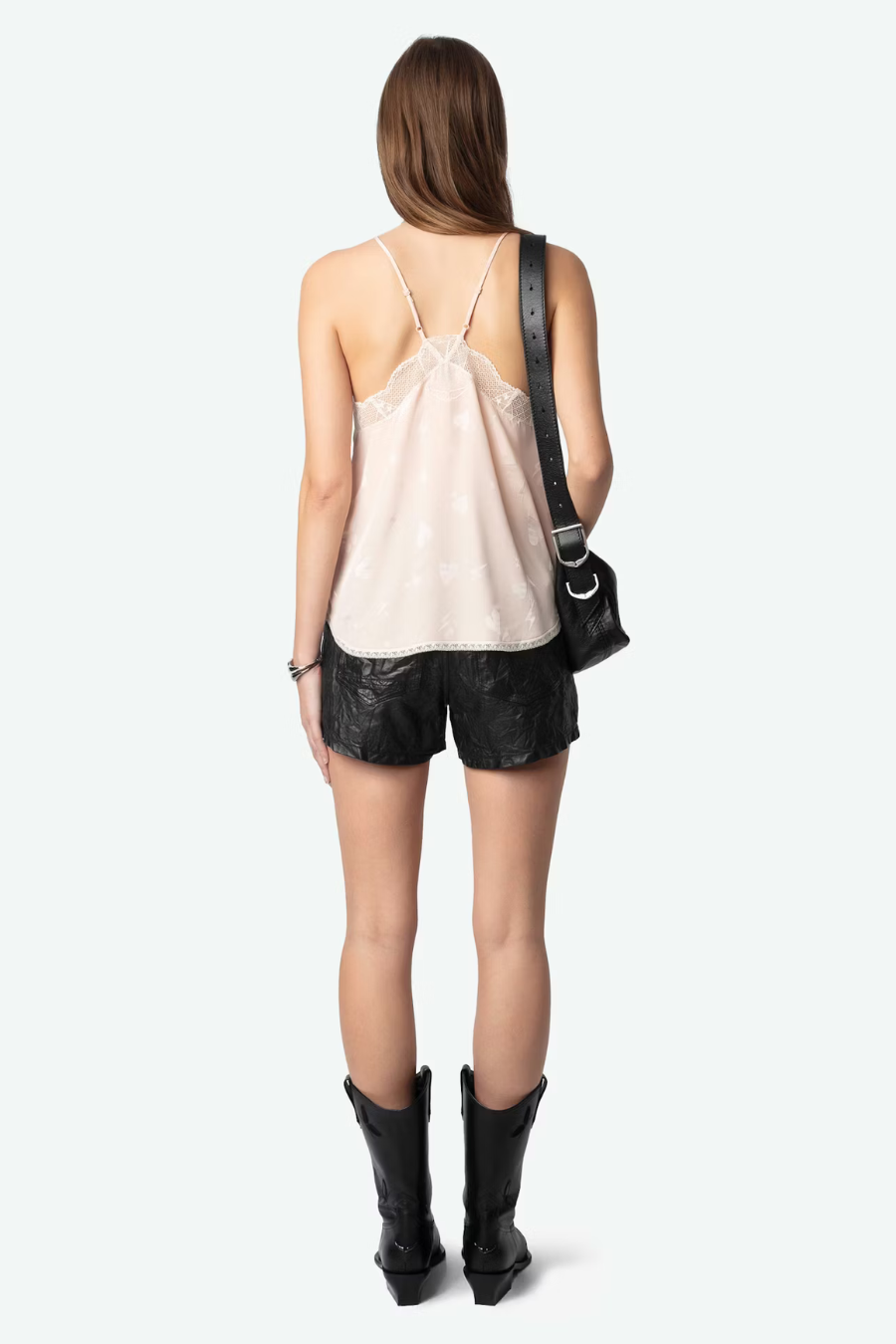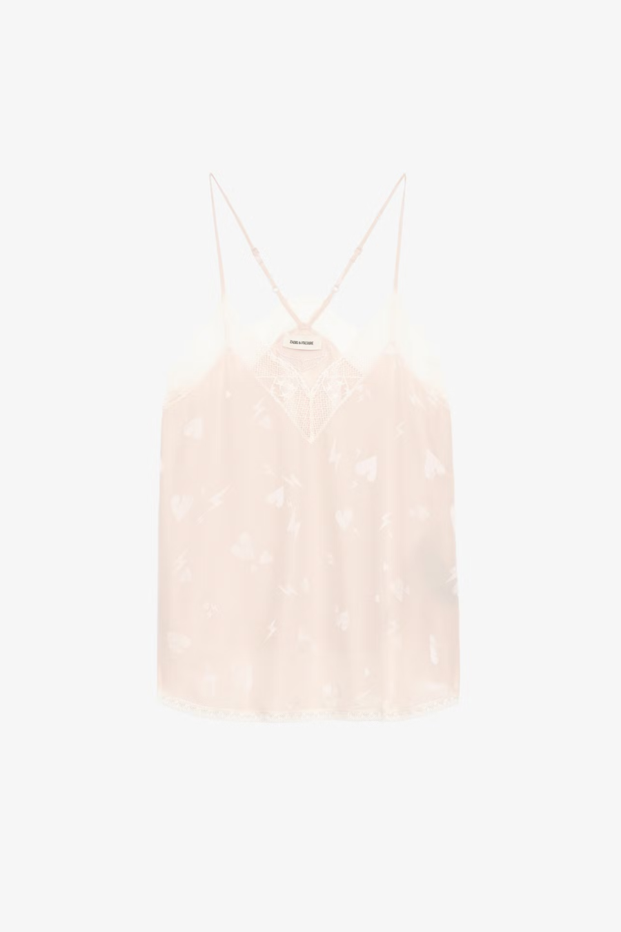 Lingerie-style camisole with Flash Hearts print, thin straps and lace-trimmed neckline.