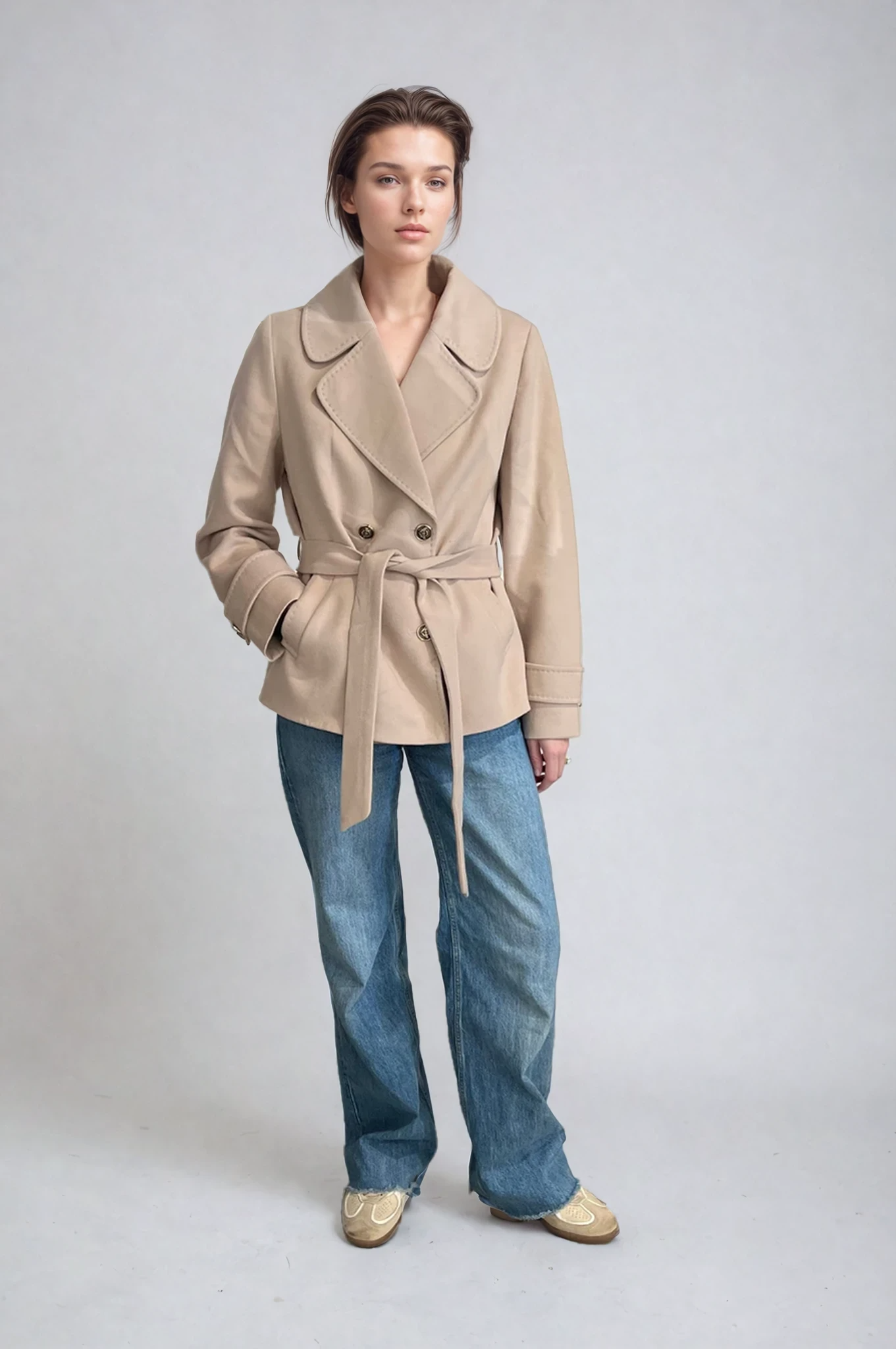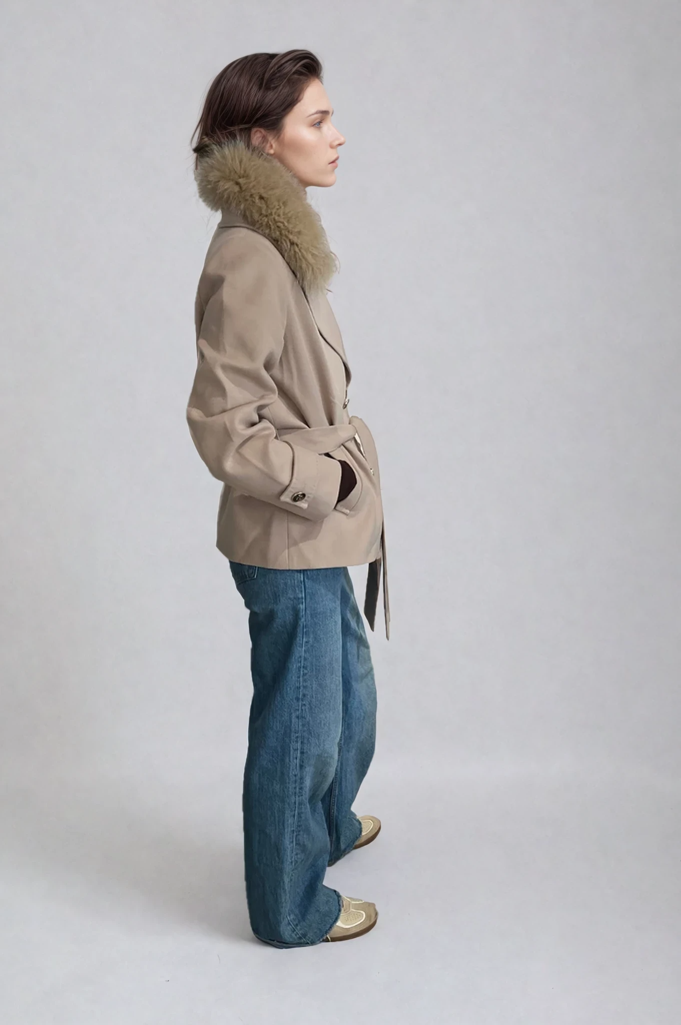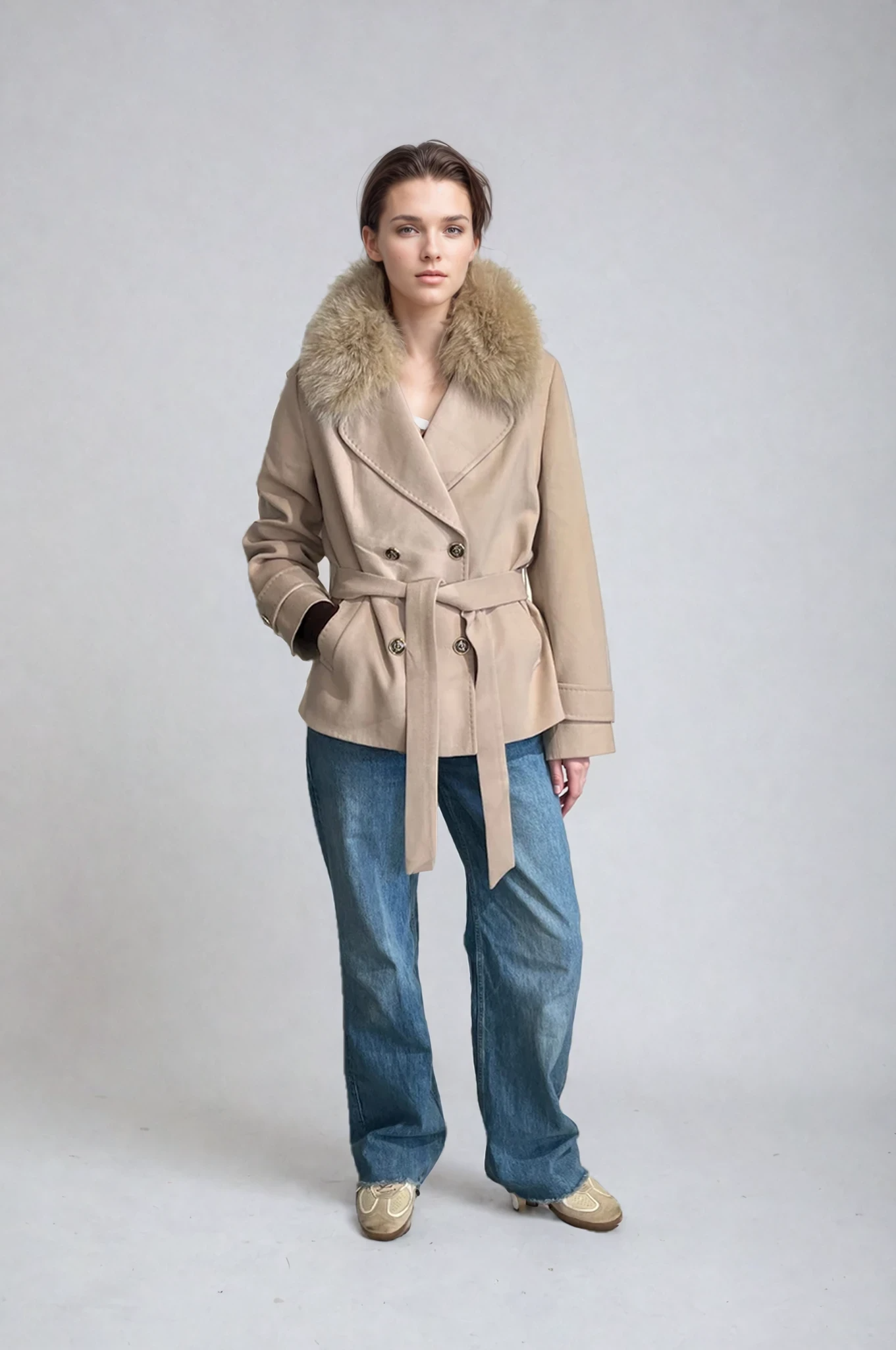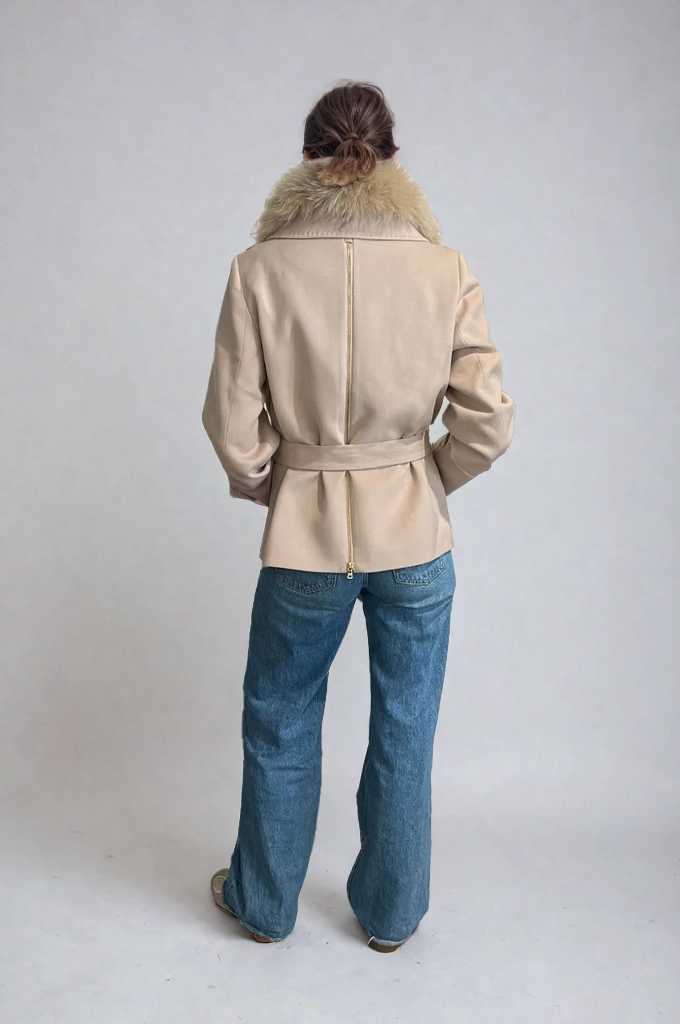 Refined and versatile, this Deval coat is cut from a premium cashmere-wool blend for a soft, structured drape. The tailored silhouette features a classic double-breasted front, a flattering self-tie belt, a functional gold zip running down the back, welt pockets for an elevated finish. A detachable fur collar adds warmth and luxury. Elegant yet practical, this timeless piece is a modern wardrobe essential with enduring appeal.