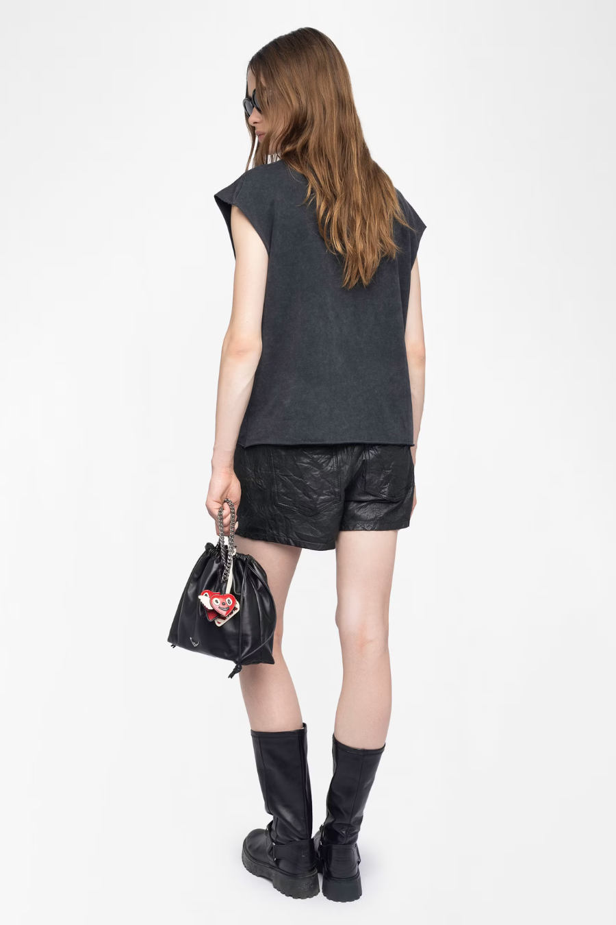 A bold wardrobe essential with signature rock 'n' roll attitude. This washed black tee features a relaxed, slightly boxy silhouette with raw-edge cap sleeves and a classic crew neckline. The standout skull graphic is embellished with metallic studs, forming the Zadig & Voltaire logo for a striking finish. Pair it with denim or leather for effortless edge.