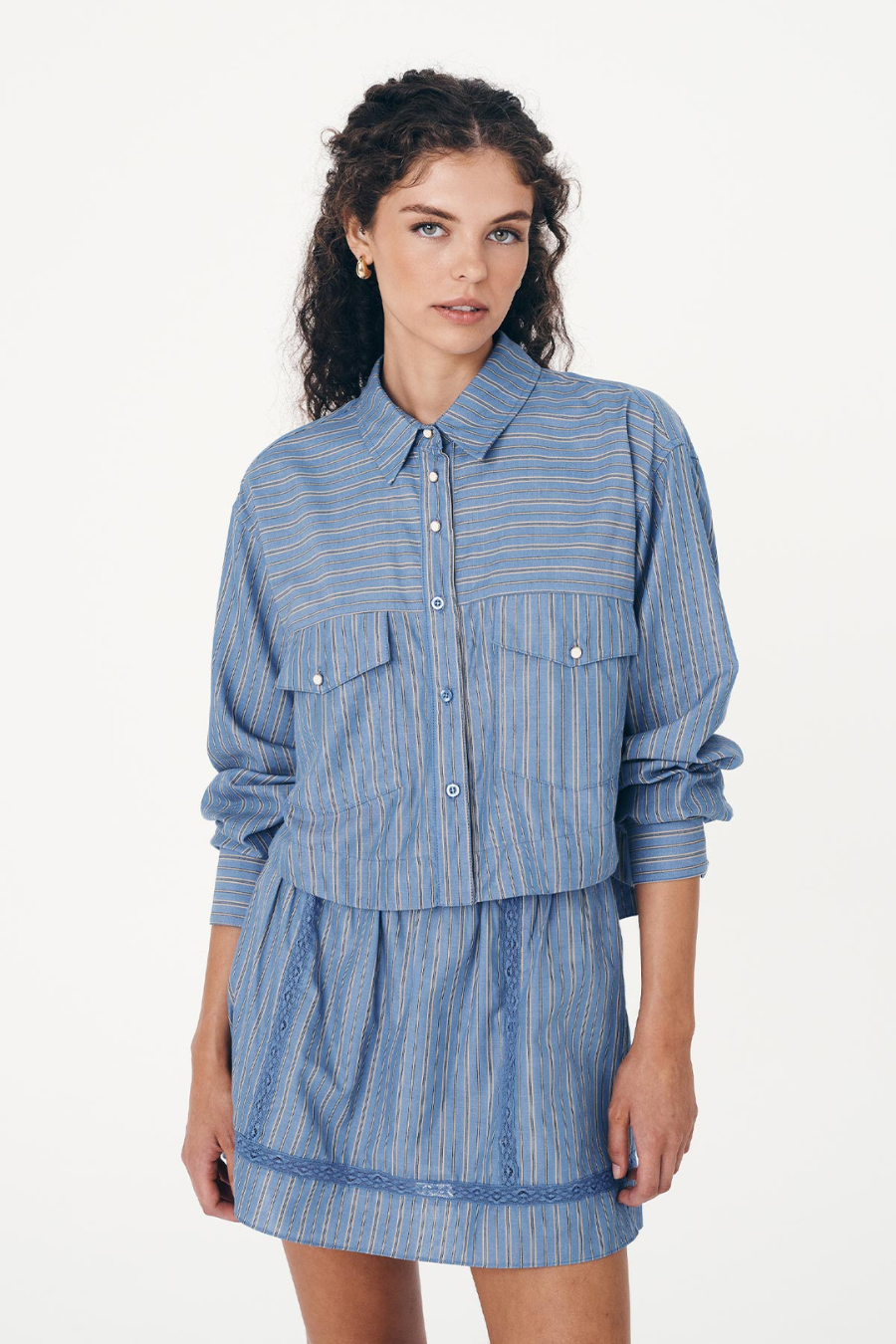 Cropped with intention, the Cole Shirt in lagoon-blue stripes balances structure and ease. Boxy lines, front pockets, and a sharp collar.