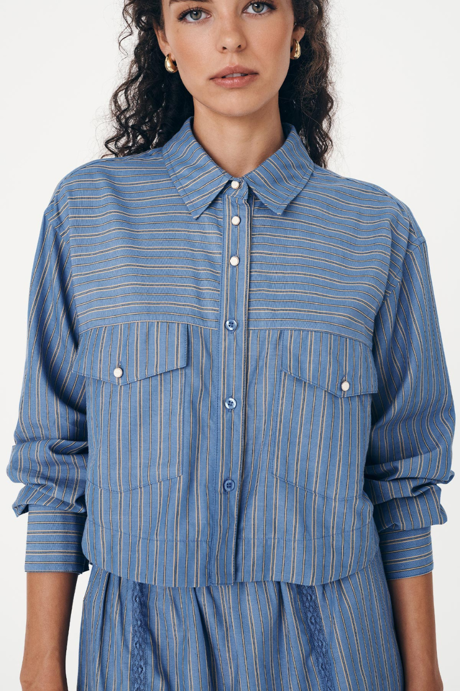 Cropped button-up stripe shirt Relaxed fit with yoke design lines Funtional front pockets Curved hem and full-length sleeves Faux pearl and dyed-to-match buttons.