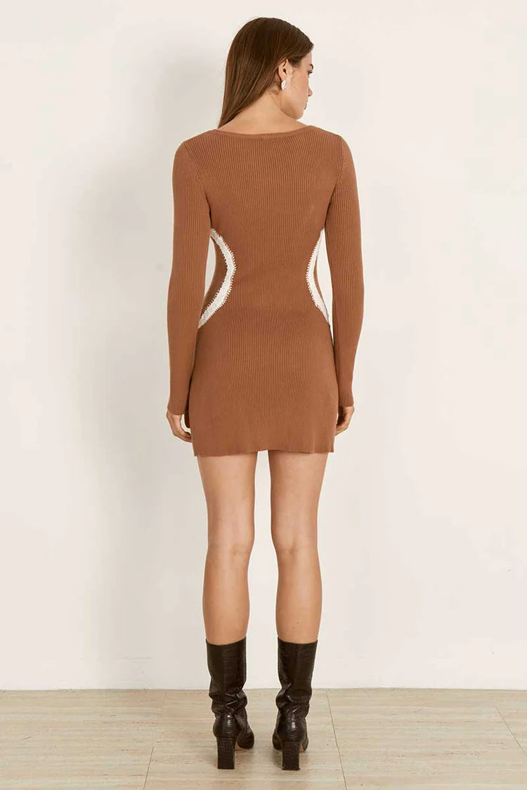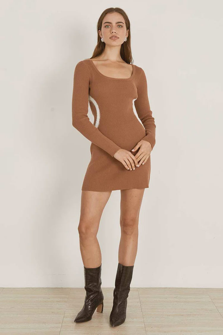The connect knit mini dress crafted from a rib knit fabrication. Featuring a fitted silhouette with contrasting side bodice panels.