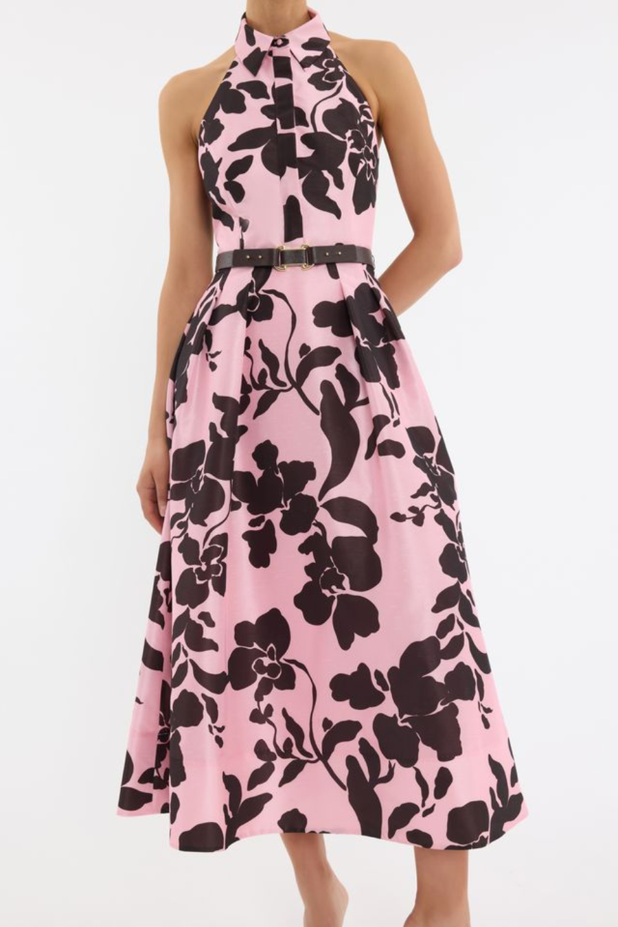 The Connie Halter Midi Dress seamlessly blends refined sophistication with a playful floral print in pink and chocolate hues. Highlighting a collared halter neckline, its fitted bodice is detailed with princess seams for a polished finish, complemented by the low open back for added style. Its circular midi skirt shapes an elegant silhouette, cinched at the waist by a PU belt with a gold buckle. Lined and secured with a zip fastening at the back, this dress is a versatile choice for both day and night occasions.