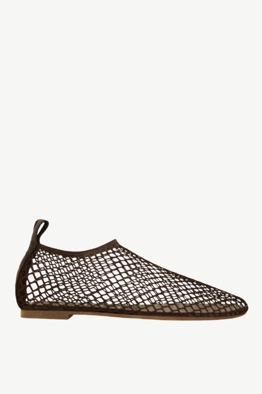 Dark brown netting fabric high cut ballet flat featuring a round toe and an elasticated throat.