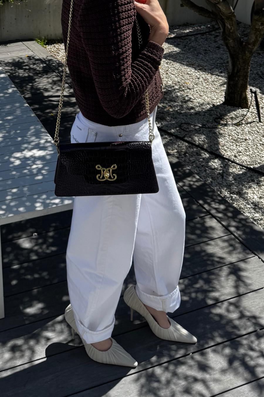 Wear it as a shoulder bag with its metal chain, or effortlessly transform it into a refined clutch for events and special moments. Crafted from soft leather, it blends functionality and style with a striking design.