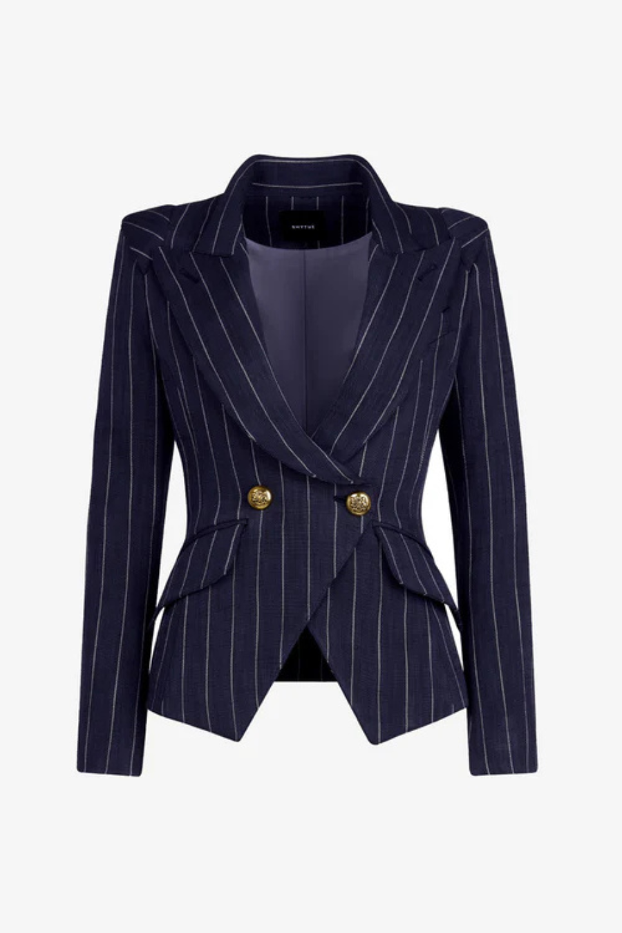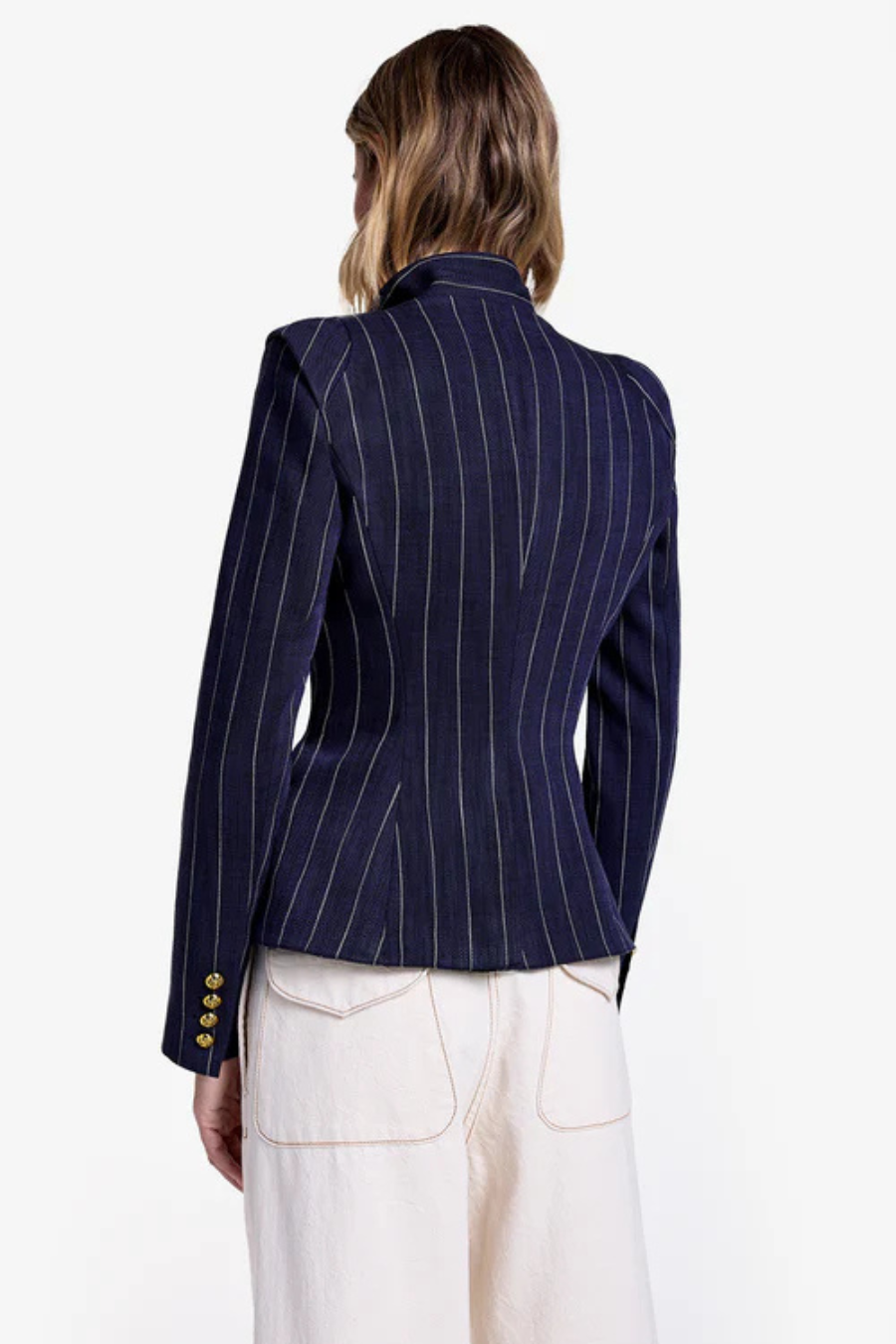 Closely tailored and the evolution of the original crossover blazer, this double-breasted silhouette features a lightly padded shoulder flange and signature brass hardware. The back collar is designed to be permanently “popped” and should not be folded over. Curvy figures may wish to go up a size
