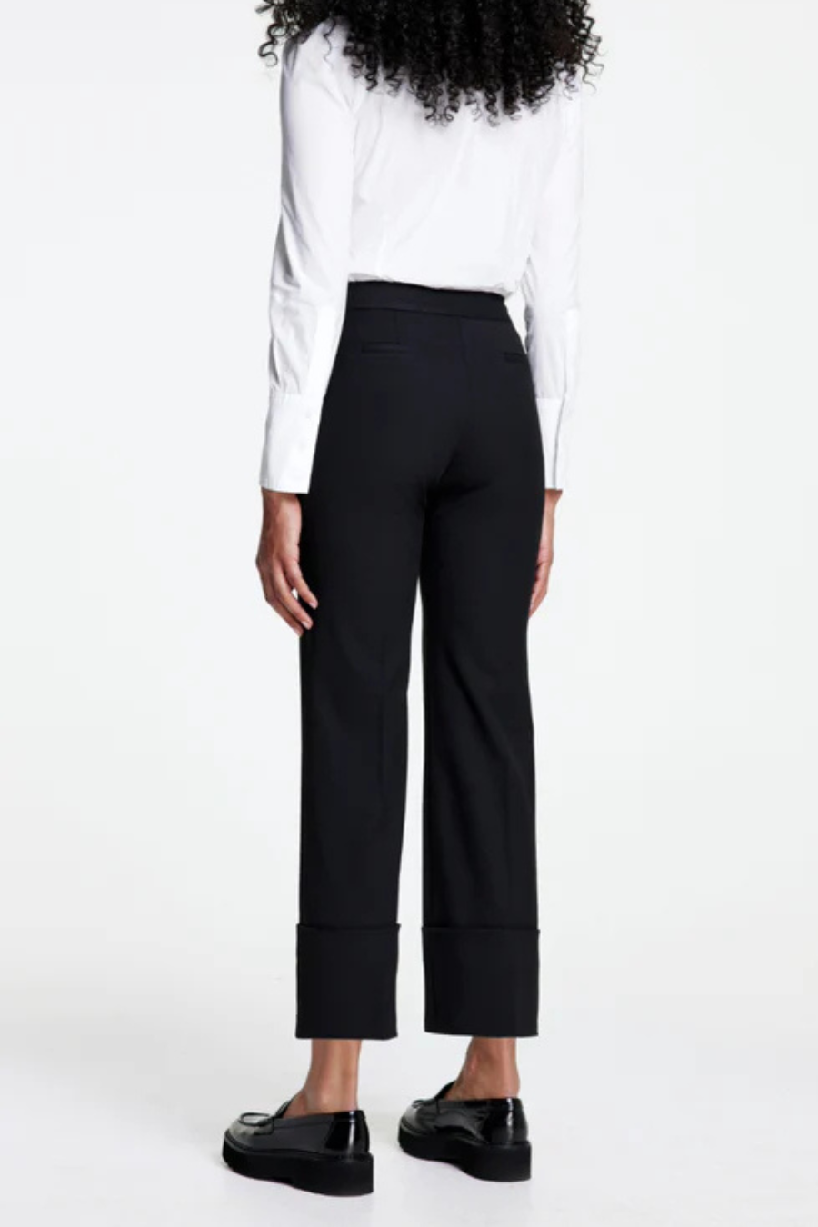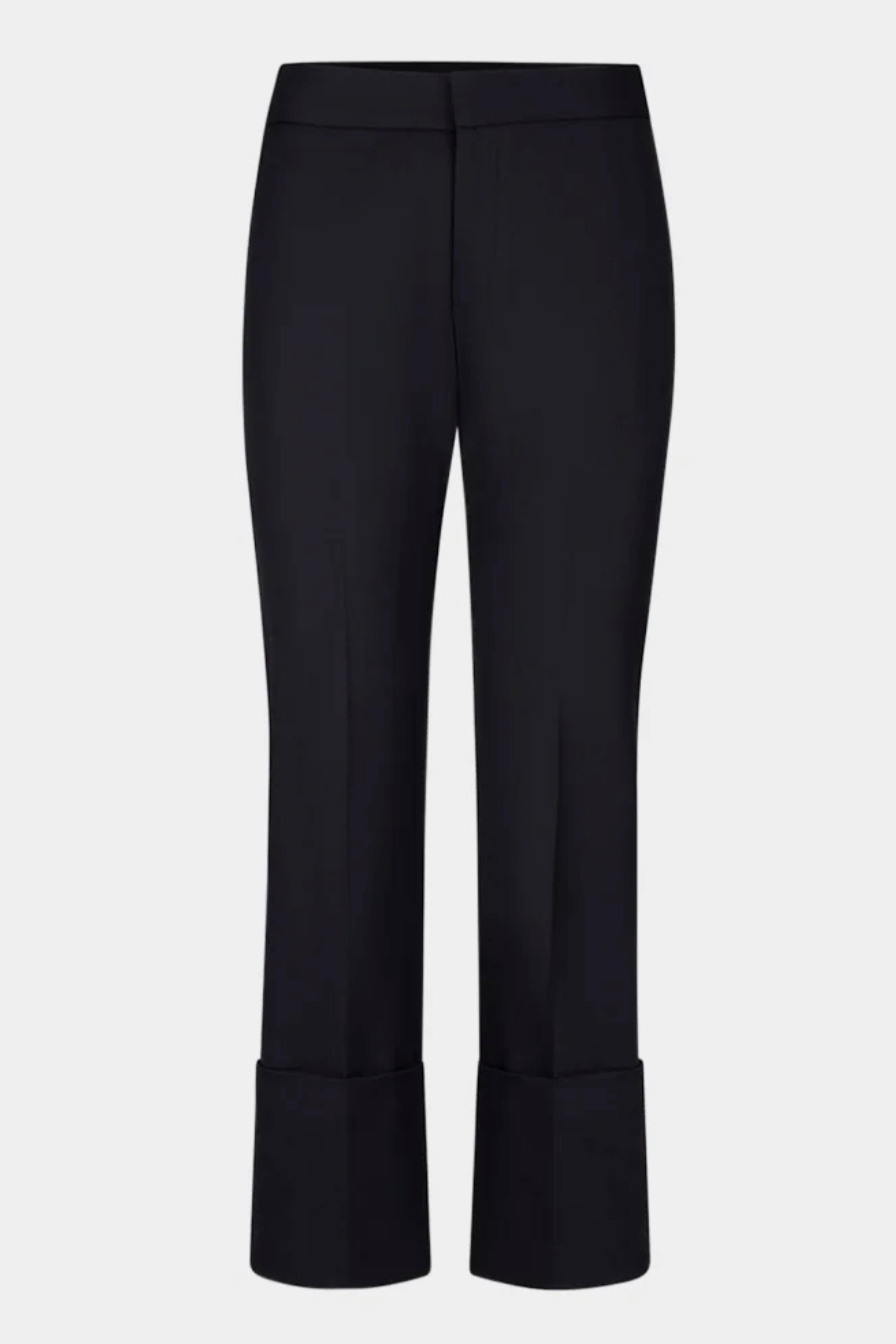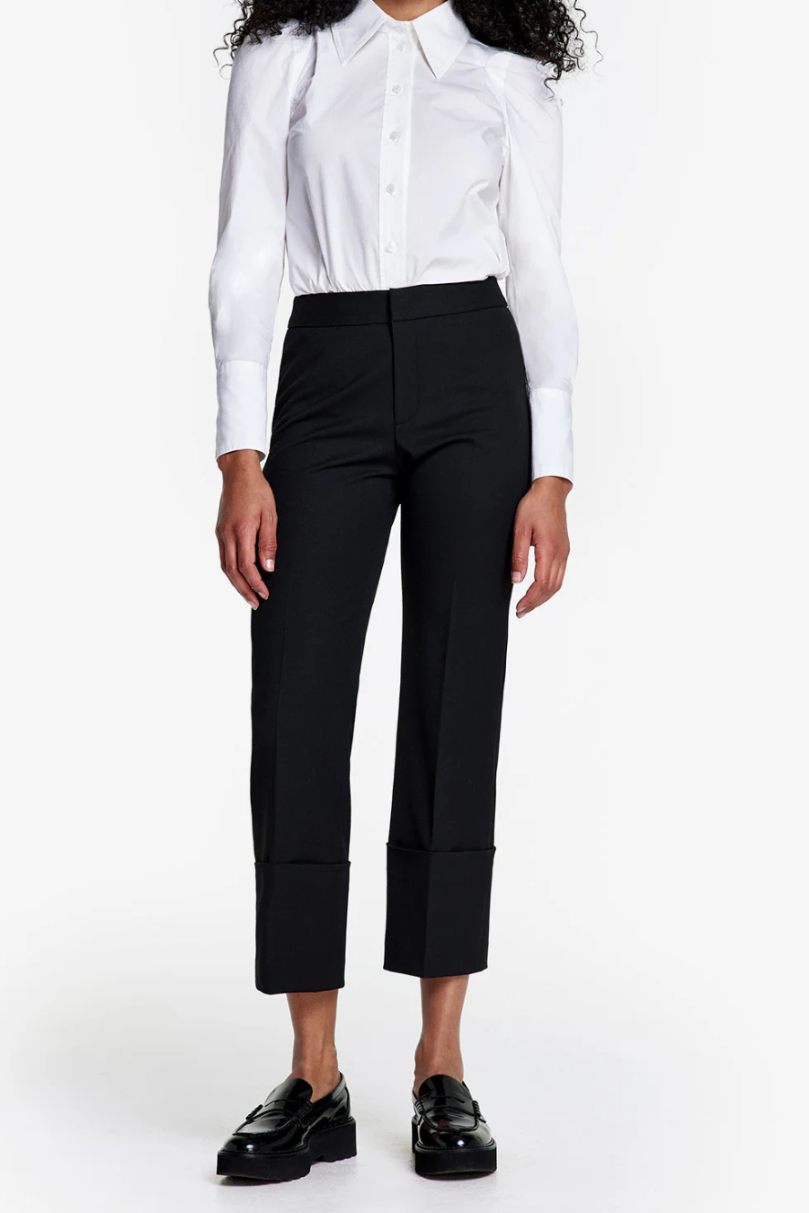 With its versatile mid-rise, this stretch silhouette is fitted through the waist and hips and features a straight cropped leg. Wide cuffed hems lend a directional edge.