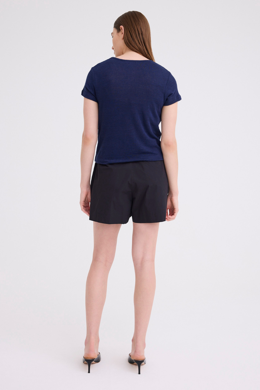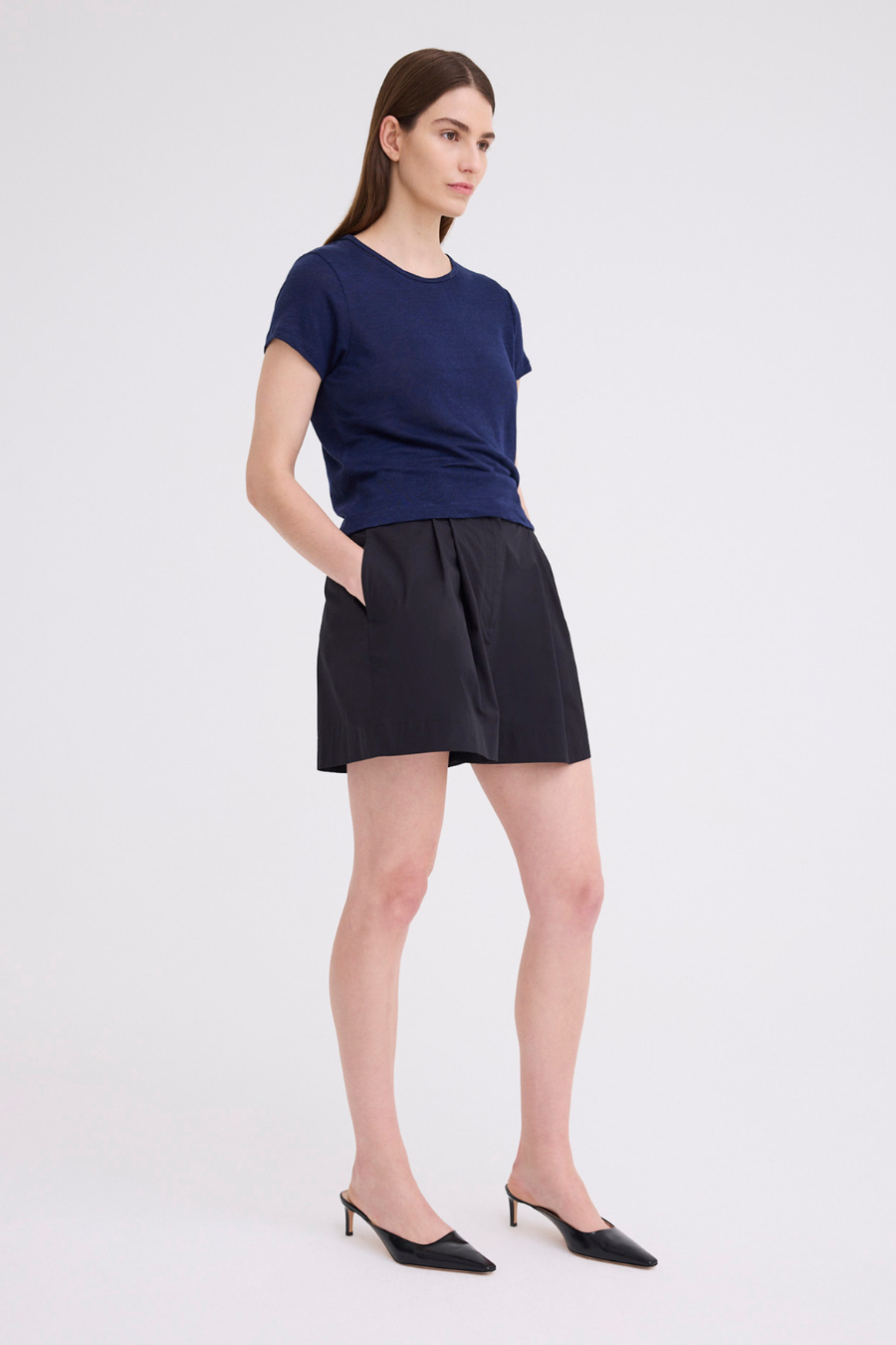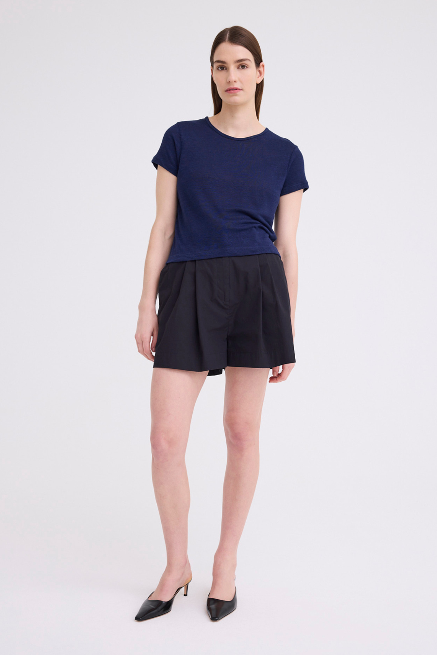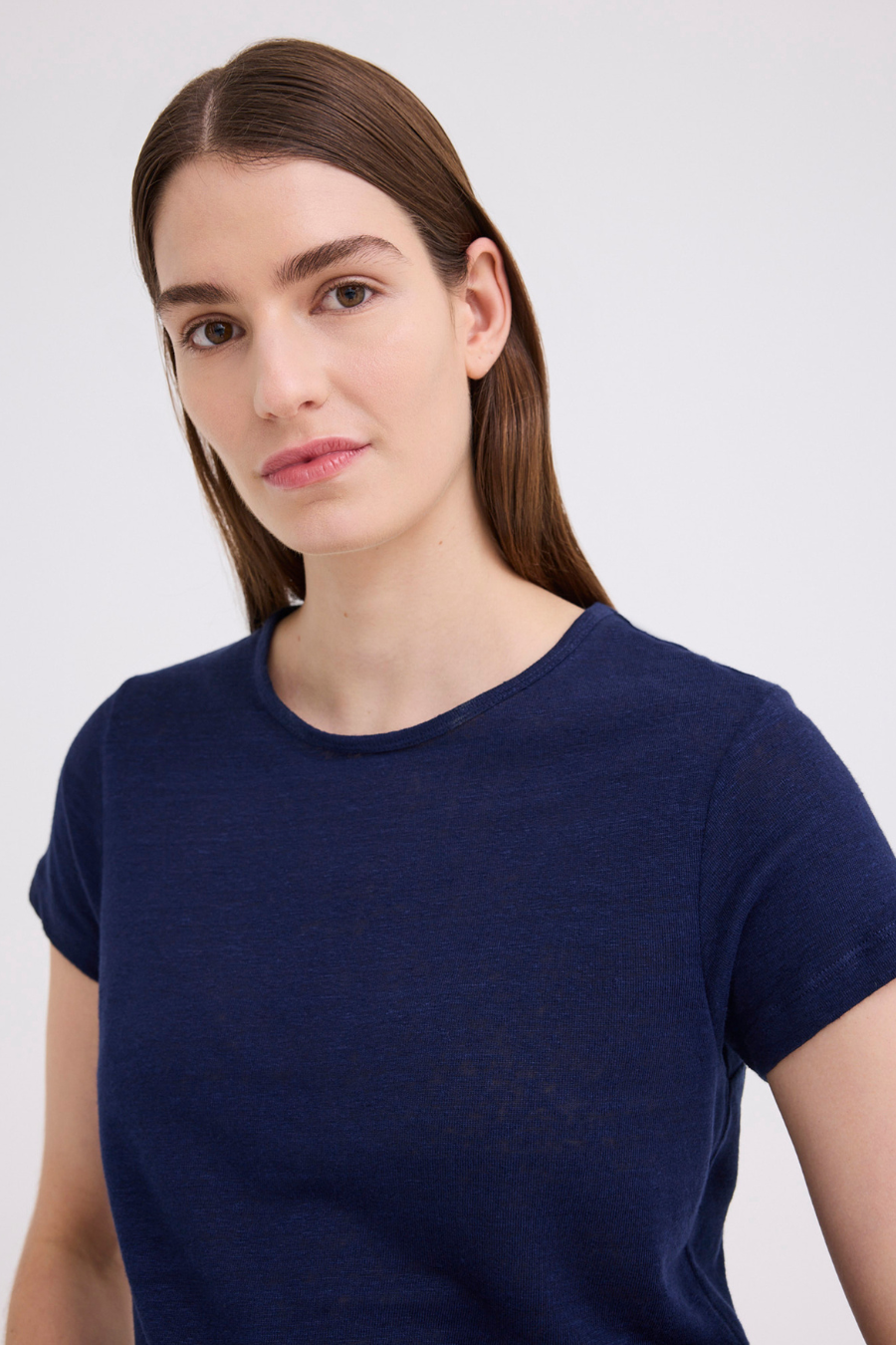 This linen tee is the essential every wardrobe needs. Cut from a soft yet weighty linen jersey in a petite cropped fit - this piece falls just past the waistline with a crew neck and capped sleeves. Contrast the silhouette with relaxed tailoring for an easy off duty look. This piece is designed for a neat fit. For a more relaxed look take the next size up.