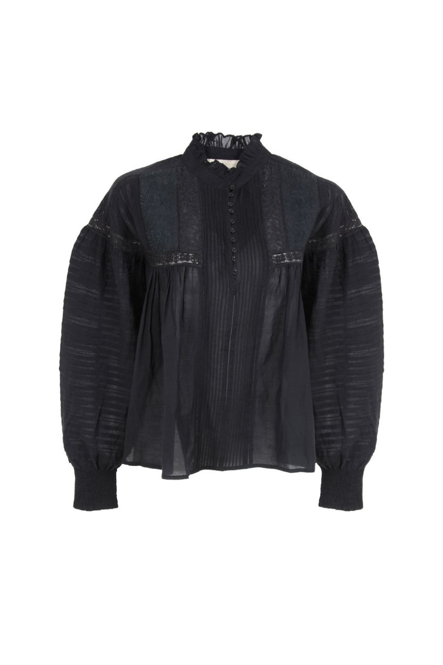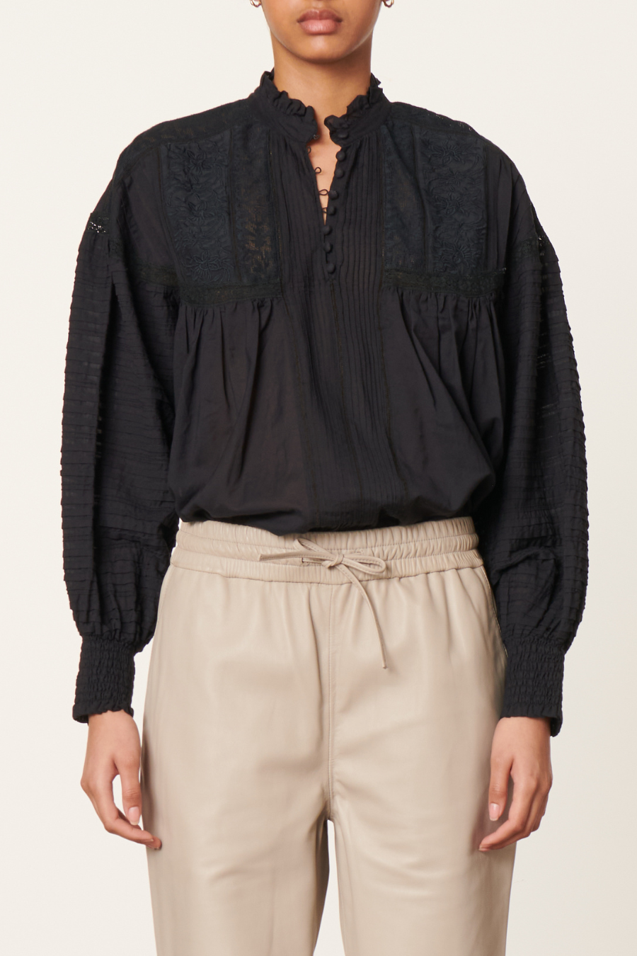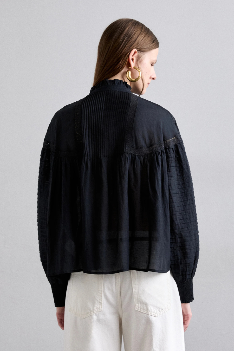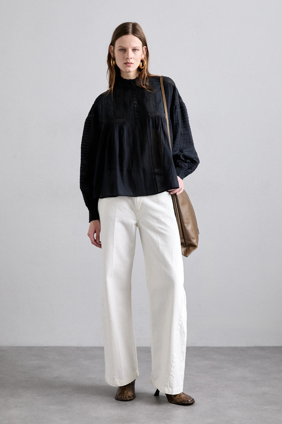 The vintage-look Dahlia cotton-blend blouse stands out for its meticulous, neat details. Featuring a range of pleating techniques, embroidery, gathers and lace, this piece is already a wardrobe favourite. Its cropped, trapeze cut creates a dainty, airy, foamy look. The added extra? The smocked, elasticated style of the sleeves let you play with the silhouette and the volume of these puffed sleeves.
