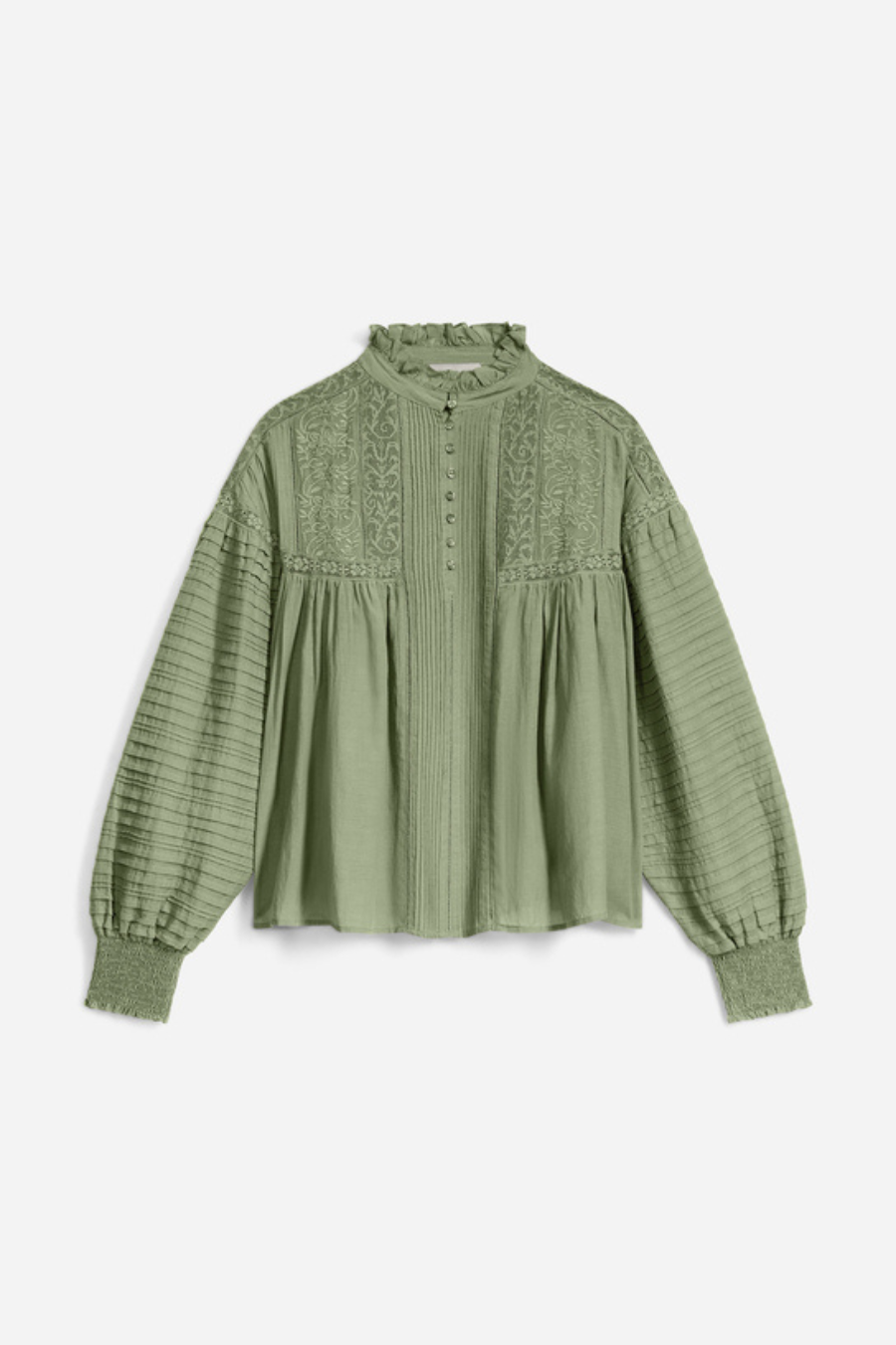 The vintage-look Dahlia cotton-blend blouse stands out for its meticulous, neat details. Featuring a range of pleating techniques, embroidery, gathers and lace, this piece is already a wardrobe favourite. Its cropped, trapeze cut creates a dainty, airy, foamy look. The added extra? The smocked, elasticated style of the sleeves let you play with the silhouette and the volume of these puffed sleeves.