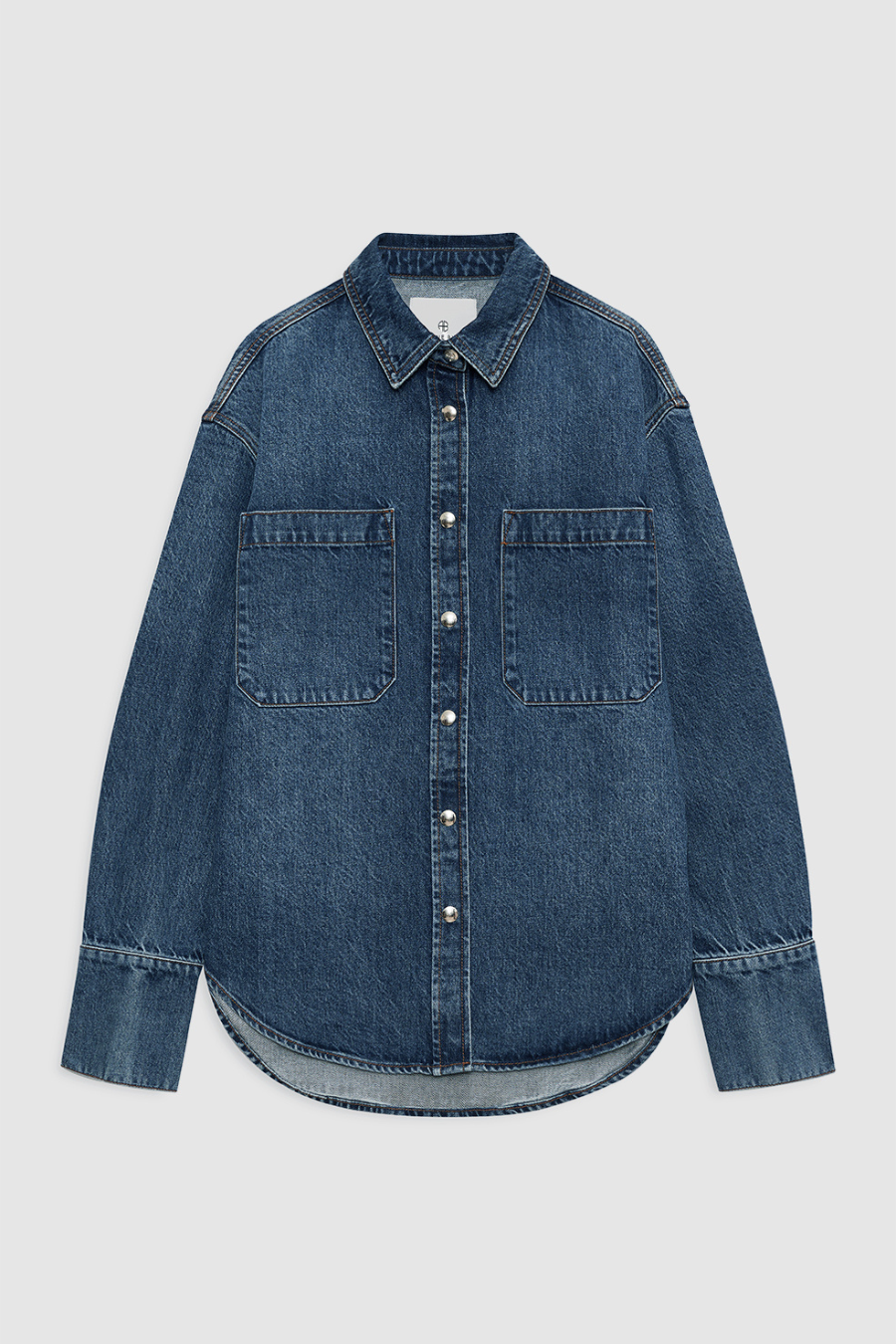 The oversized Dante Shirt is constructed from midweight 100% regenerative cotton denim without stretch. This uniform essential features large front patch pockets, signature ANINE BING snap buttons down the center-front placket, and wide cuffs.