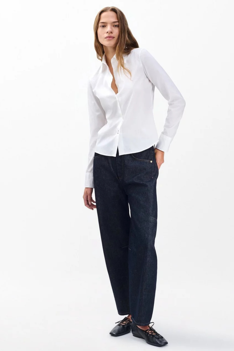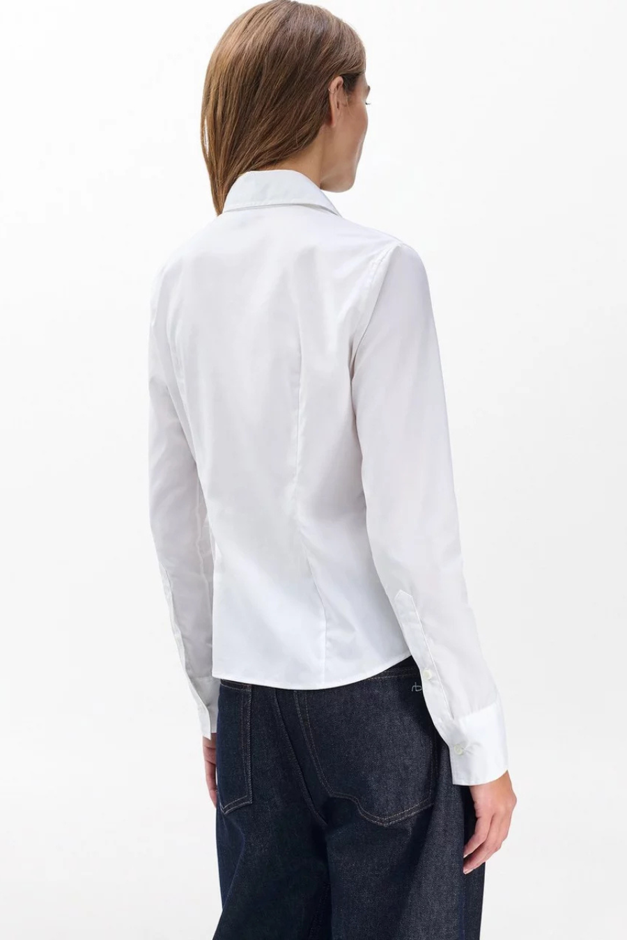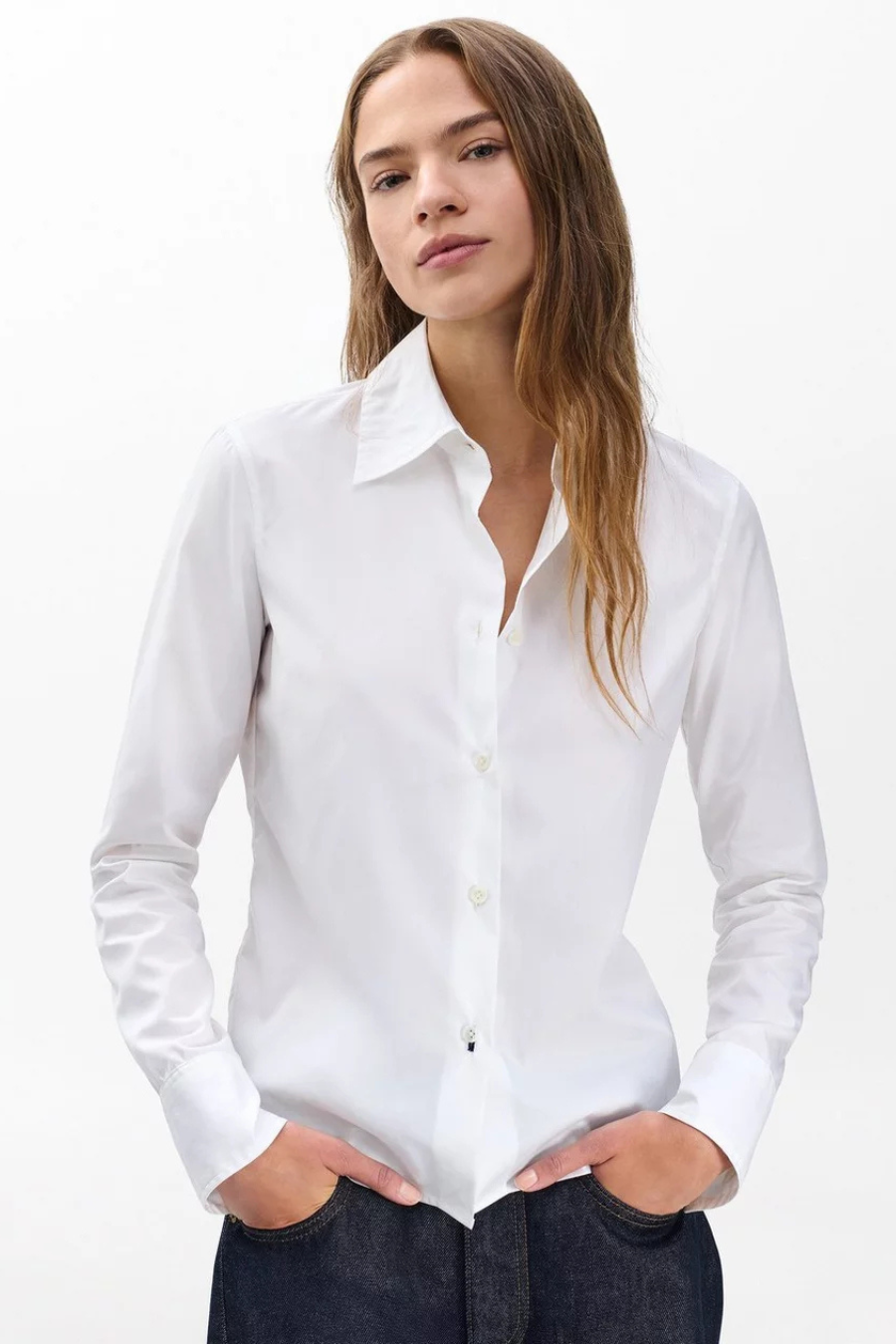 Solid choice. A forever staple, reimagined in lightweight cotton poplin with a slim profile that's perfectly tailored from shoulder to hem. It's the perfect button-up shirt to wear under a blazer. But looks just as sleek and chic by itself.