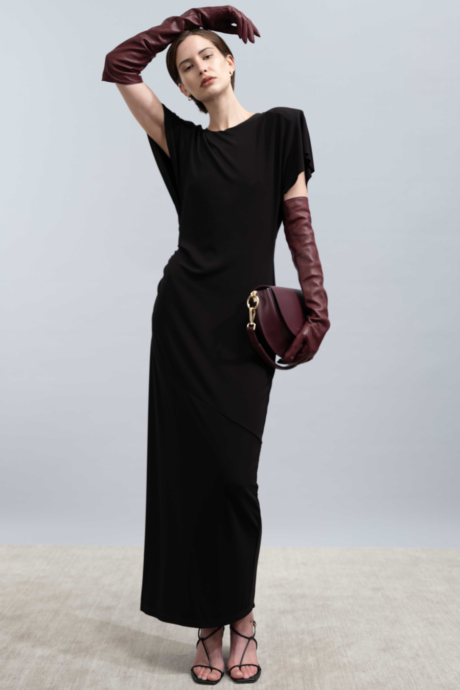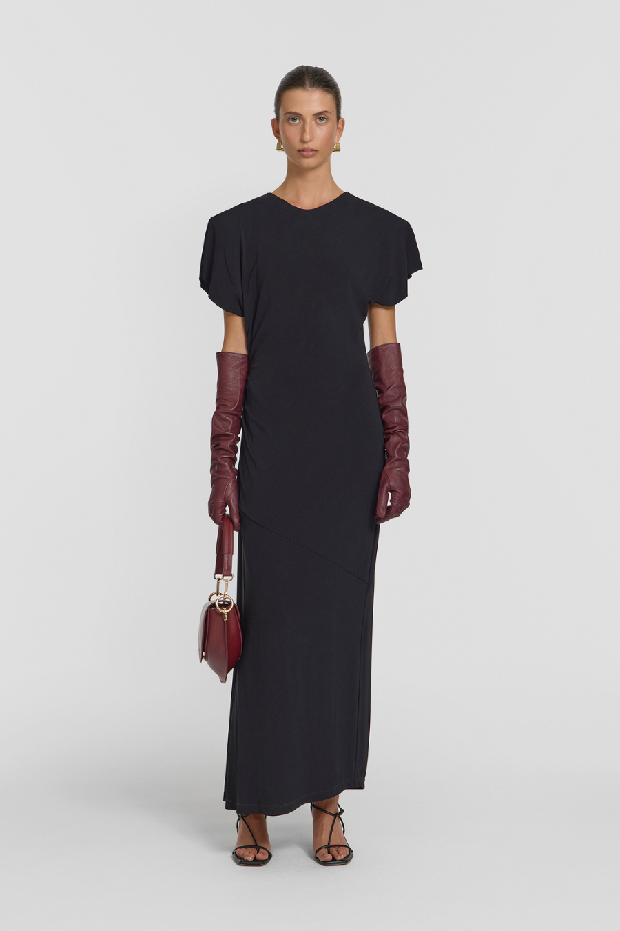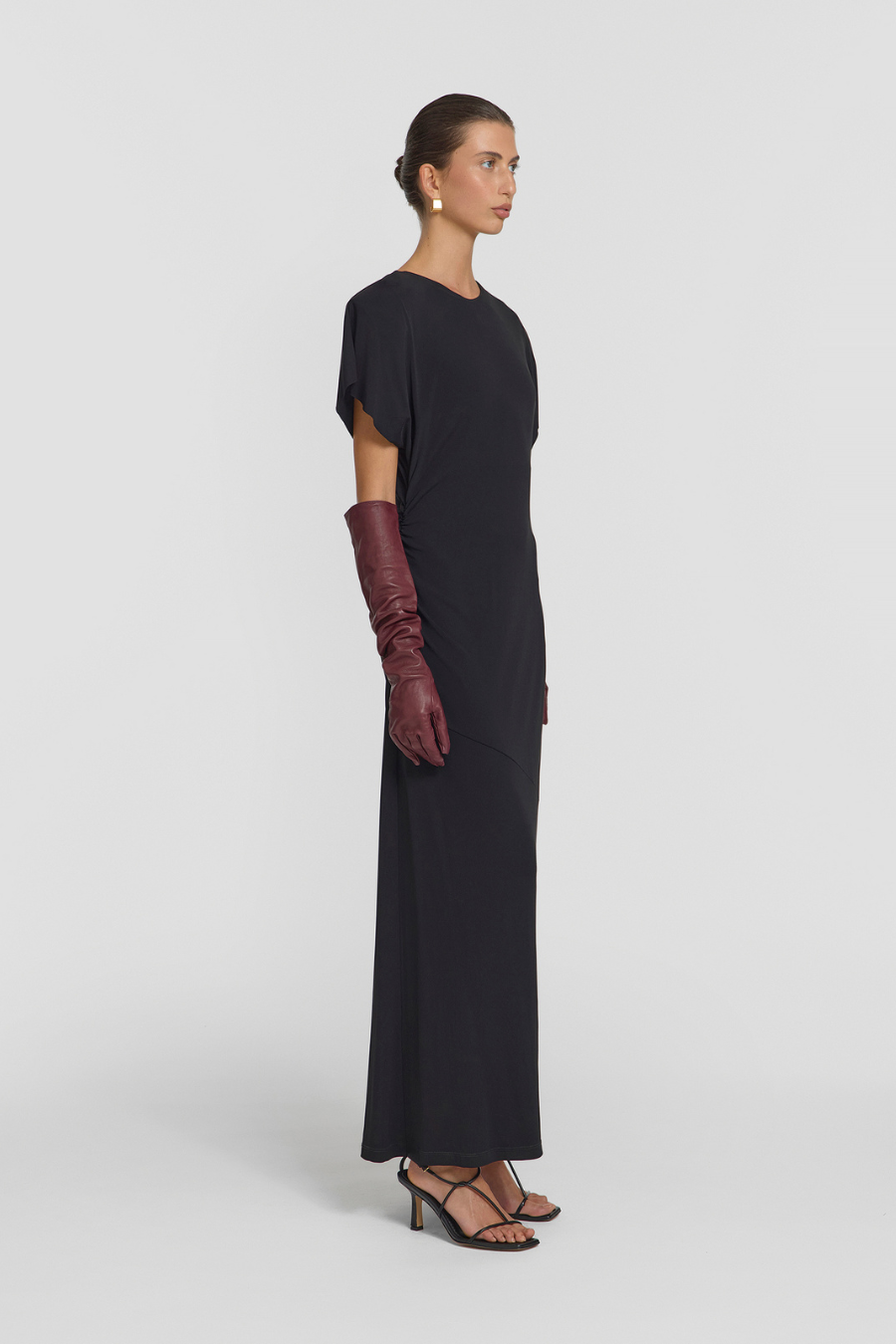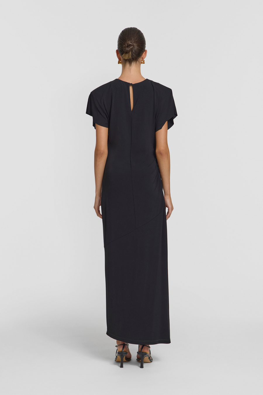 Embody serene elegance with the Daytona Dress, an event-worthy silhouette in classic black. Subtle shoulder pads and softly draped sleeves complement its gentle side gathering for a flattering, body-skimming fit. A raw sleeve hem and keyhole opening at the back lend a sophisticated finish, making this dress a standout choice for your next occasion.
