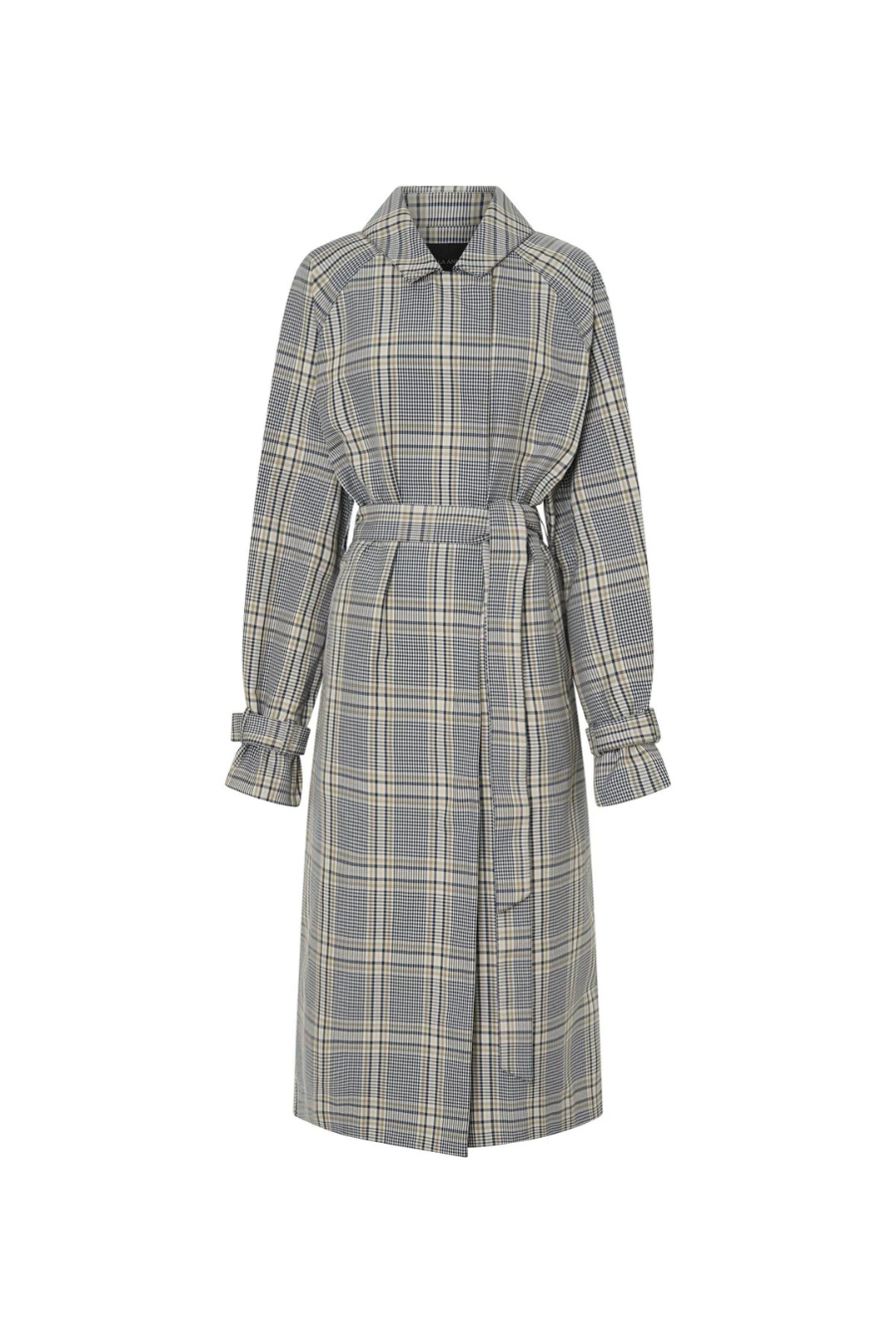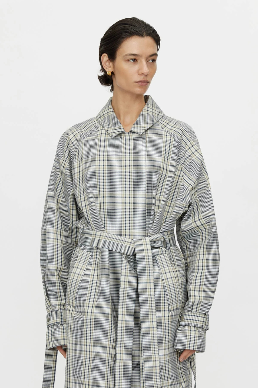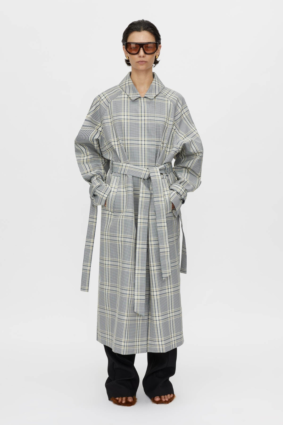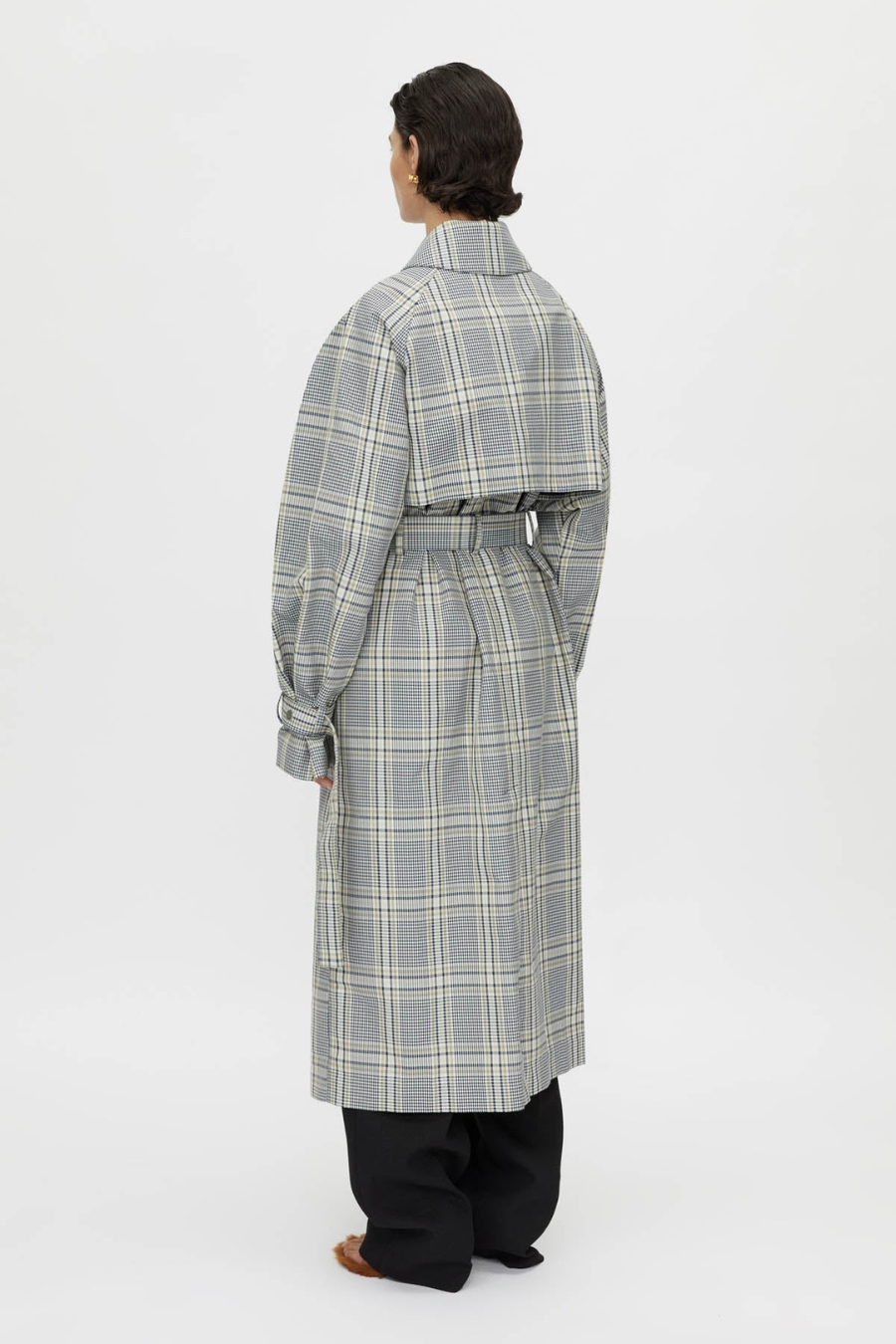 The Delta Plaid Trench is crafted from a clean, architectural weave in a single-breasted silhouette. This piece features dropped armholes and adjustable oversized sleeves with extra-long sleeve tabs.