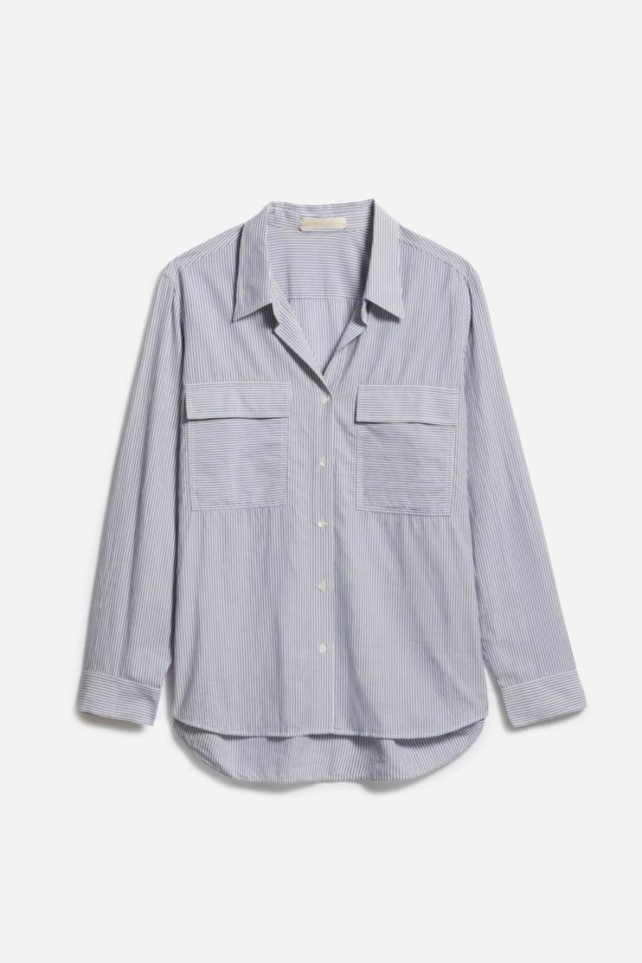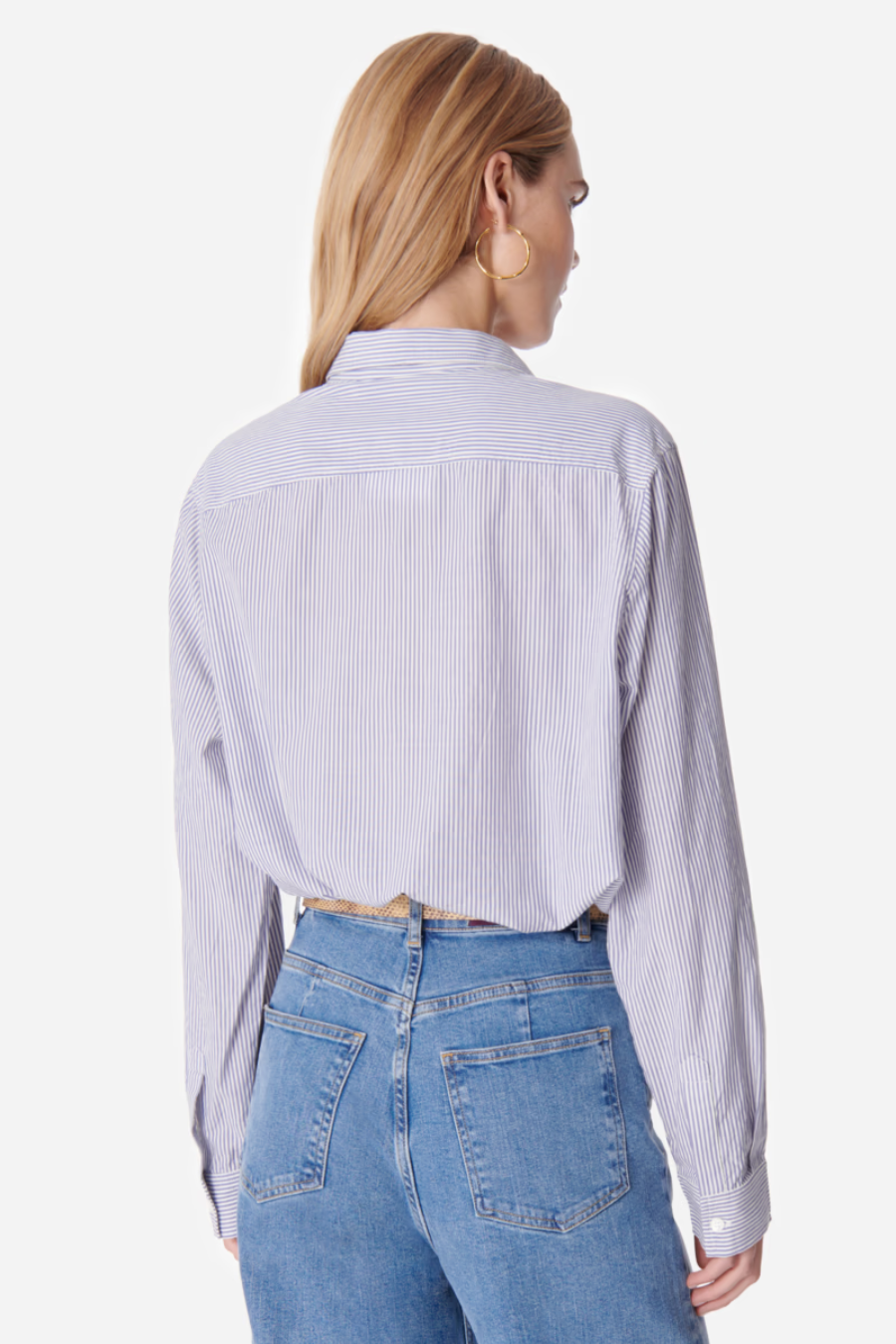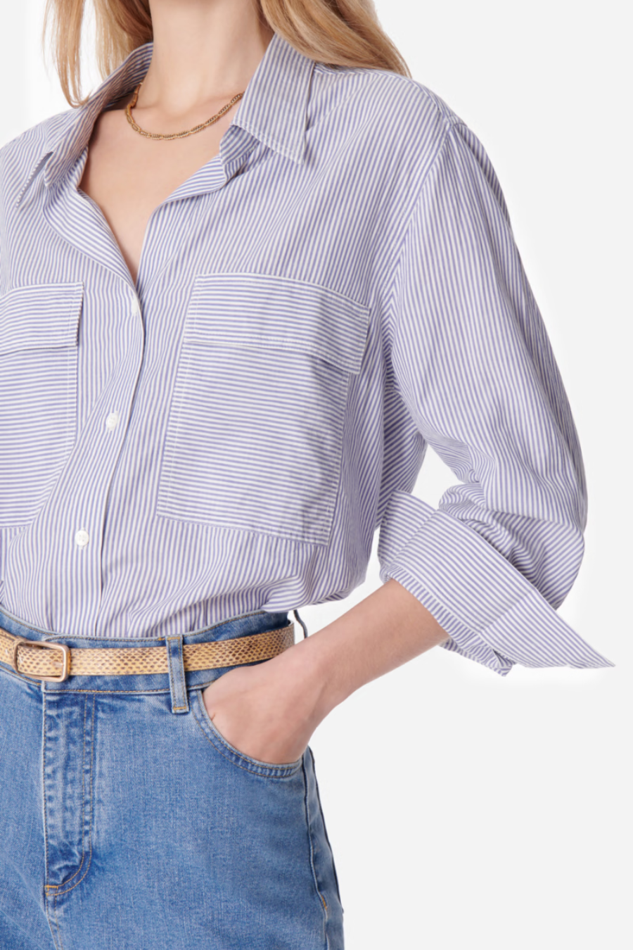 Vanessa's new favourite shirt. An essential piece for women's wardrobes, the Dim shirt is made from 100% cotton with blue stripes. With its masculine, workwear look, it features patch pockets with flaps at chest level. Its fluid cut offers a sophisticated yet minimalist silhouette. The shirt collar, with its offset buttoning, is deliberately worn open for a nonchalant, modern attitude. Embrace the casual chic look by wearing it slightly oversized, day or night, with your favourite jeans.