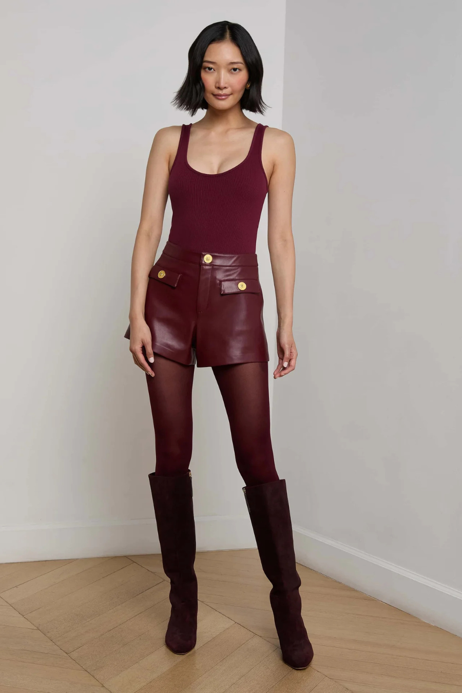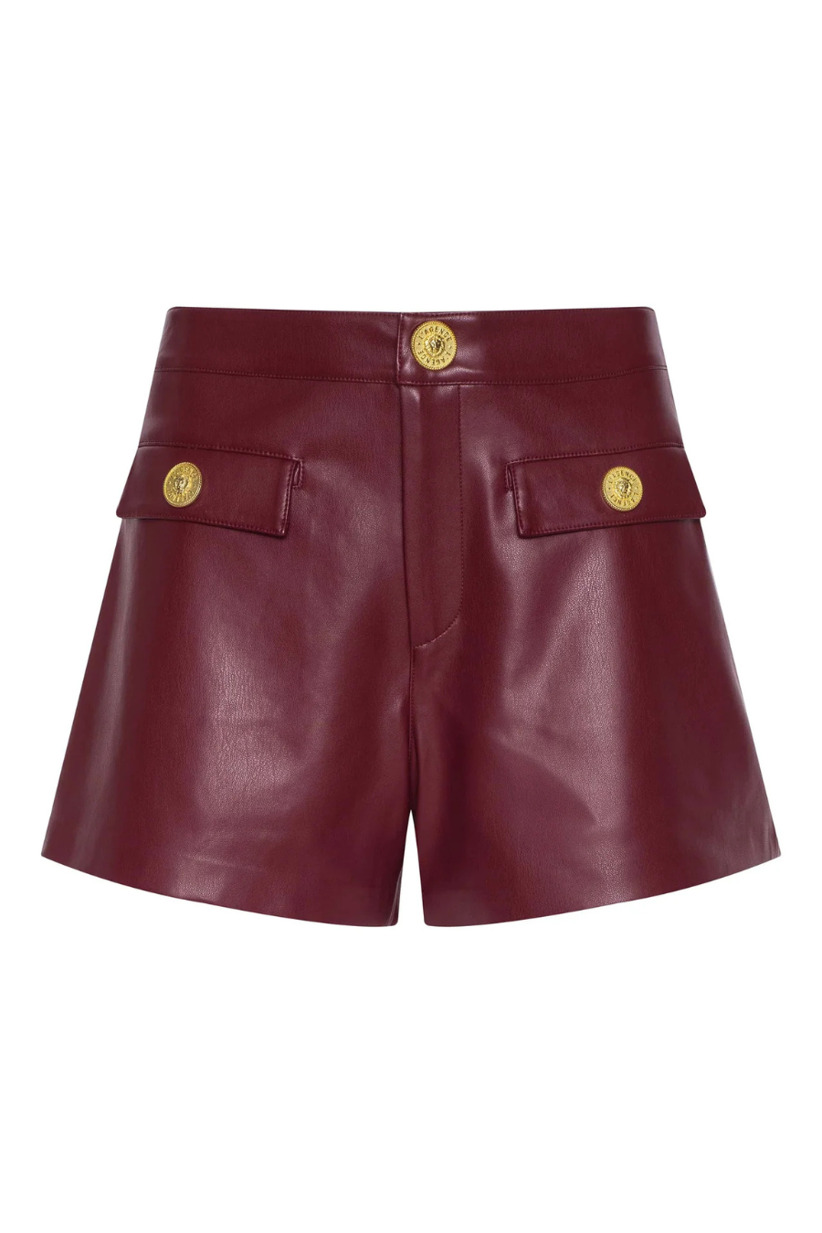 Polished details meet a supple vegan leather. Our Dionne short is a versatile bestseller, perfect for both work and play. Now in black cherry.