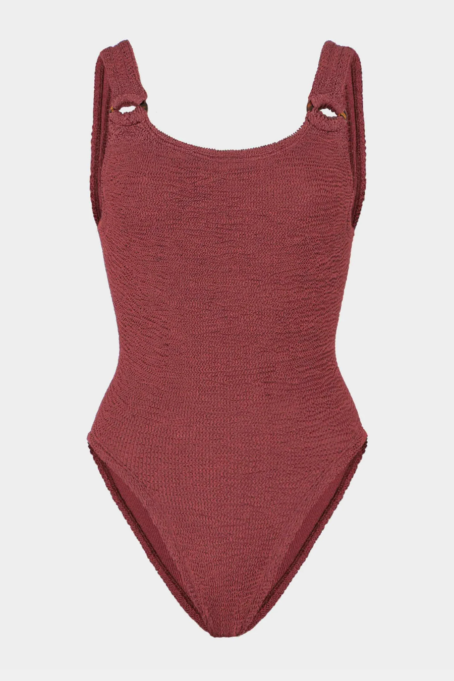 The style that crashed our site. Our iconic dipped neck, scooped back Domino swimsuit, now reimagined with chic tonal hoop detailing. A modern take on a classic.