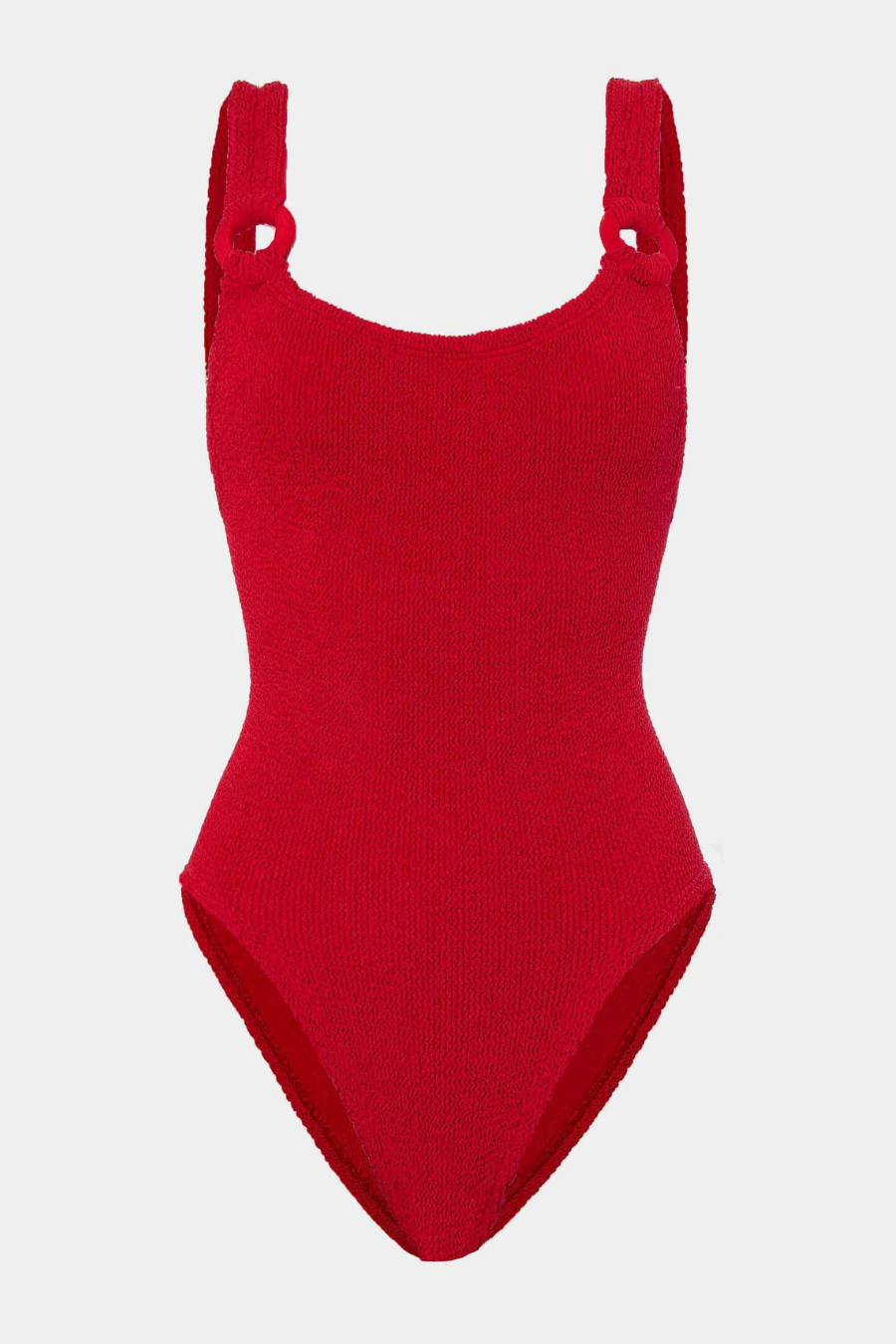 The style that crashed our site. Our iconic dipped neck, scooped back Domino swimsuit, now reimagined with chic tonal hoop detailing. A modern take on a classic.