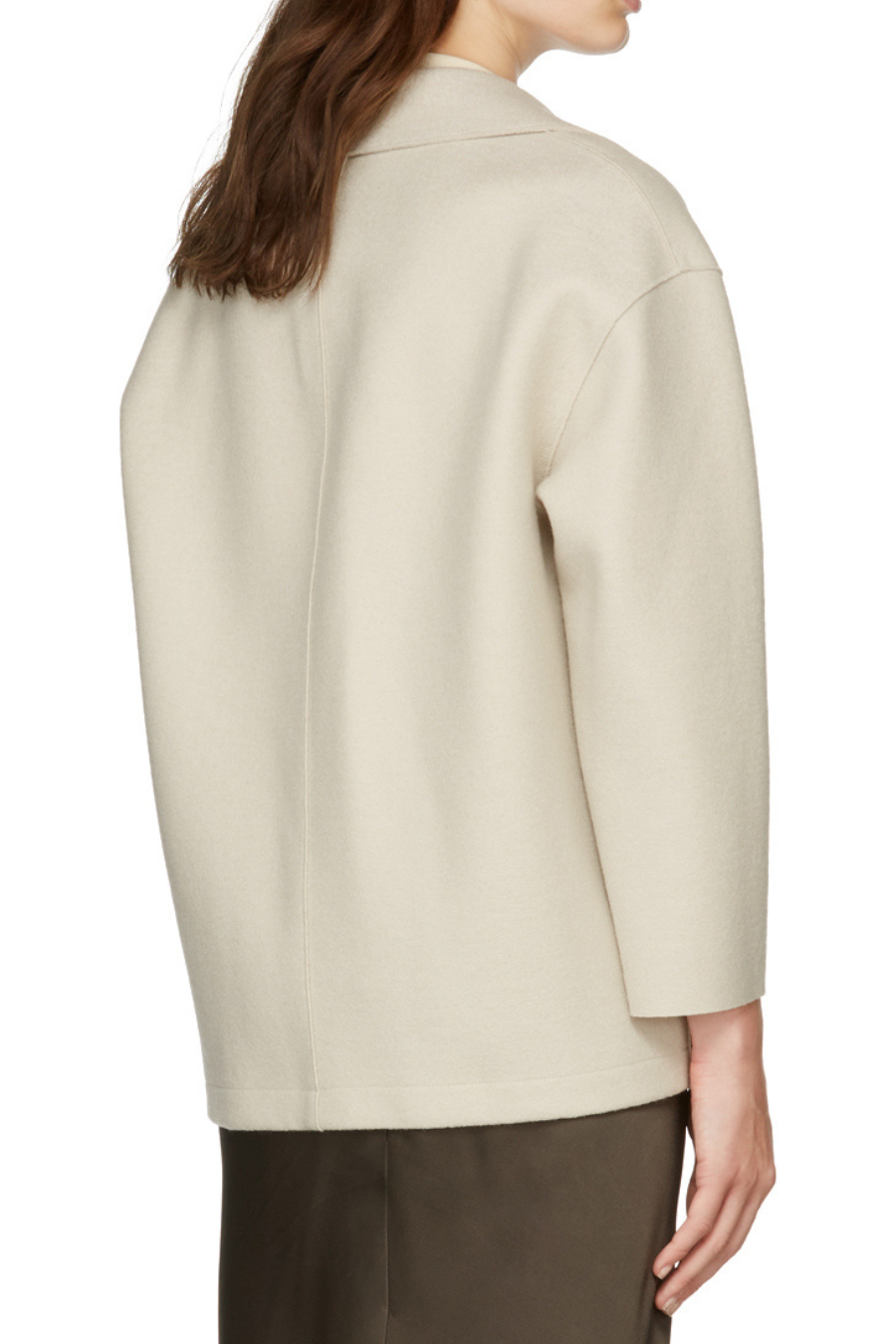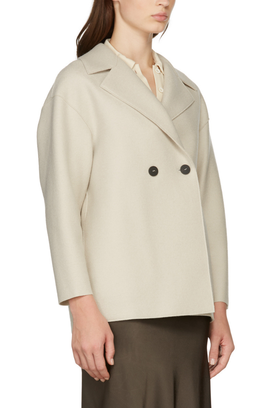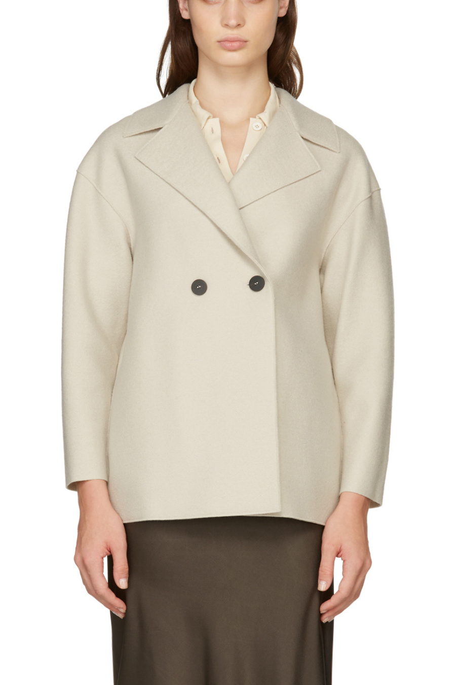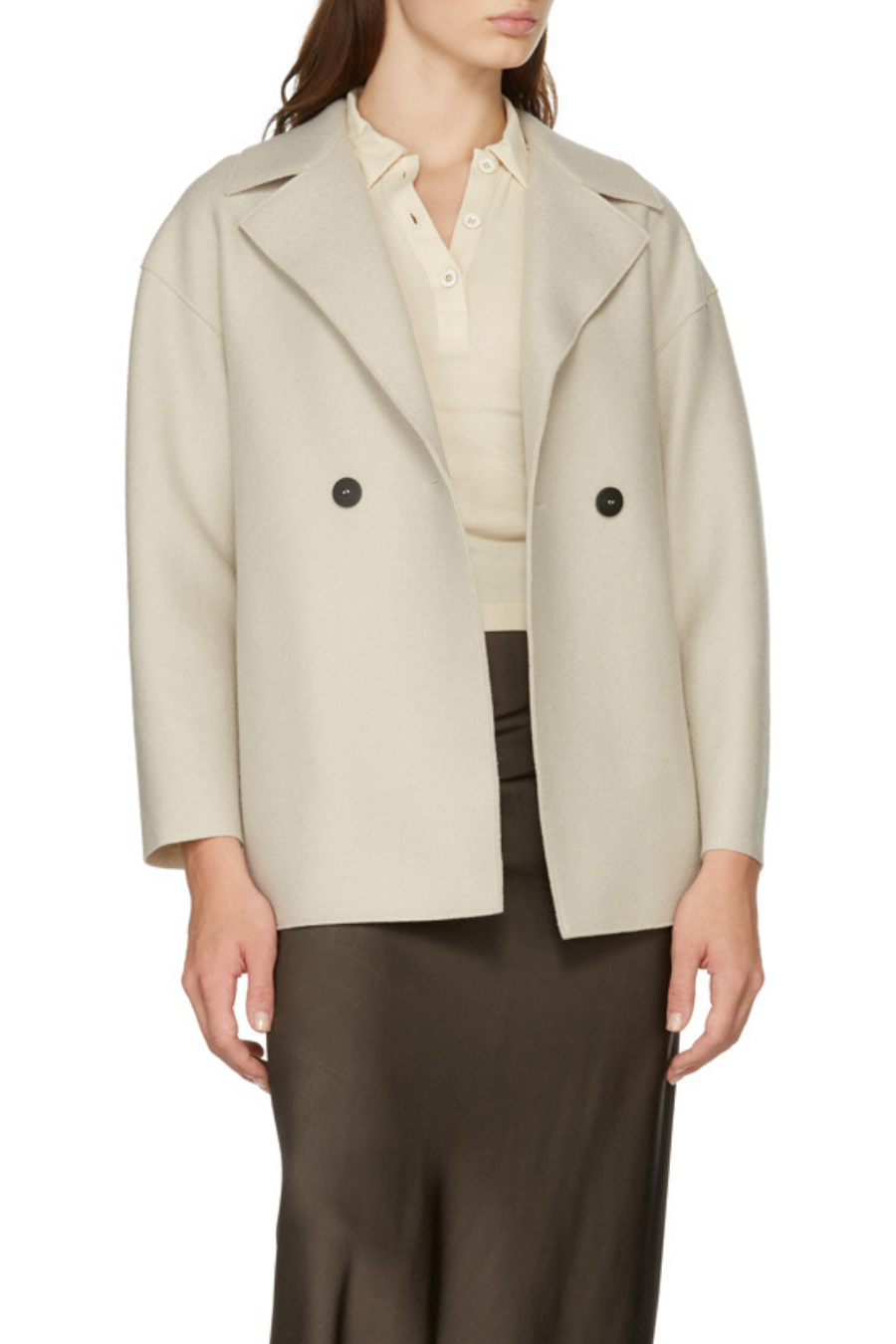 This sophisticated double-breasted coat presents a contemporary look due to its oversized fit and lowered shoulder seams. Its unstructured design is further enhanced by welt pockets and unfinished raw edges.