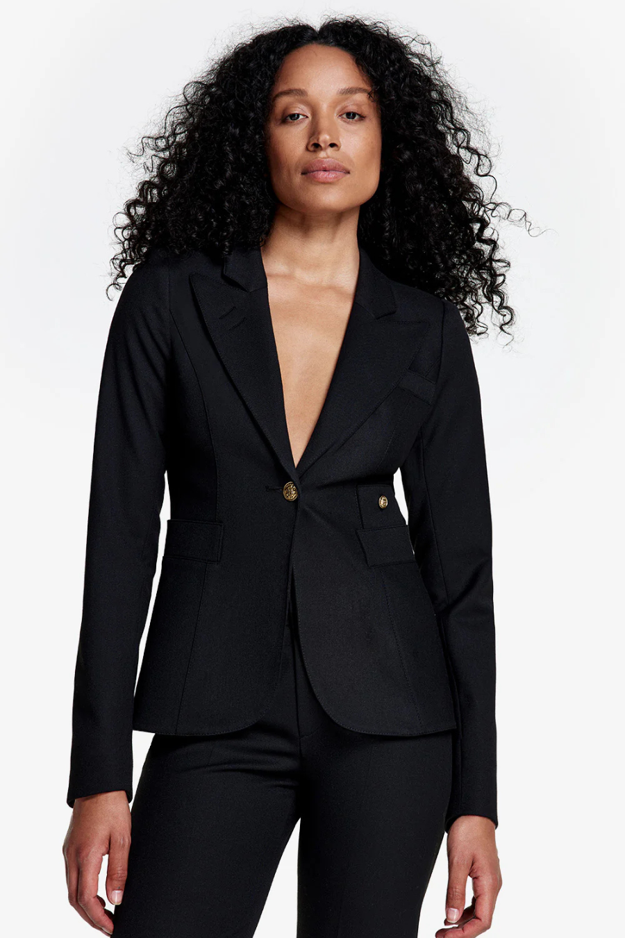 Decidedly tailored and one of our top selling silhouettes, this single-breasted blazer features a “cheeky” cut out back vent and brass hardware. Curvy figures may wish to go up a size.