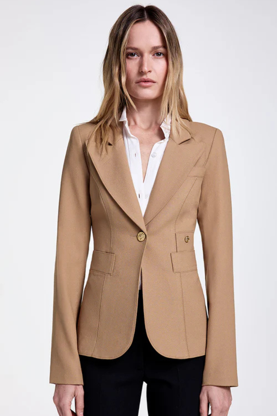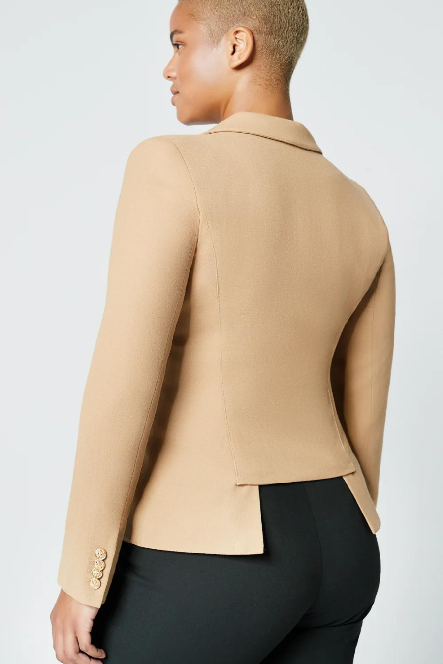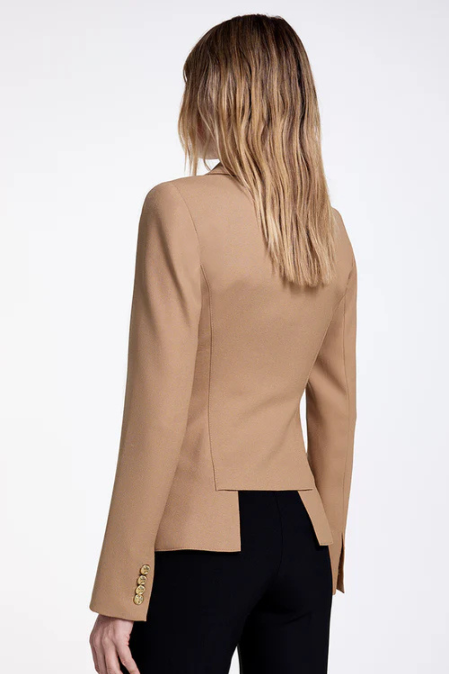 Decidedly tailored and one of our top selling silhouettes, this single breasted blazer features a “cheeky” cut out back vent and brass hardware.