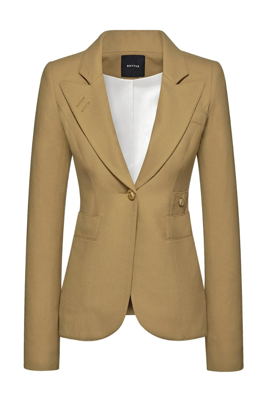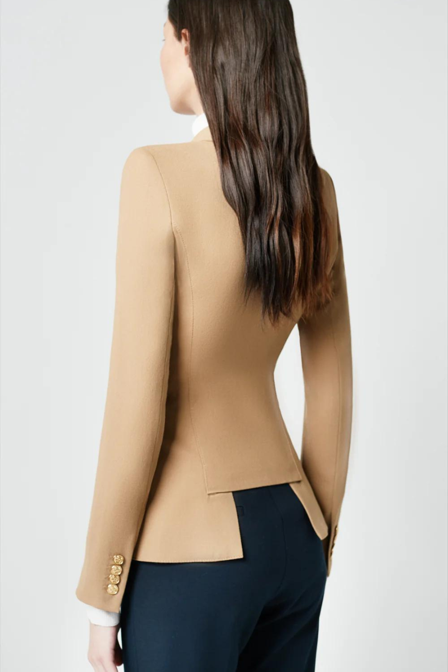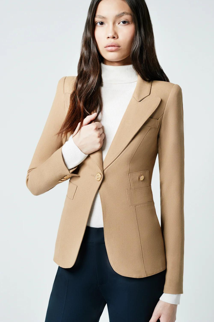 Decidedly tailored and one of our top selling silhouettes, this single breasted blazer features a “cheeky” cut out back vent and brass hardware.