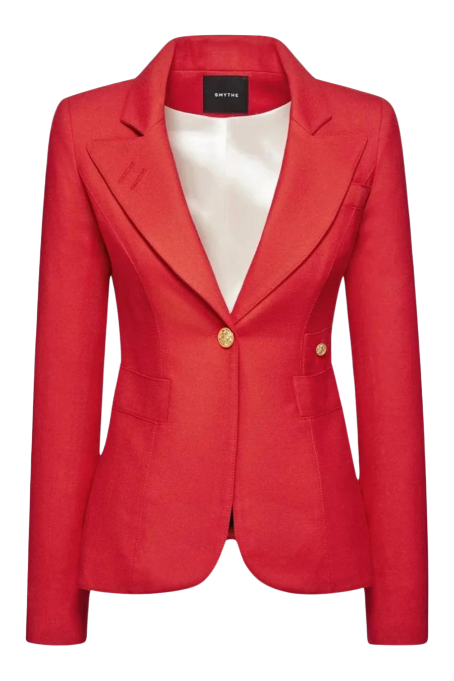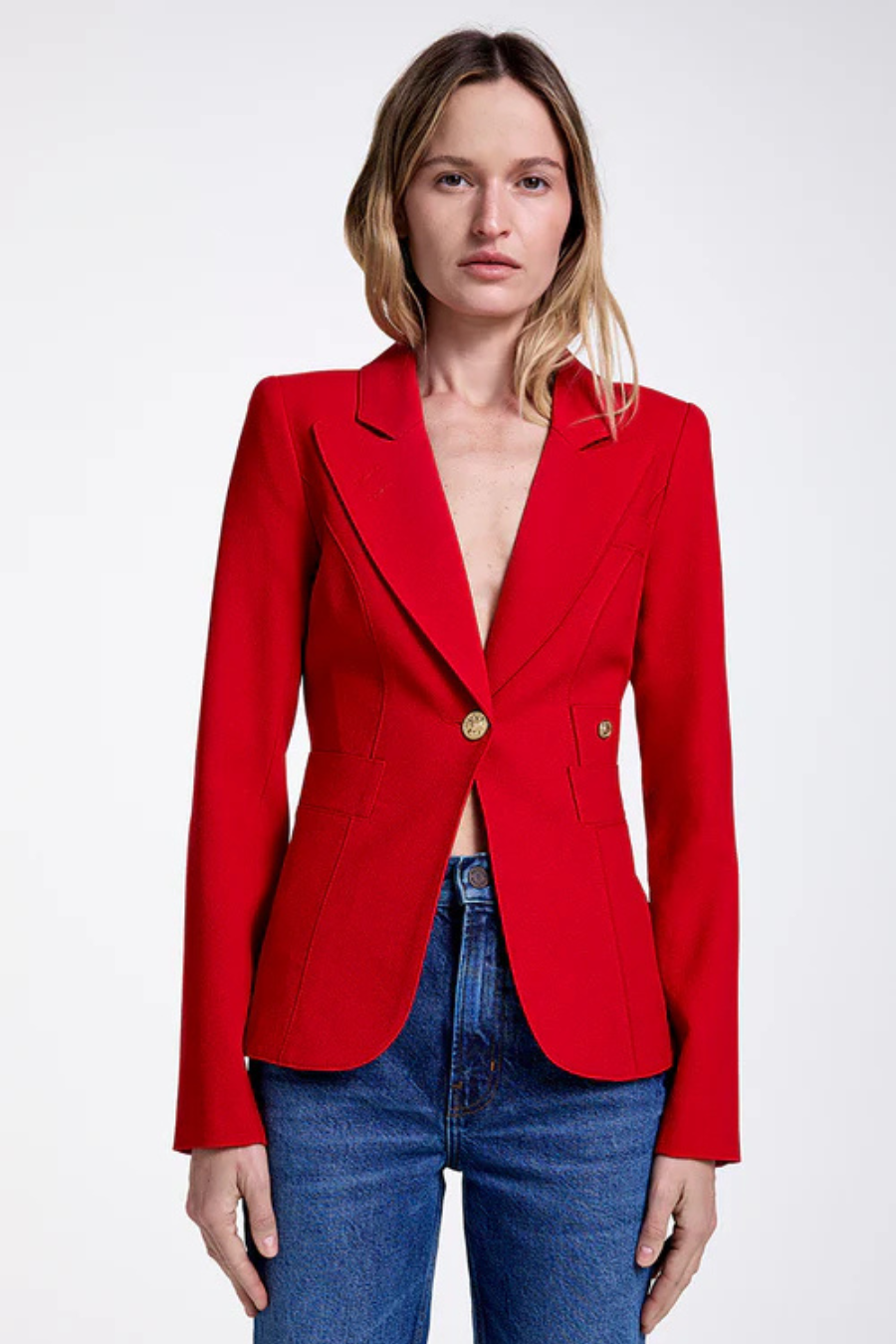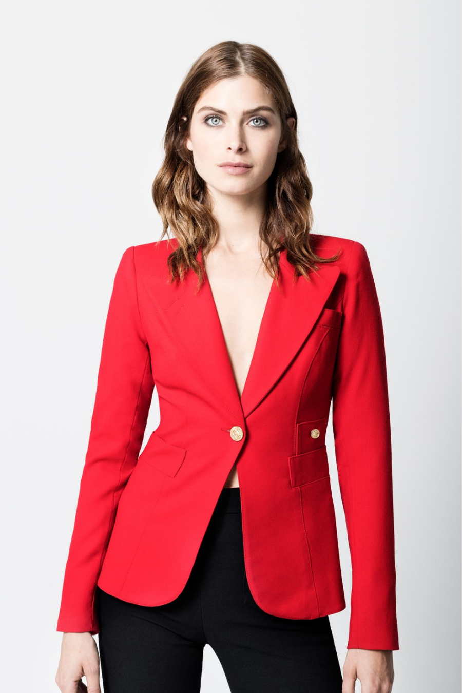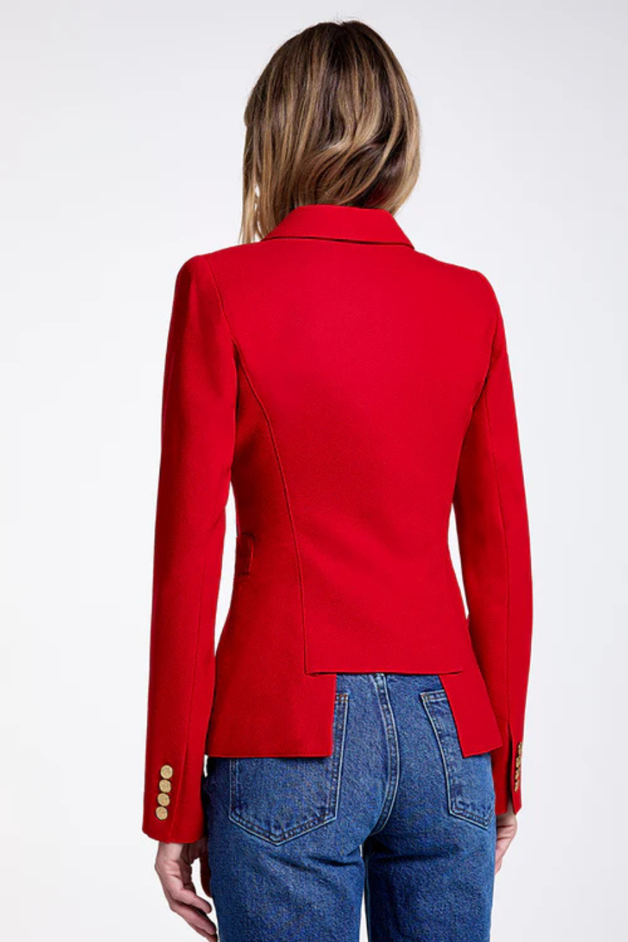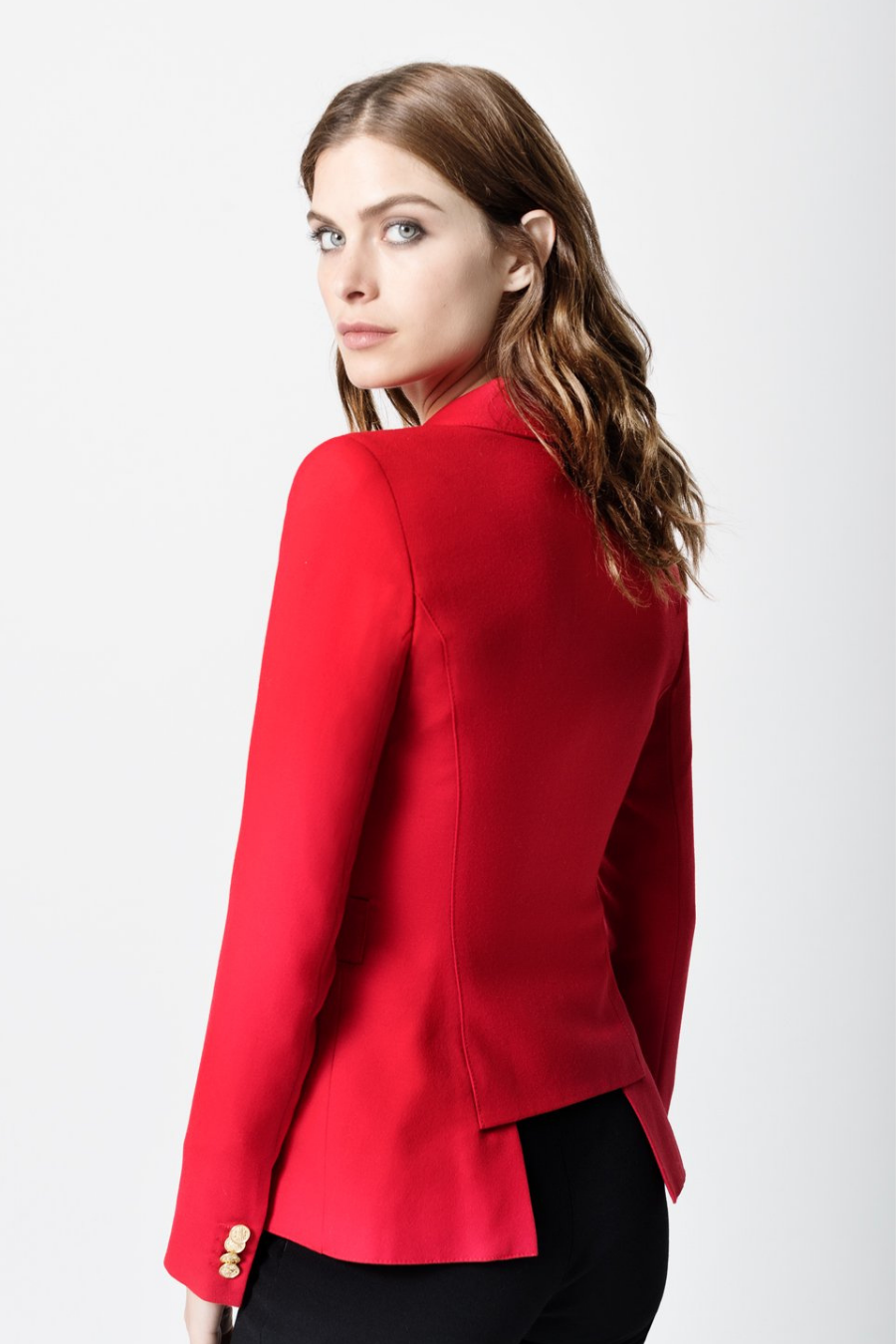 Details: Decidedly tailored and one of our top selling silhouettes, this single breasted blazer features a “cheeky” cut out back vent and brass hardware.