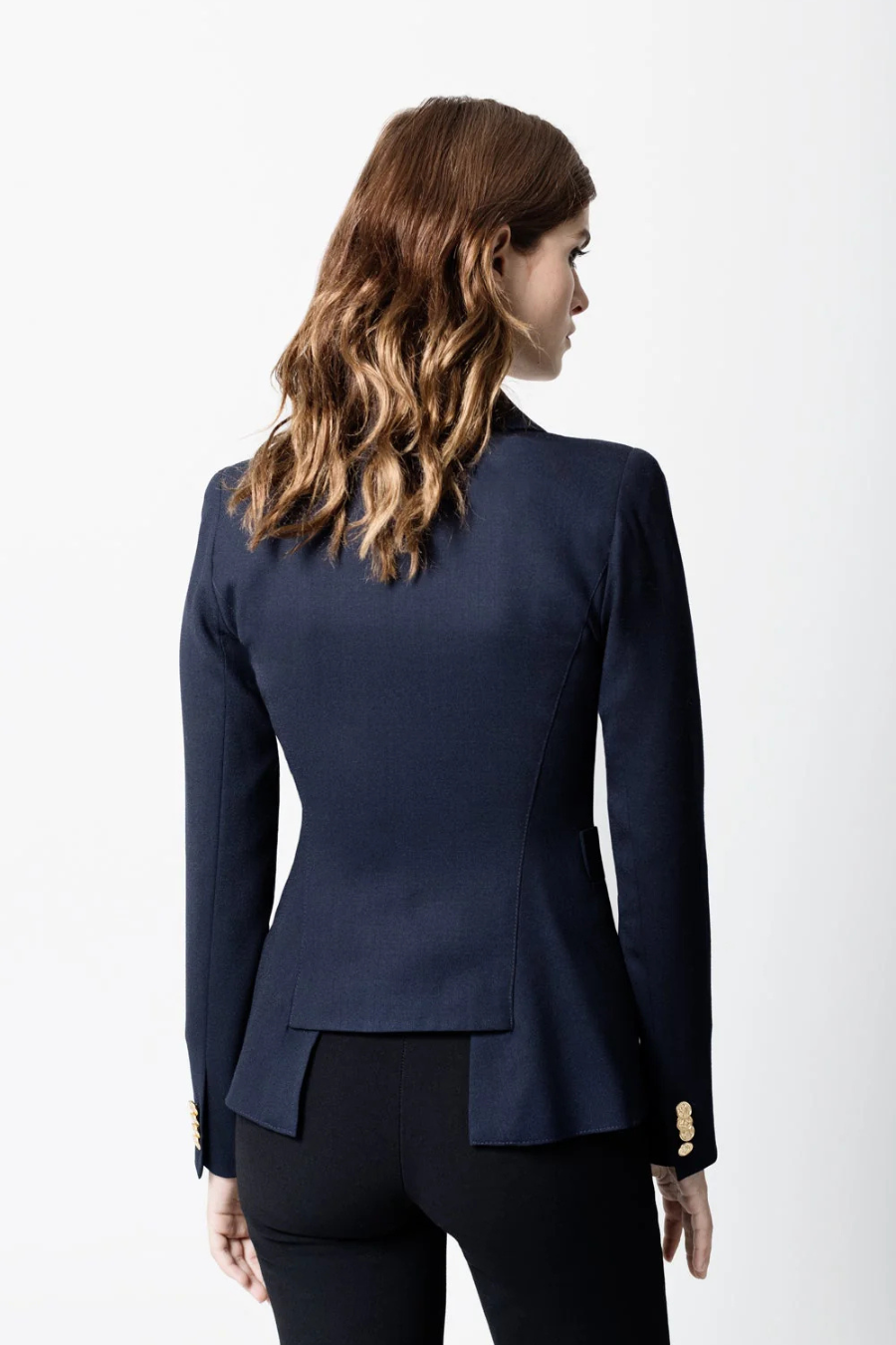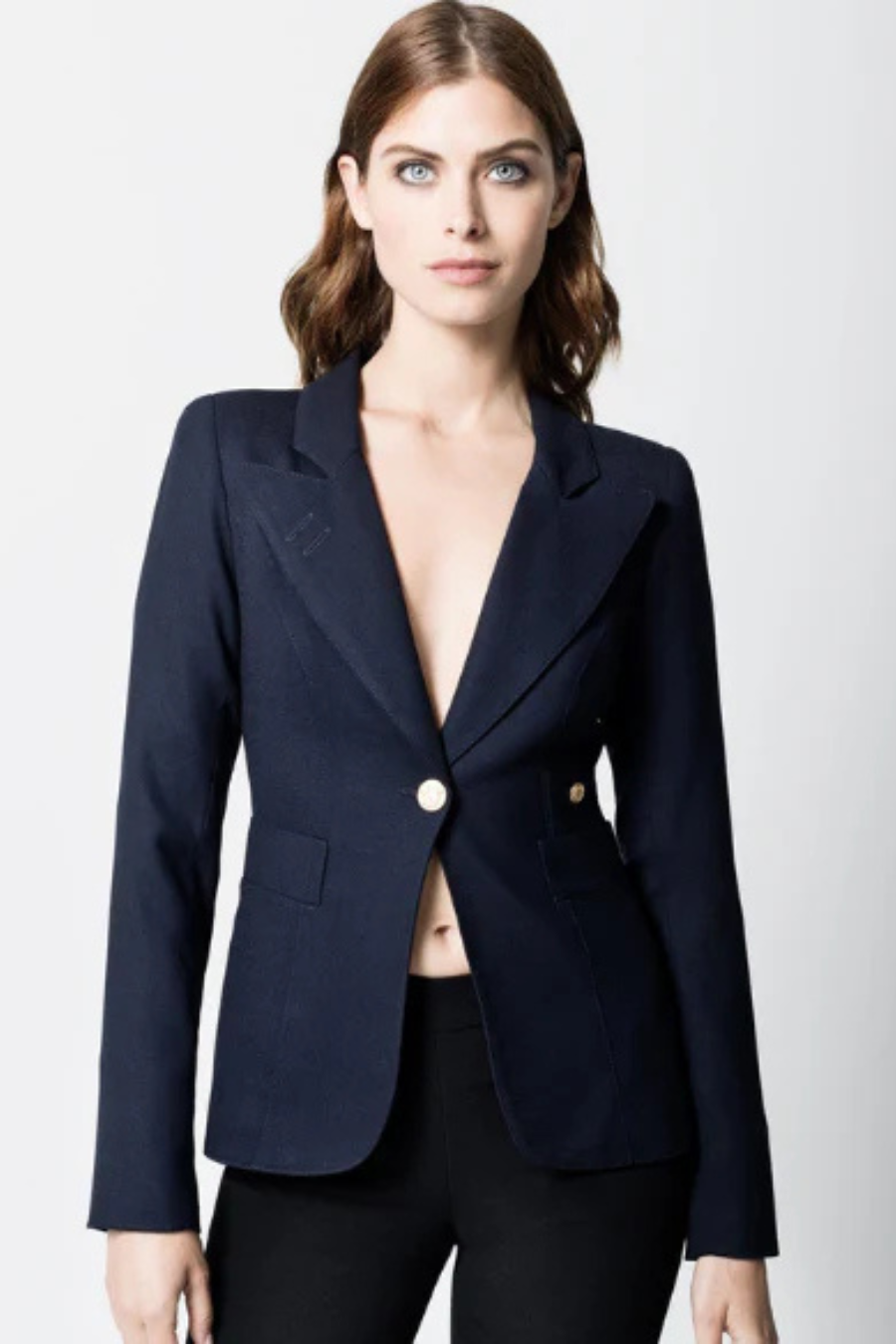 Details: Precisely cut in a seasonless stretch viscose blend, this slim-fit blazer is designed for year-round wear. The single-breasted cutaway silhouette creates a nipped-in waist, while the back features a classic double back vent. Signature brass buttons make it undeniably SMYTHE. Curvy figures may wish to go up a size.