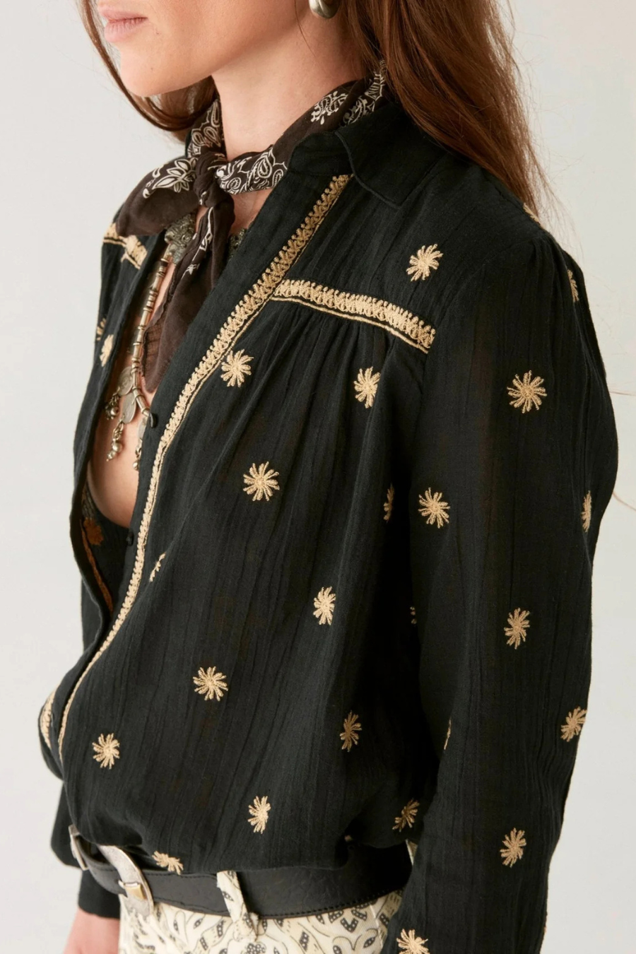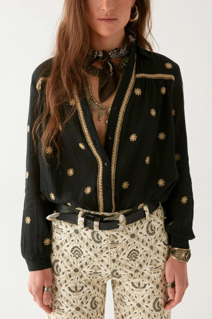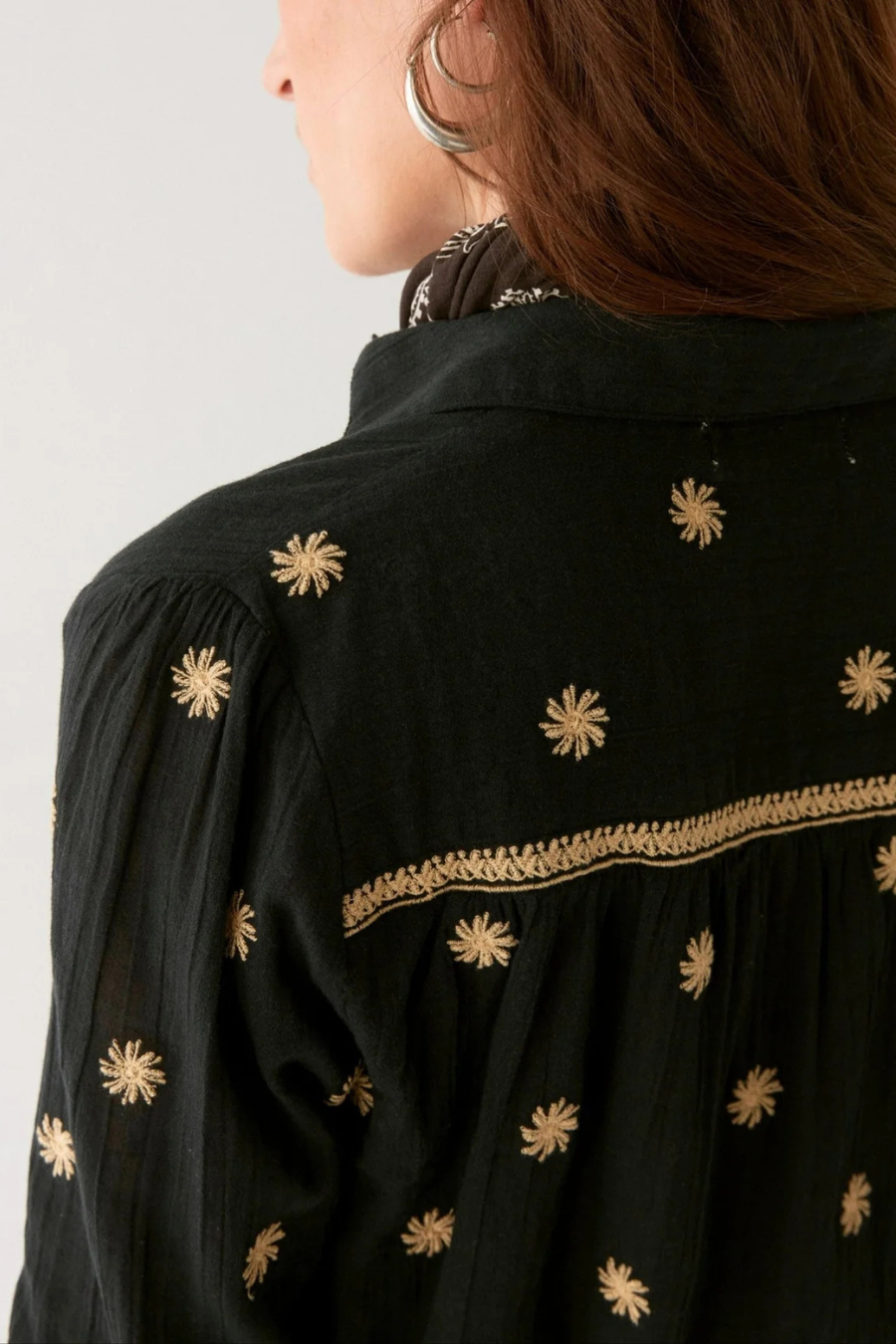 A sharp take on bohemian. Black cotton gauze, lightweight yet structured, with gold embroidery scattered like flickering city lights at 2am. The open neckline and tailored ease keep it grounded, while the intricate detailing adds an edge—refined, but never fussy.