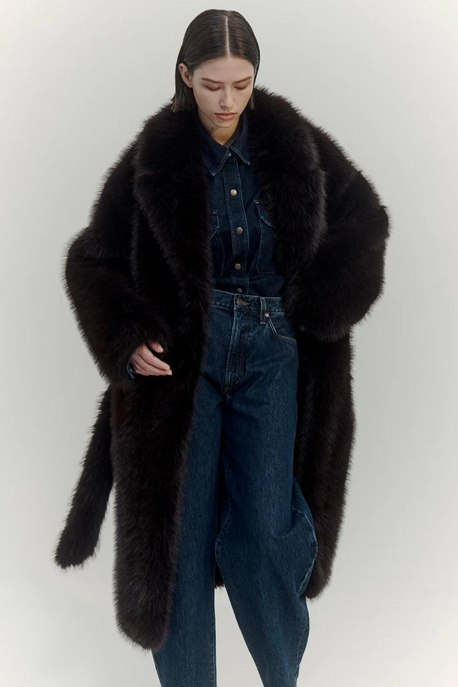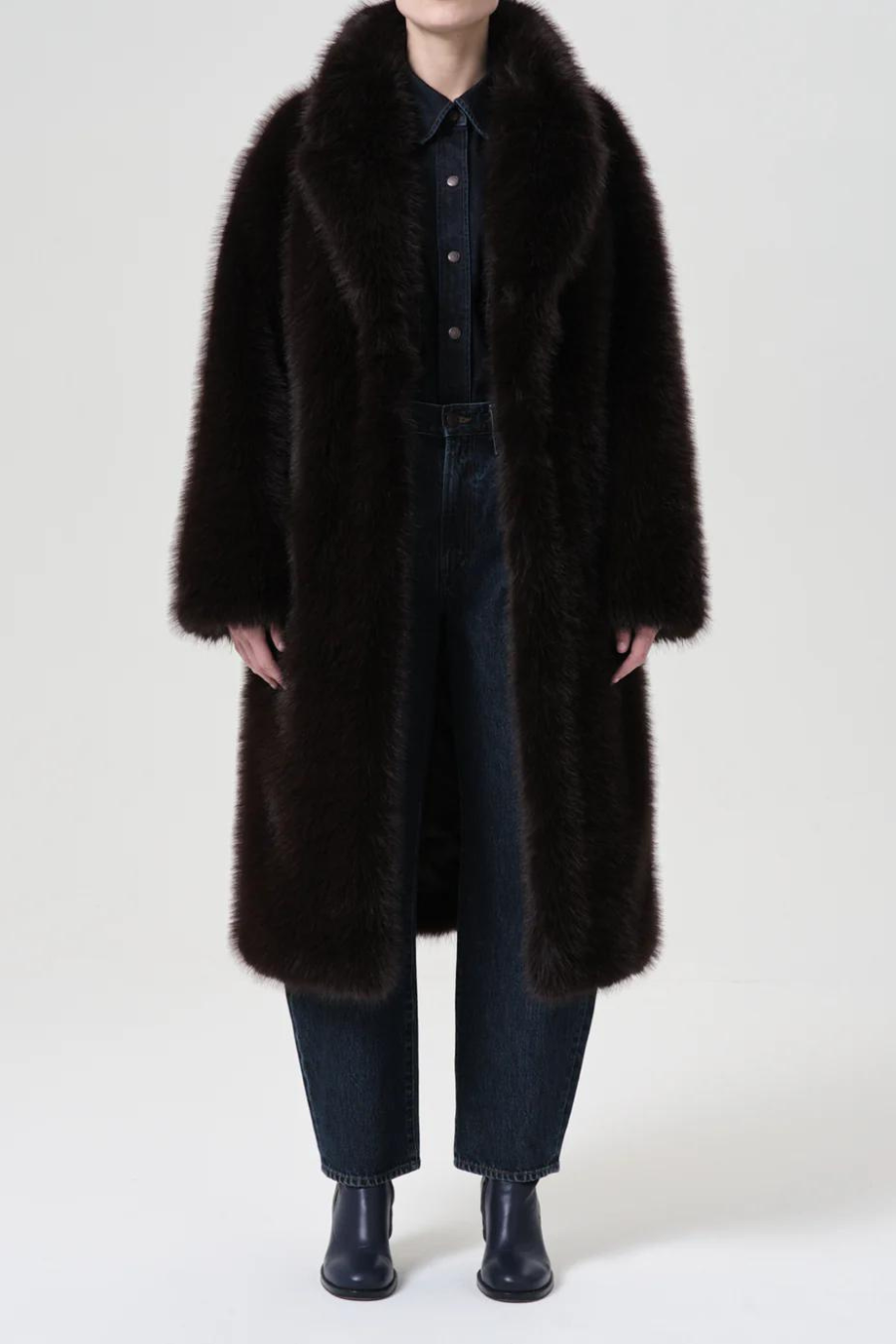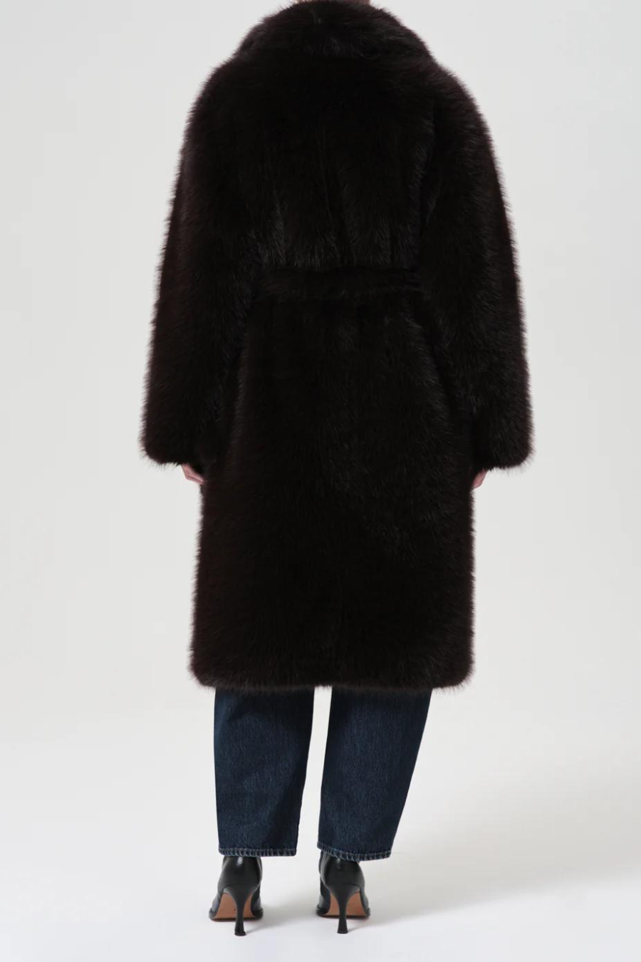 The Ebony Shearling Coat is guaranteed to make a statement. Designed with long length, generous proportions and plush, voluminous feel. This silhouette is made from faux shearling and radiates glamorous sophistication.