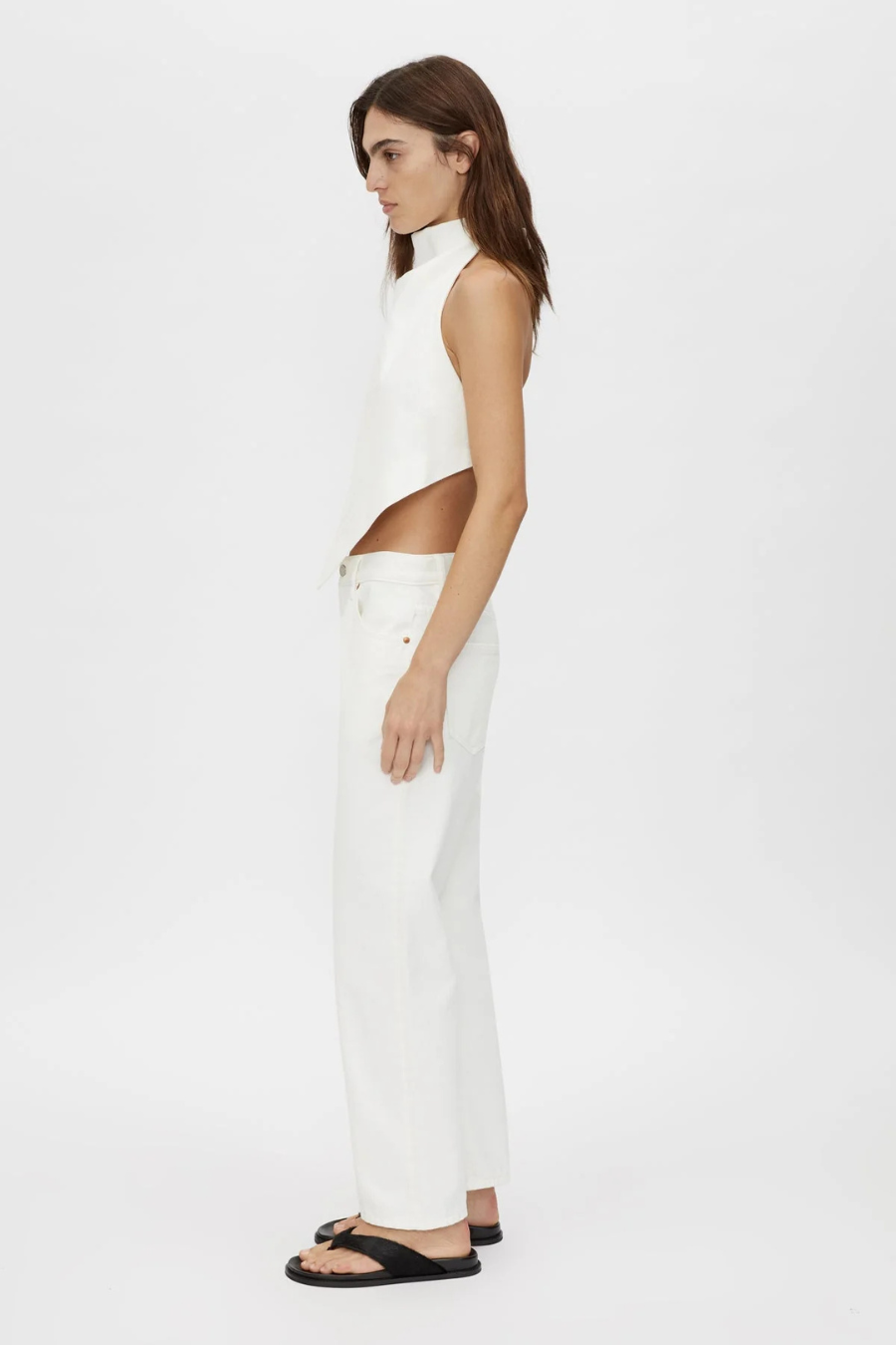 CAMILLA AND MARC Eleni white denim halter neck top with folded cowl neckline. Removable waist tab and keyhole buttons at waist.