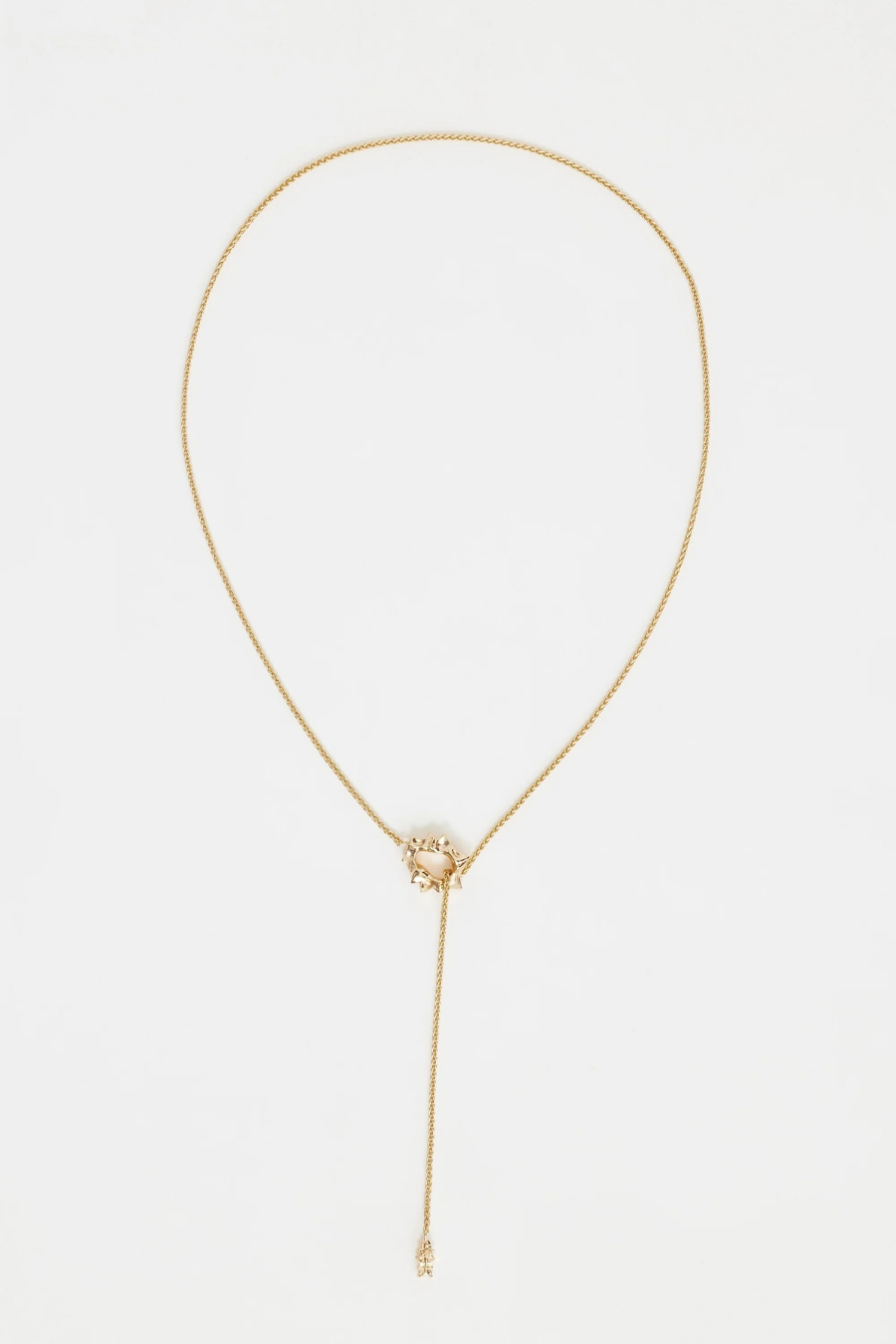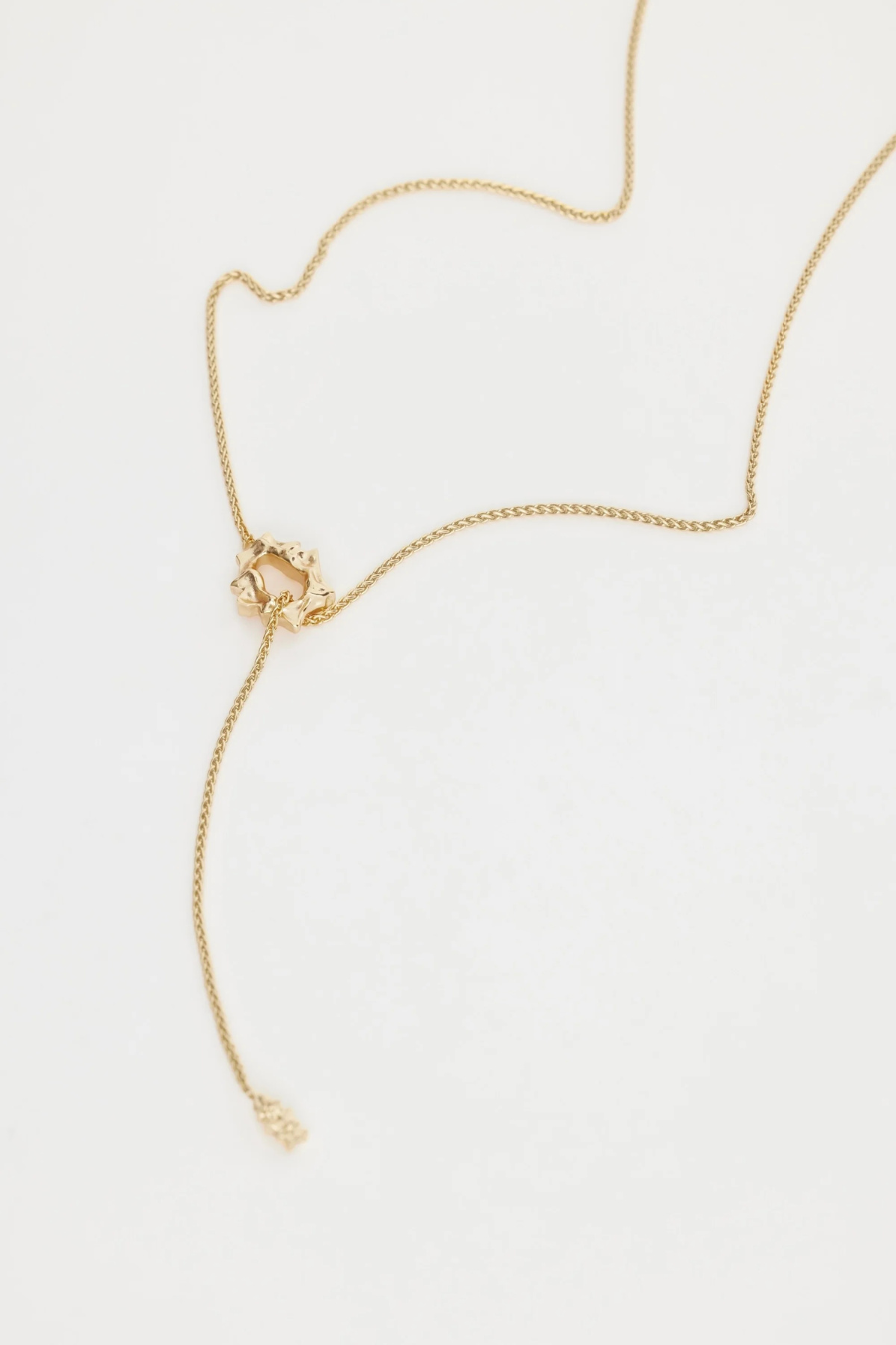 The Elford Lariat in Gold is a refined piece featuring a sleek, adjustable drop design. Crafted from matte 18k gold-plated brass, it offers subtle elegance with its delicate silhouette, perfect for enhancing any neckline.