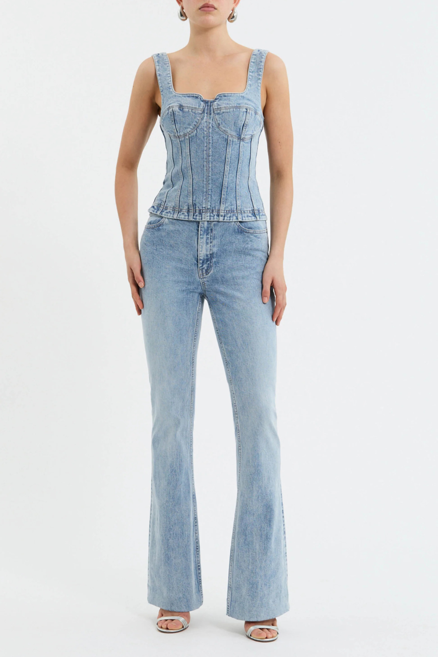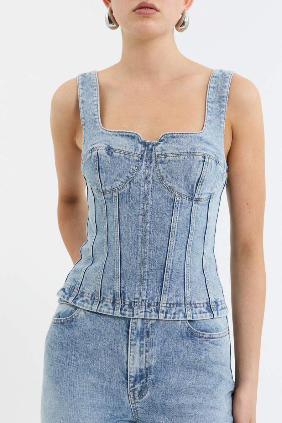 The Emika Top is a versatile wardrobe staple, tailored from light blue wash denim. Designed in a corset-style silhouette, the fitted bodice is supported by thick straps for utmost comfort and features a sweetheart neckline that adds a touch of feminine elegance. Contrast stitching provides a refined finish, while an exposed zip fastening at the back ensures a secure fit. Effortlessly chic, this top is a must-have for elevated everyday styling.