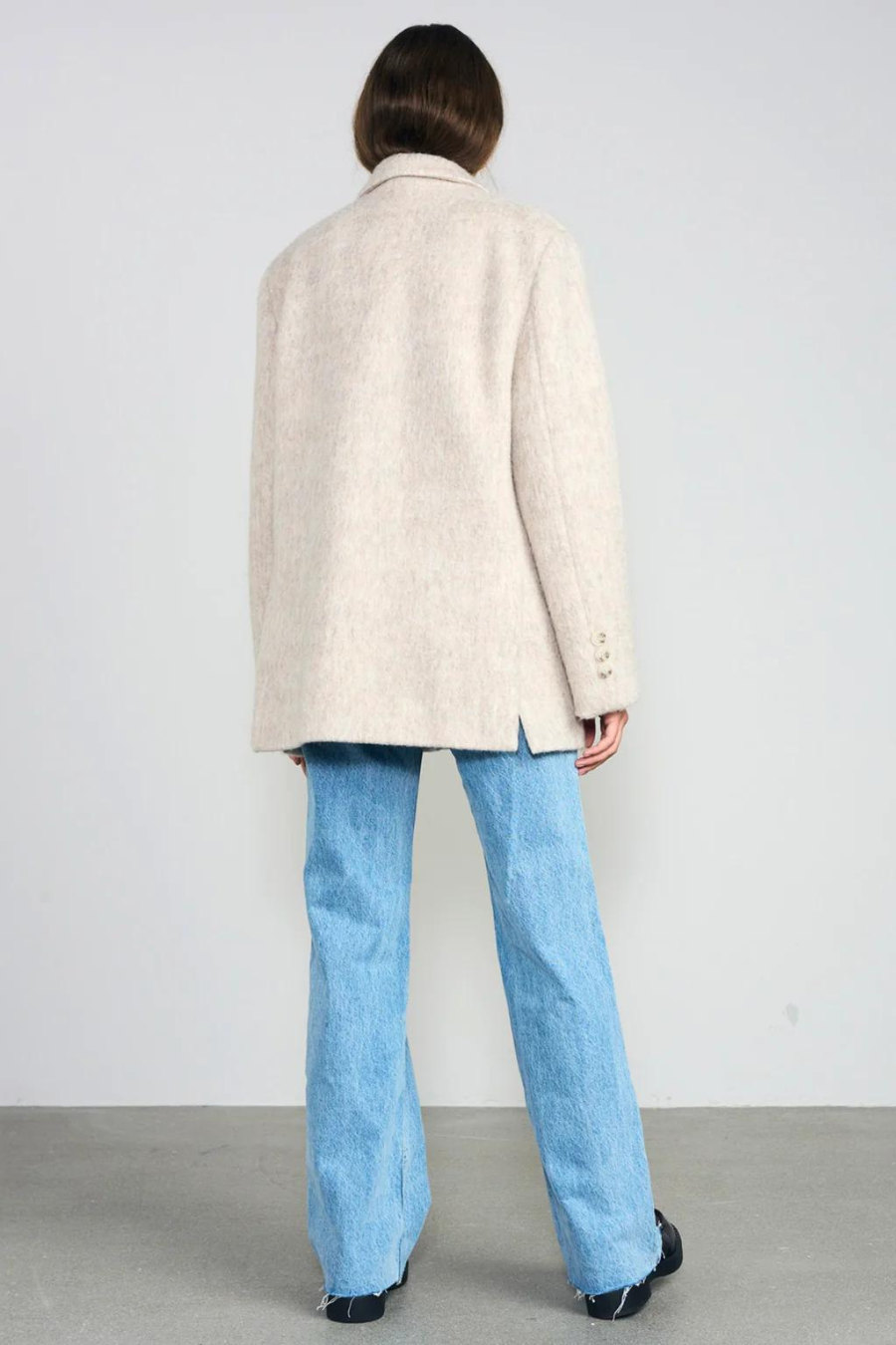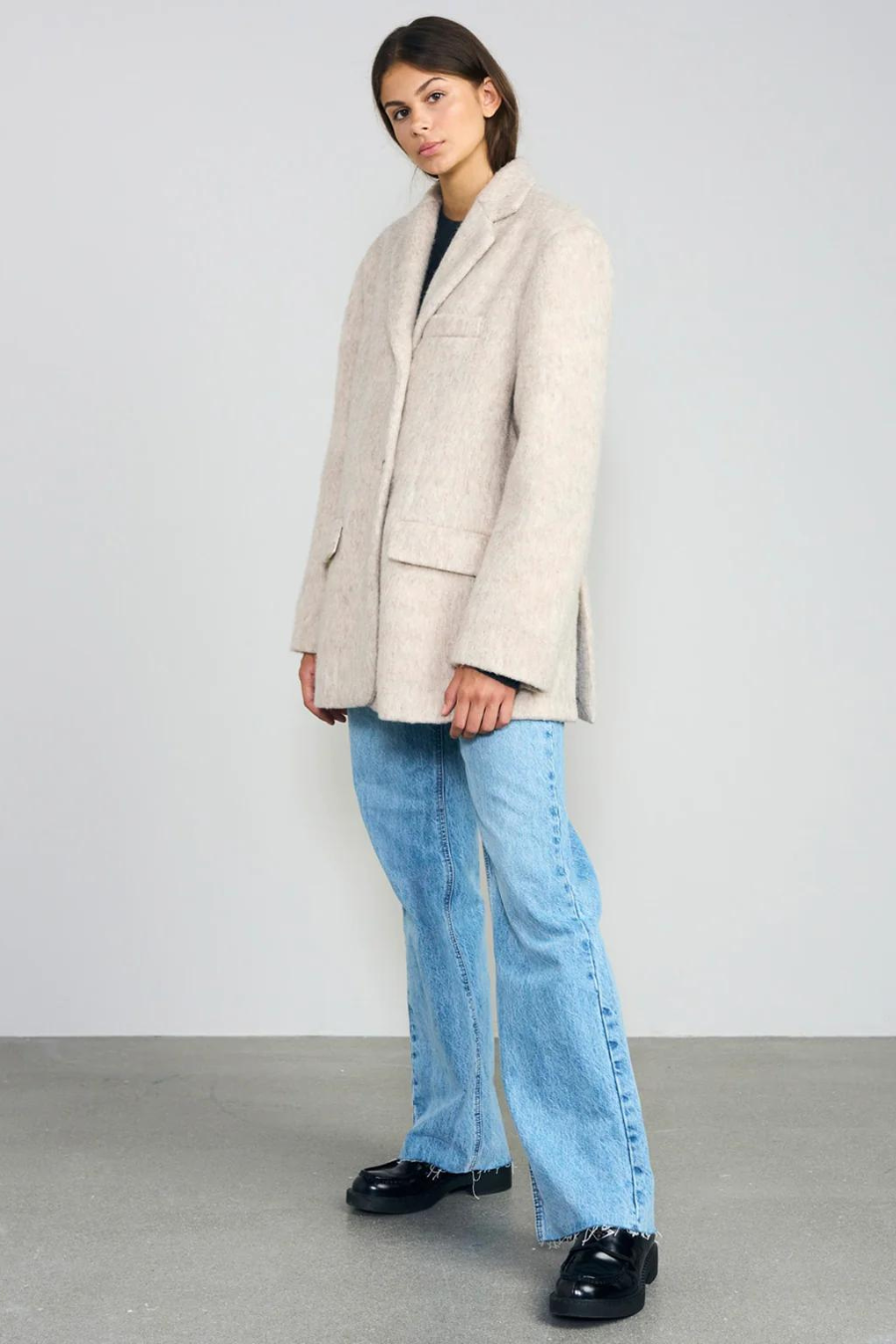 The Emily is a relaxed fit blazer cut from mohair wool. It is designed with a thin lining, sharp cut collars, button closure and two hidden front pockets.
