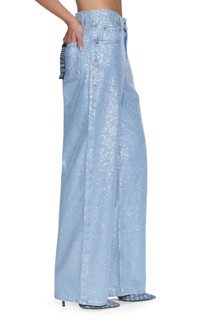 The Empire Jean High Rollers is a relaxed straight-leg, full-length jean with a true mid-rise. Made from premium European rigid denim in light blue with an enzyme-soft wash, it is densely embellished with all-over diamante hotfix crystals and features classic five-pocket styling, anti-silver branded hardware, T-box and 3x4 embroidery, and a removable pocket tag on the wearer's right back pocket.