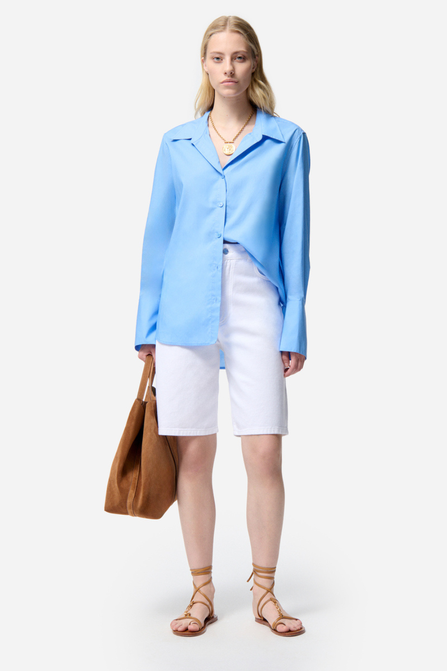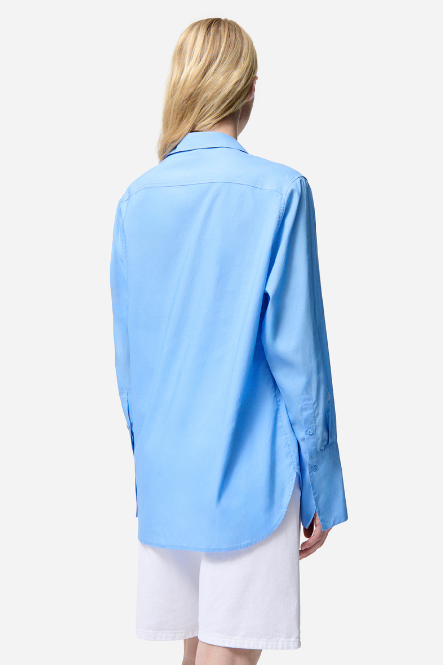 The classic cotton poplin shirt is revisited with elongated cuffs.