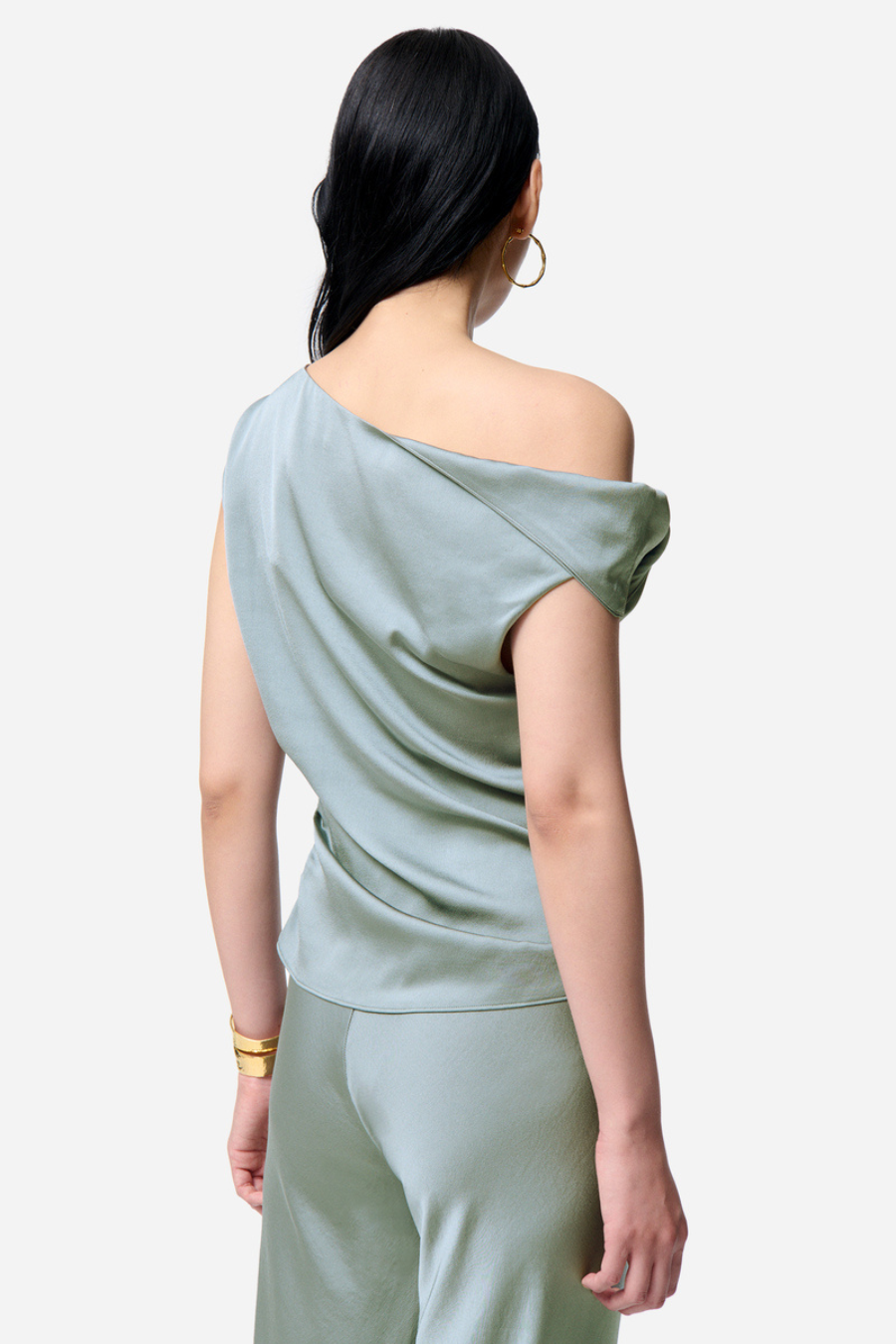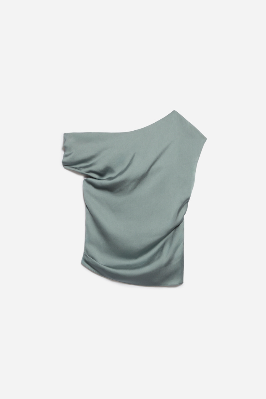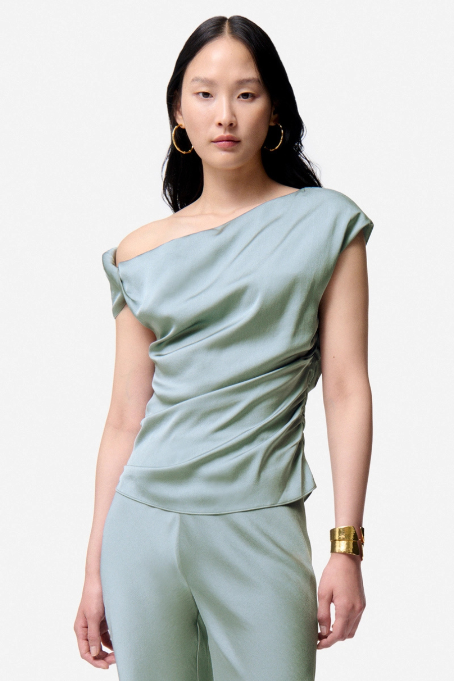 The asymmetrical Ezai top embodies modern elegance with its draped cut and bare shoulder. Crafted from a silky fabric with a flawless drape, it enhances the silhouette with subtle pleats that add movement. Its refined, contemporary look makes it a statement piece, ideal for a dressy outfit or a sophisticated daytime look. It can be worn tucked into flowing pants or over a fitted skirt for a chic effect.