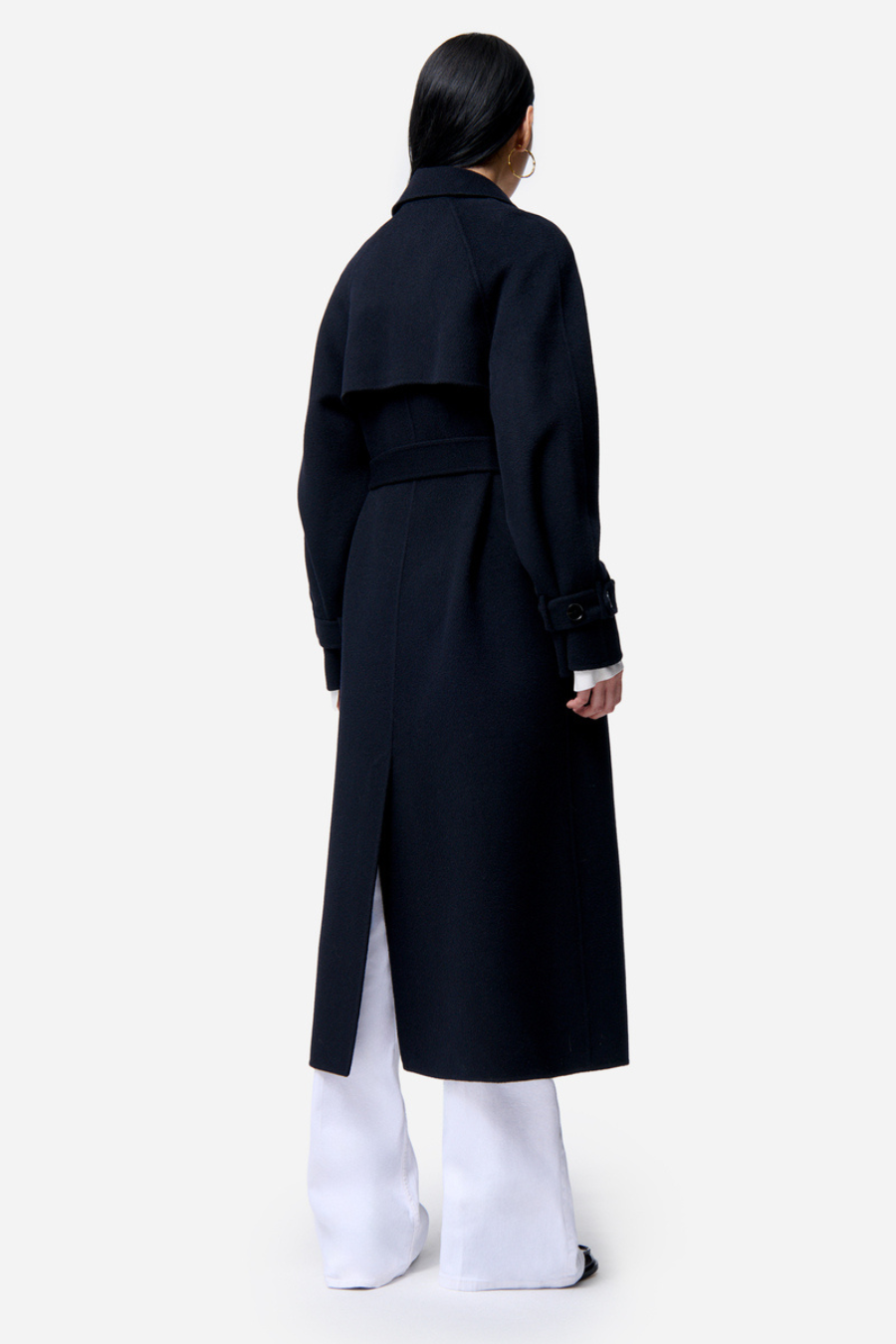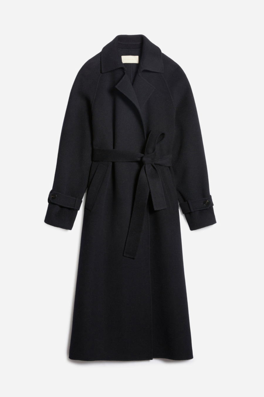 Timeless and tailored, the Faro Coat by Vanessa Bruno is an essential outerwear piece for the modern wardrobe. Crafted in a rich marine navy hue, this longline coat is cut from a premium wool blend for warmth, structure, and durability. Featuring a wrap-style silhouette with a self-tie belt, structured shoulders, and belted cuffs, it offers both elegance and everyday ease. Lined.
