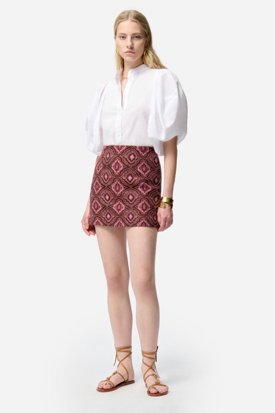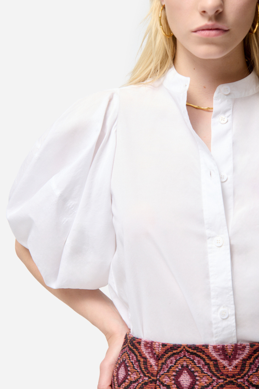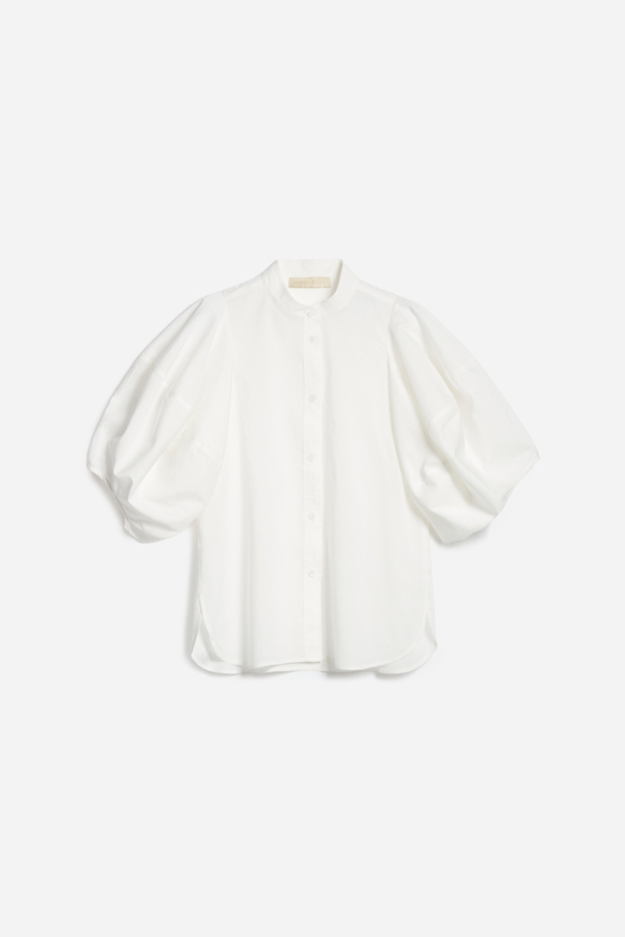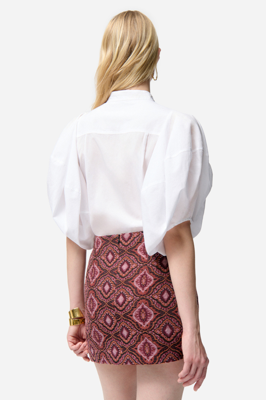 With its sculpted volumes and structured cut, this blouse revisits feminine style with a bold modern twist.