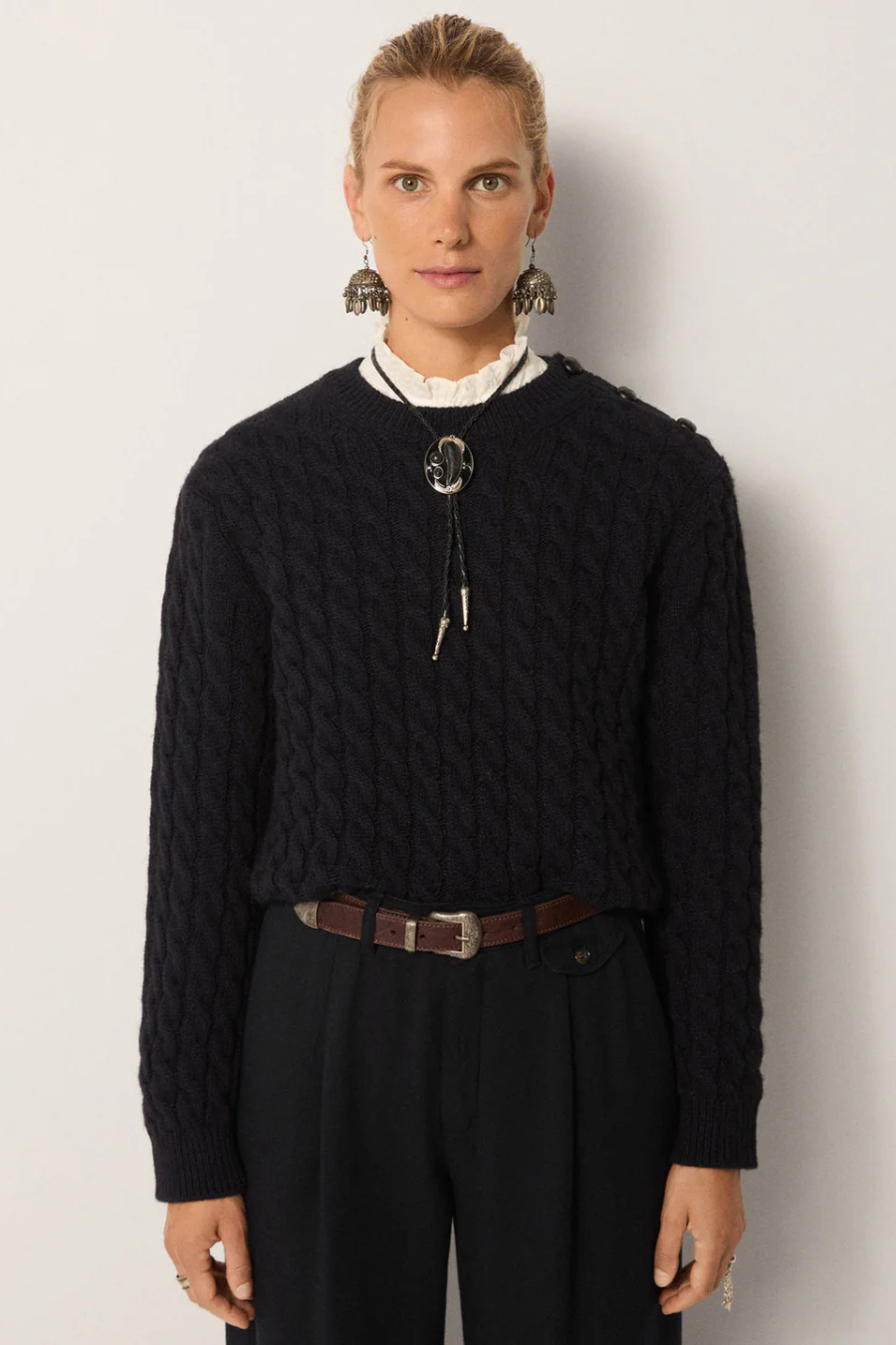 Its cable knit construction and shoulder button accents anchor the design in tradition while keeping it modern. The tone reads classic, restrained, and endlessly adaptable.