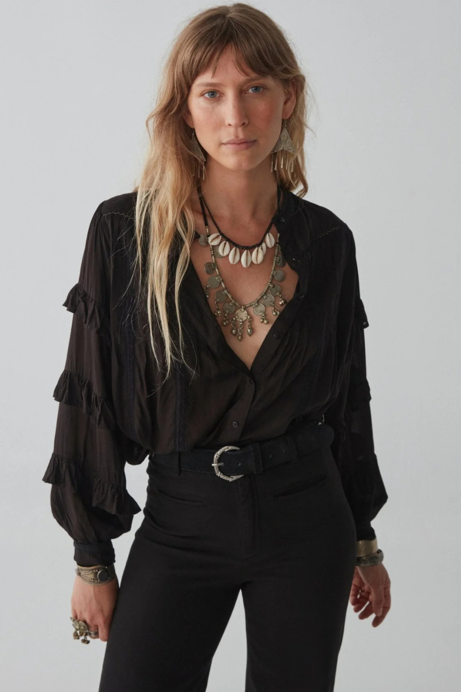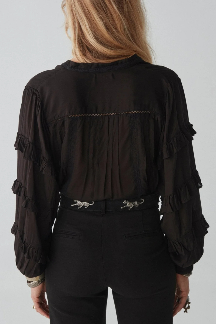 A whisper of dark romance, this blouse feels as full of mystery, passion, and intrigue. The cascading ruffles along the sleeves dance with every movement, while delicate pintucks add structure to the flowy silhouette. The deep, inky hue makes it a timeless piece, fit for both moonlit escapades and everyday adventures.