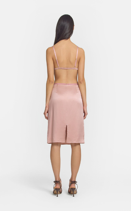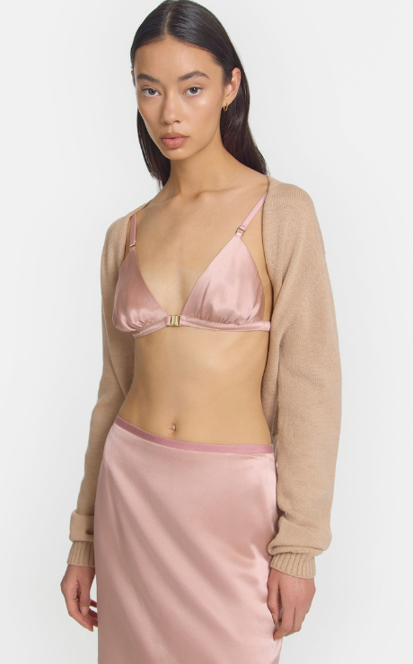 Crafted from luxurious silk, the Forecast Bra offers a sophisticated triangle bralette design. Enhanced with yellow gold hardware, it exudes refined elegance. With a wide gathered elastic casing under the bust for comfort and support, this piece is the perfect undergarment for sheer ensembles.