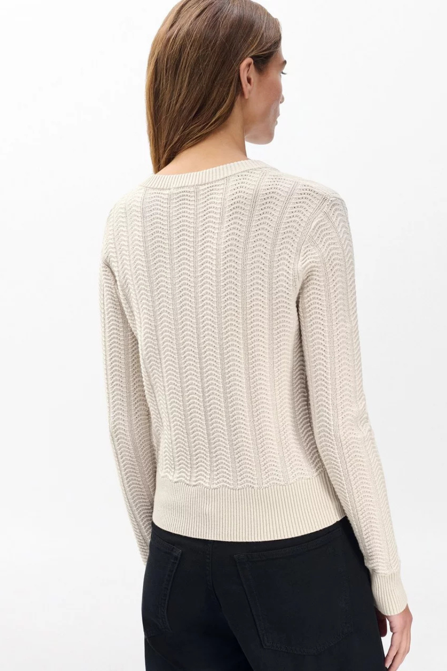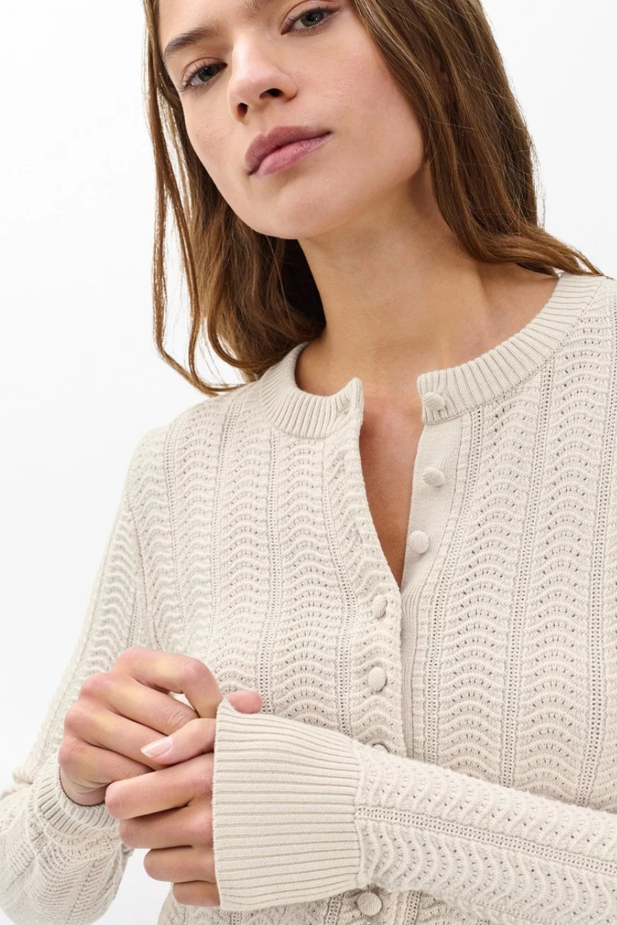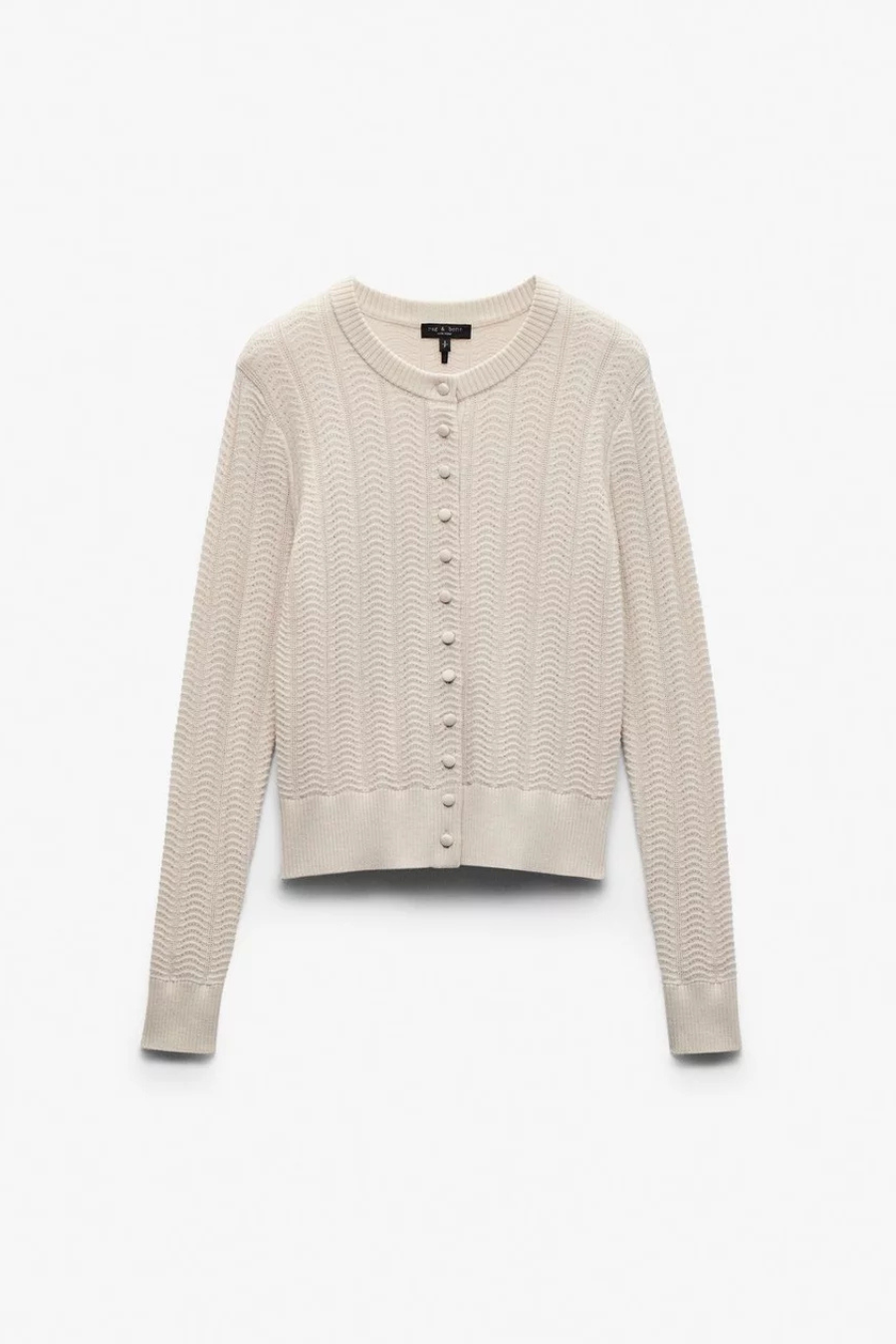 All about texture. This slim-fit cardigan sweater is knit from a merino wool blend with a feminine mix of wavy and slightly open-knit stitches. Tonal covered buttons keep the focus on the fabric, while its machine-washable design makes it low-maintenance. Whether worn alone or as a top layer, it brings depth to any outfit.