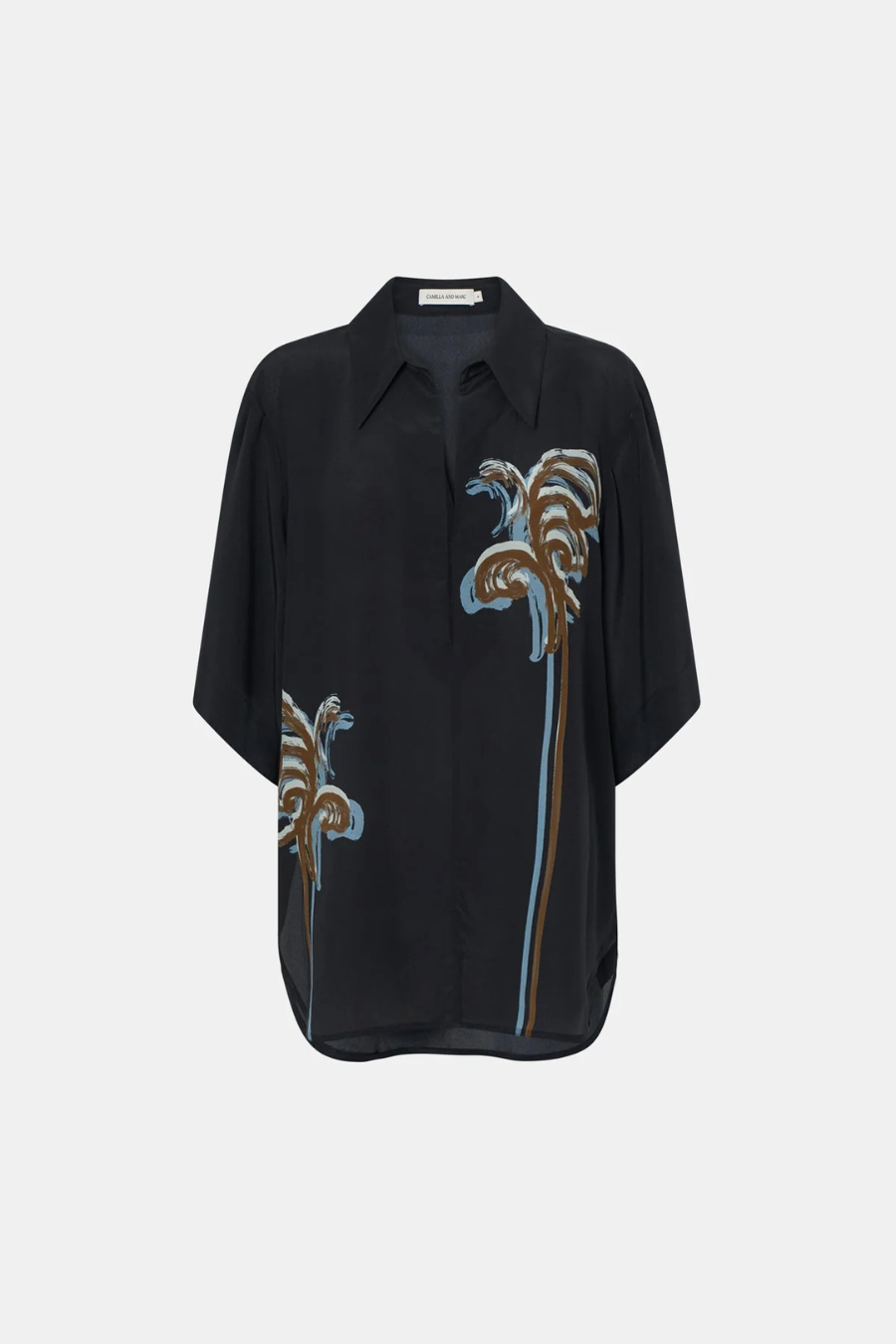 CAMILLA AND MARC Frida printed silk short-sleeve shirt with V-neckline. Boxy fit. Double hook-and-eye closure at centre front neckline. Side splits, curved hem.