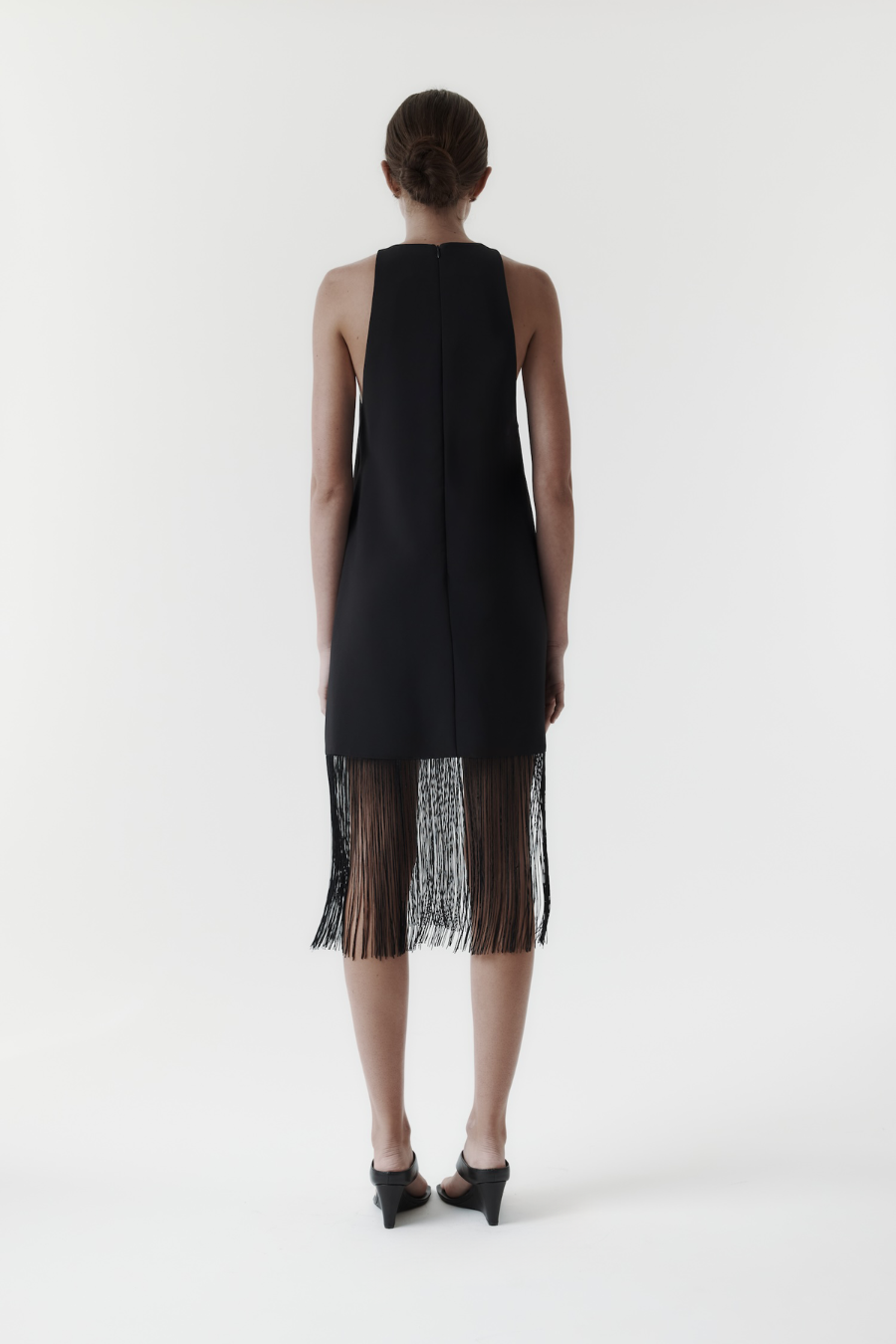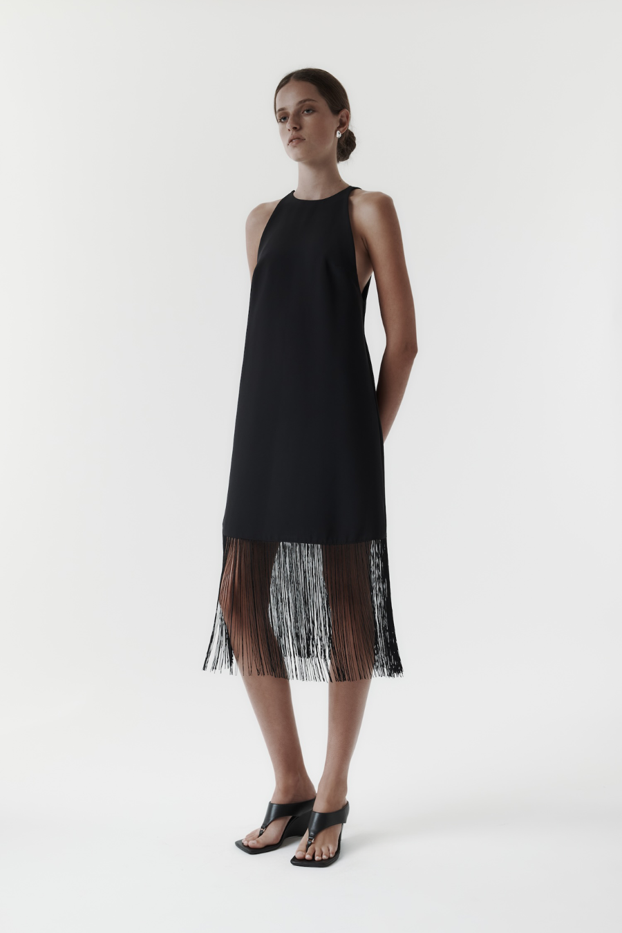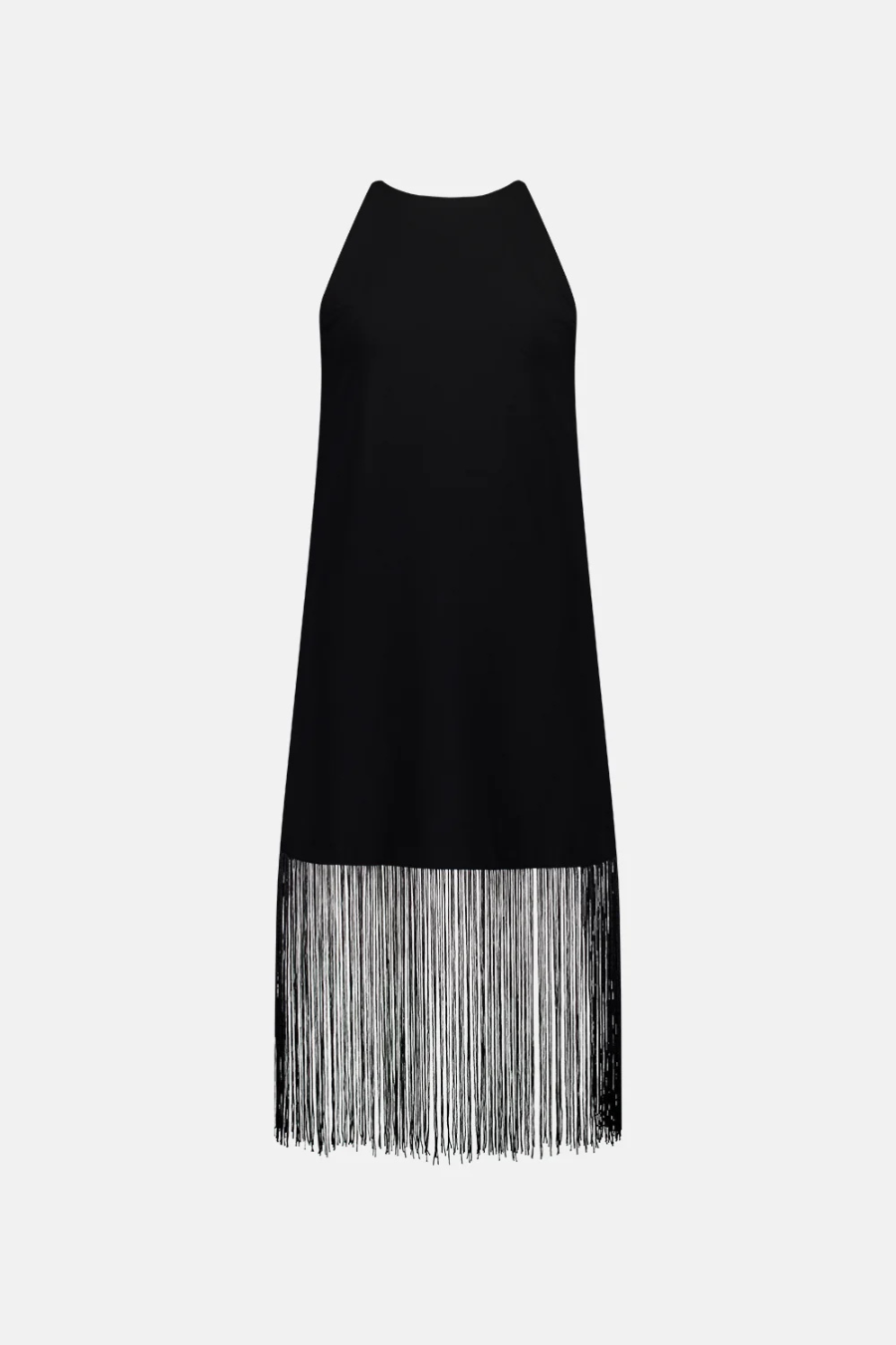 The Fringe Dress features a sleek A-line silhouette with a high halter neckline, finished with a fringe hem. Wear it on its own or layered over trousers for a signature REBE look.