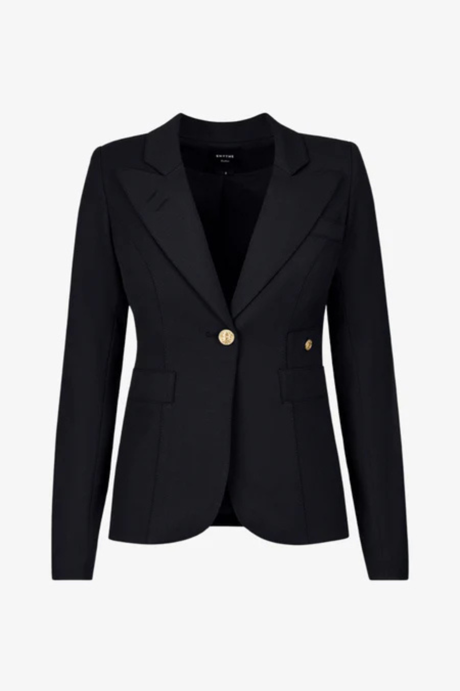 Precisely cut in a seasonless stretch viscose blend, this slim-fit blazer is designed for year-round wear. The single-breasted cutaway silhouette creates a nipped-in waist, while the back features a classic double back vent. Signature brass buttons make it undeniably SMYTHE. Curvy figures may wish to go up a size.