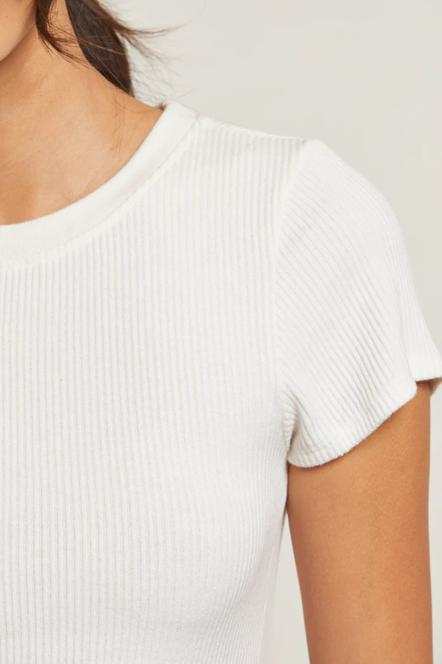 the gabby is your favorite baby tee—just grown up a bit. made in our signature soft sweater rib, she’s fitted through the body with short sleeves and a classic crew neckline. full-length and designed for that in-between-season sweet spot.